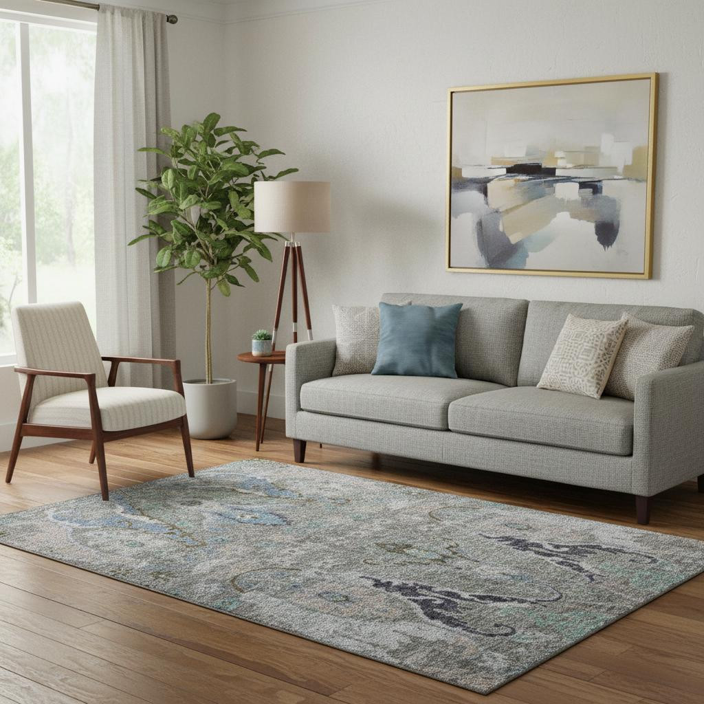 Set an inviting tone in your space with this 5-foot x 8-foot pewter blue and gray floral washable area rug with uv protection. Ideal for spaces with kids and pets, this rug is stain resistant to help repel dirt and spilled liquids. Built to last, this rug crafted from polyester fibers is known for its durability and long lasting appeal. Rugs are a great way to showcase your style, hide imperfections, warm your home and reduce noise. This larger sized, transitional styled rug is ready to create a focal point or statement piece in your room. 60.00-inch h x 90.00-inch w x 0.39-inch d.