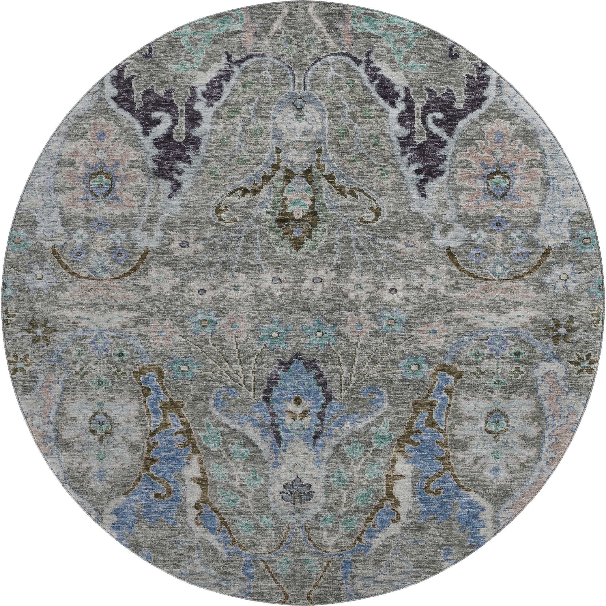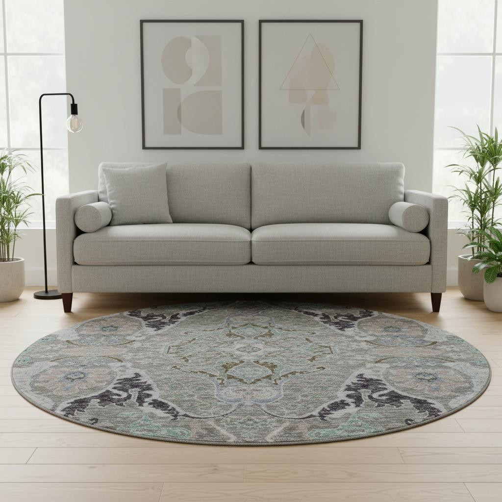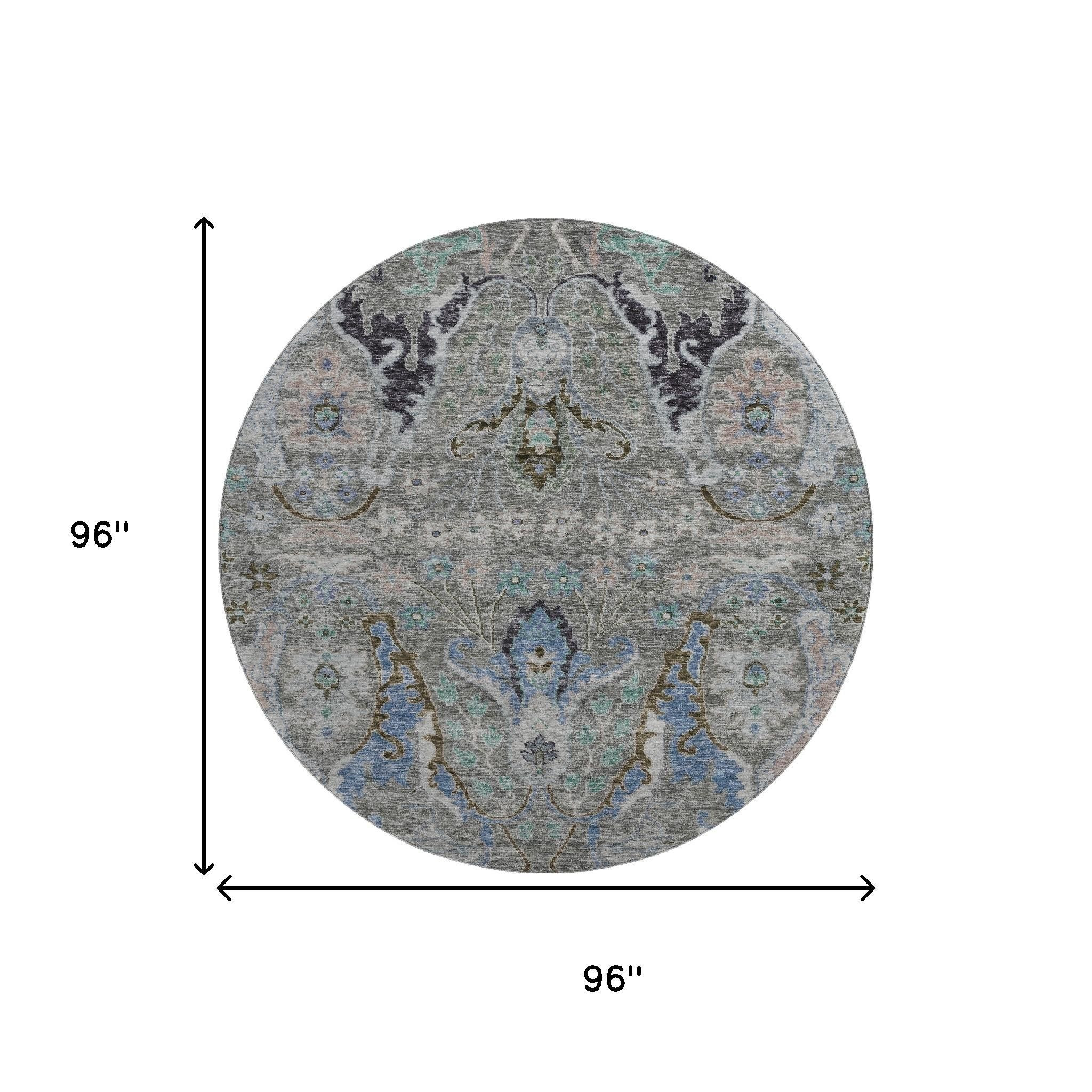 Set an inviting tone in your space with this 8-foot pewter blue and gray floral washable round rug with uv protection. Ideal for spaces with kids and pets, this rug is stain resistant to help repel dirt and spilled liquids. Built to last, this rug crafted from polyester fibers is known for its durability and long lasting appeal. Rugs are a great way to showcase your style, hide imperfections, warm your home and reduce noise. This larger sized, transitional styled rug is ready to create a focal point or statement piece in your room. 96.00-inch h x 96.00-inch w x 0.39-inch d.