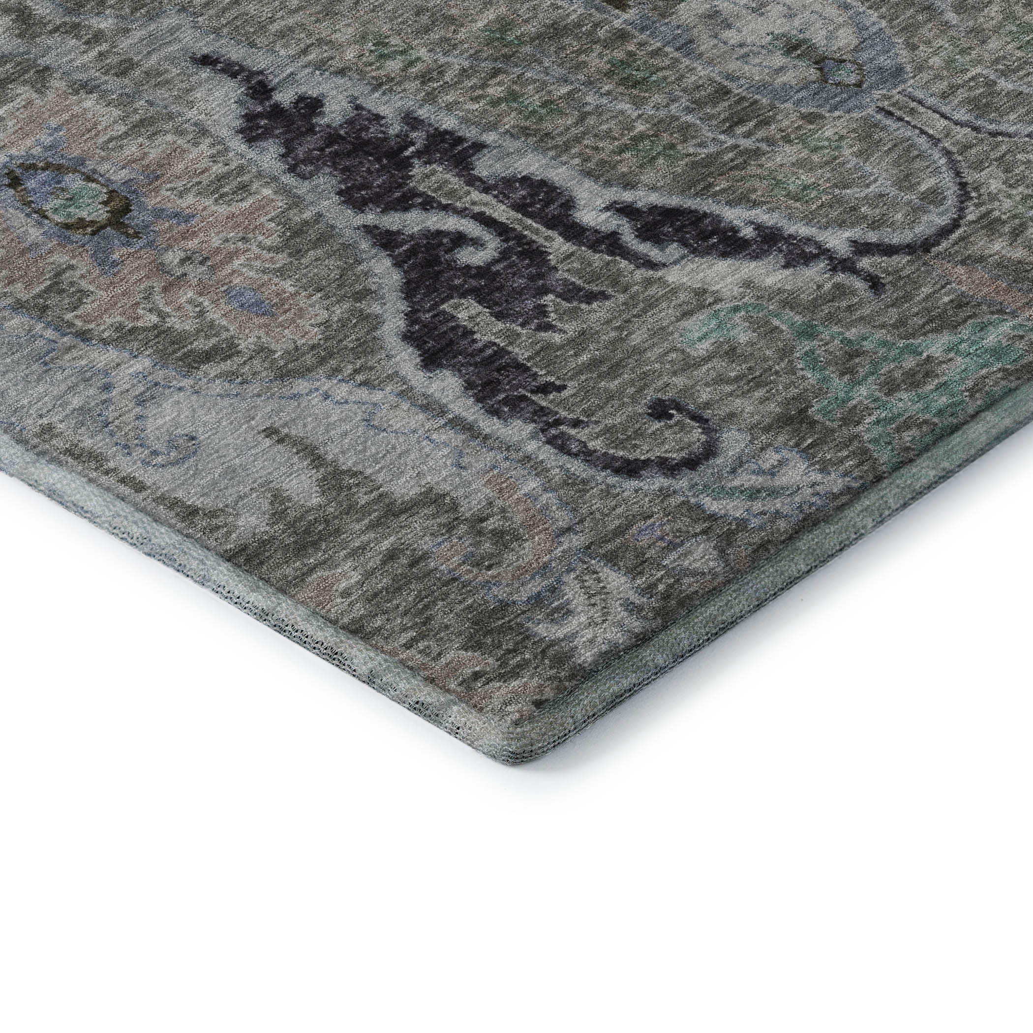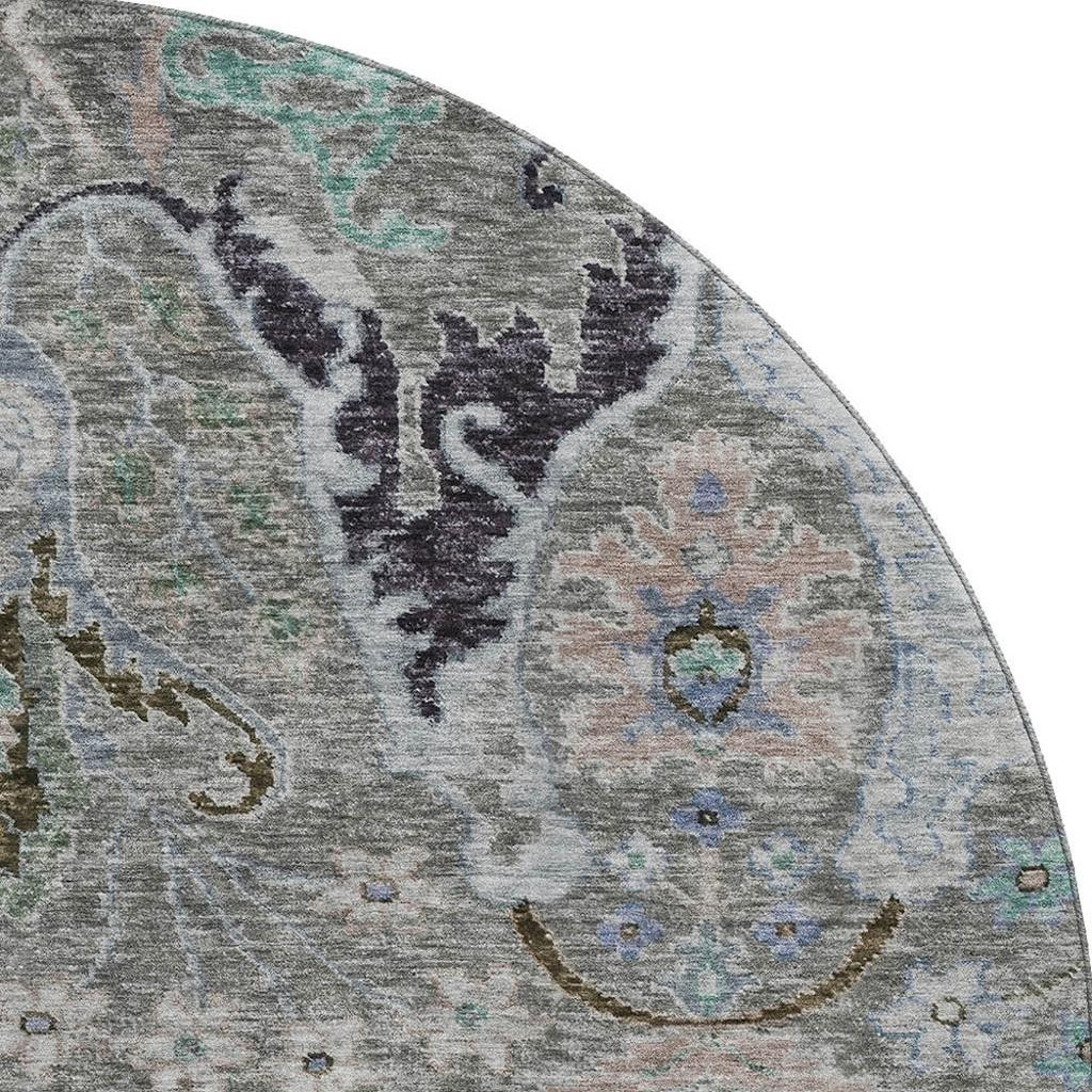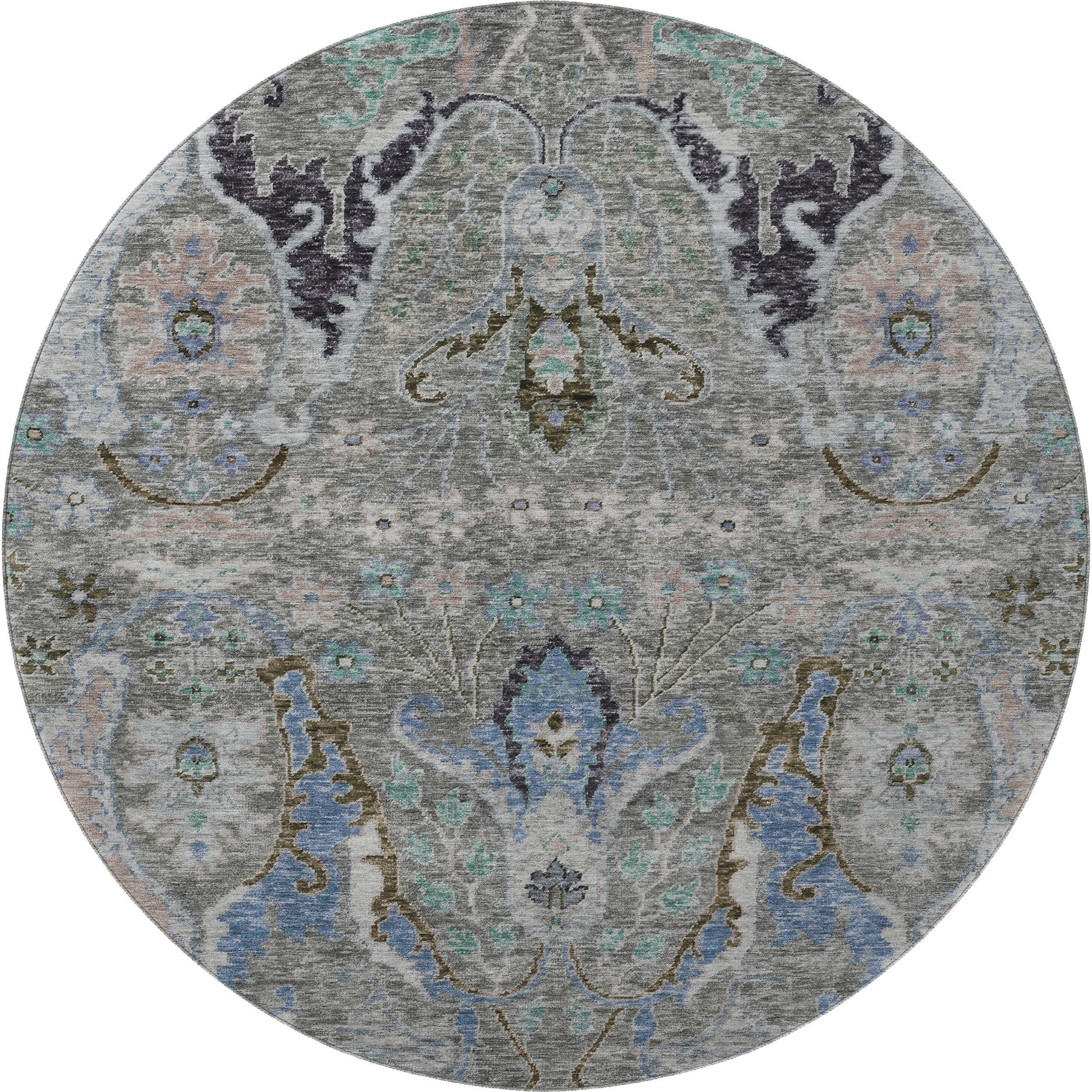 Set an inviting tone in your space with this 8-foot pewter blue and gray floral washable round rug with uv protection. Ideal for spaces with kids and pets, this rug is stain resistant to help repel dirt and spilled liquids. Built to last, this rug crafted from polyester fibers is known for its durability and long lasting appeal. Rugs are a great way to showcase your style, hide imperfections, warm your home and reduce noise. This larger sized, transitional styled rug is ready to create a focal point or statement piece in your room. 96.00-inch h x 96.00-inch w x 0.39-inch d.