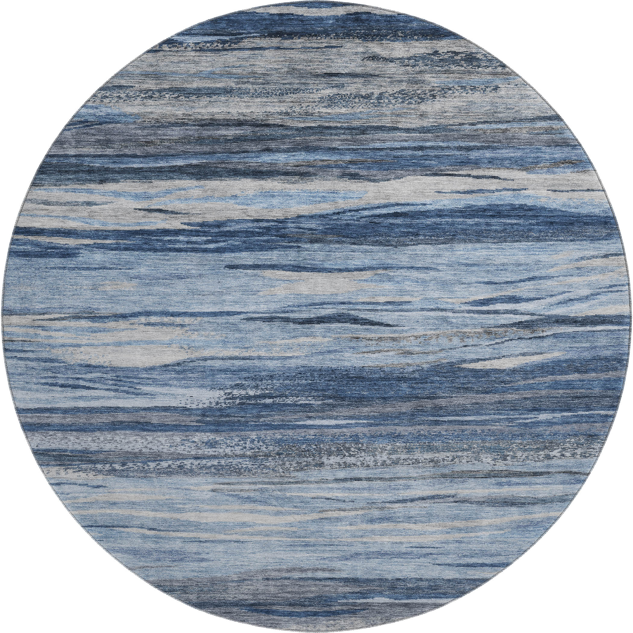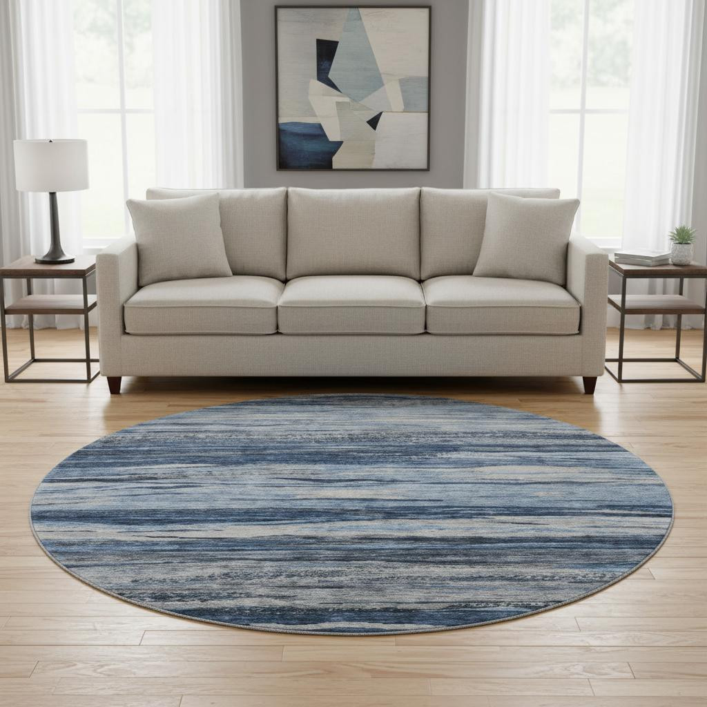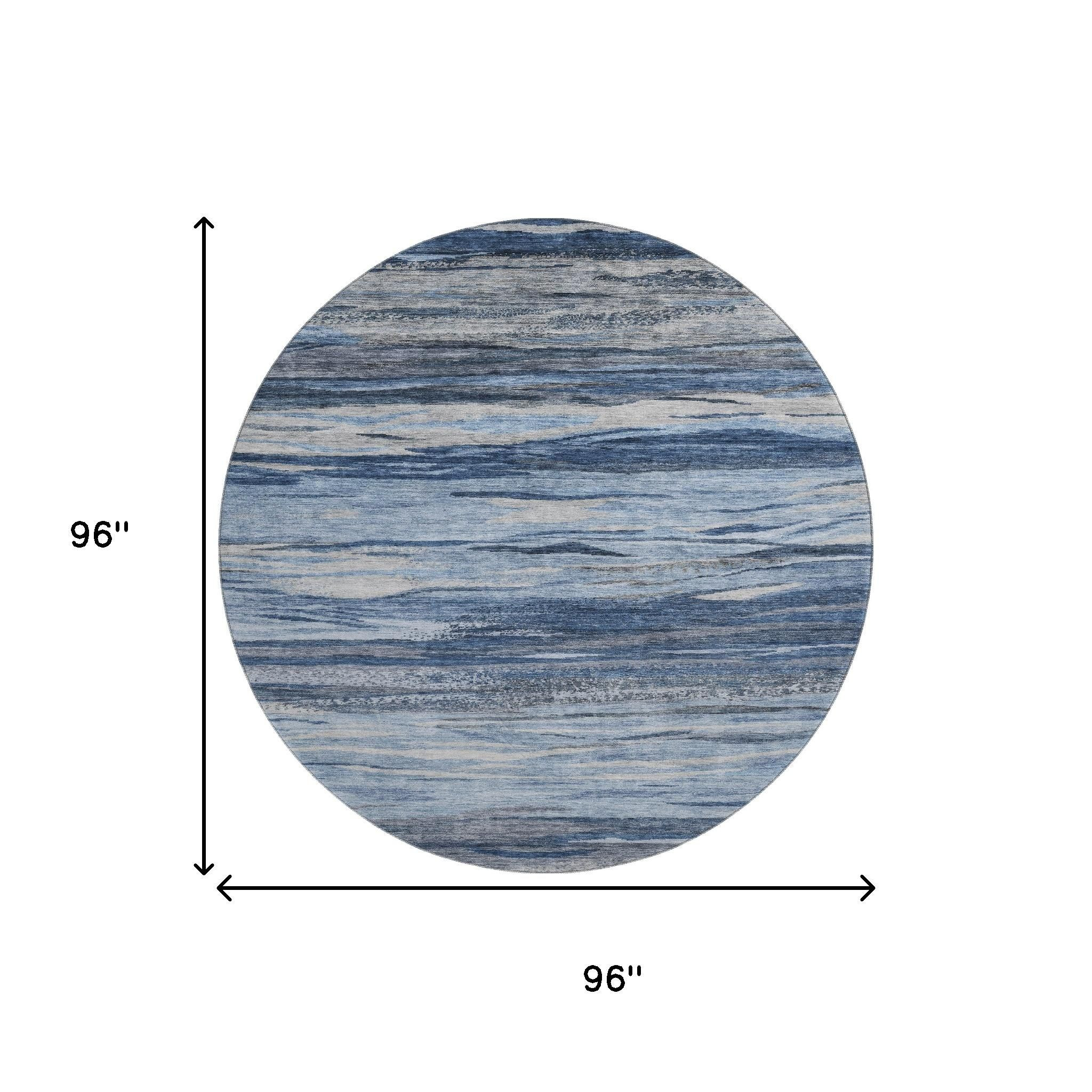 Add great coloration and comfortable texture to your space with this 8-foot blue gray and silver abstract washable round rug with uv protection. Ideal for spaces with kids and pets, this rug is stain resistant to help repel dirt and spilled liquids. Built to last, this rug crafted from polyester fibers is known for its durability and long lasting appeal. Rugs are a great way to showcase your style, hide imperfections, warm your home and reduce noise. This larger sized, transitional styled rug is ready to create a focal point or statement piece in your room. 96.00-inch h x 96.00-inch w x 0.39-inch d.