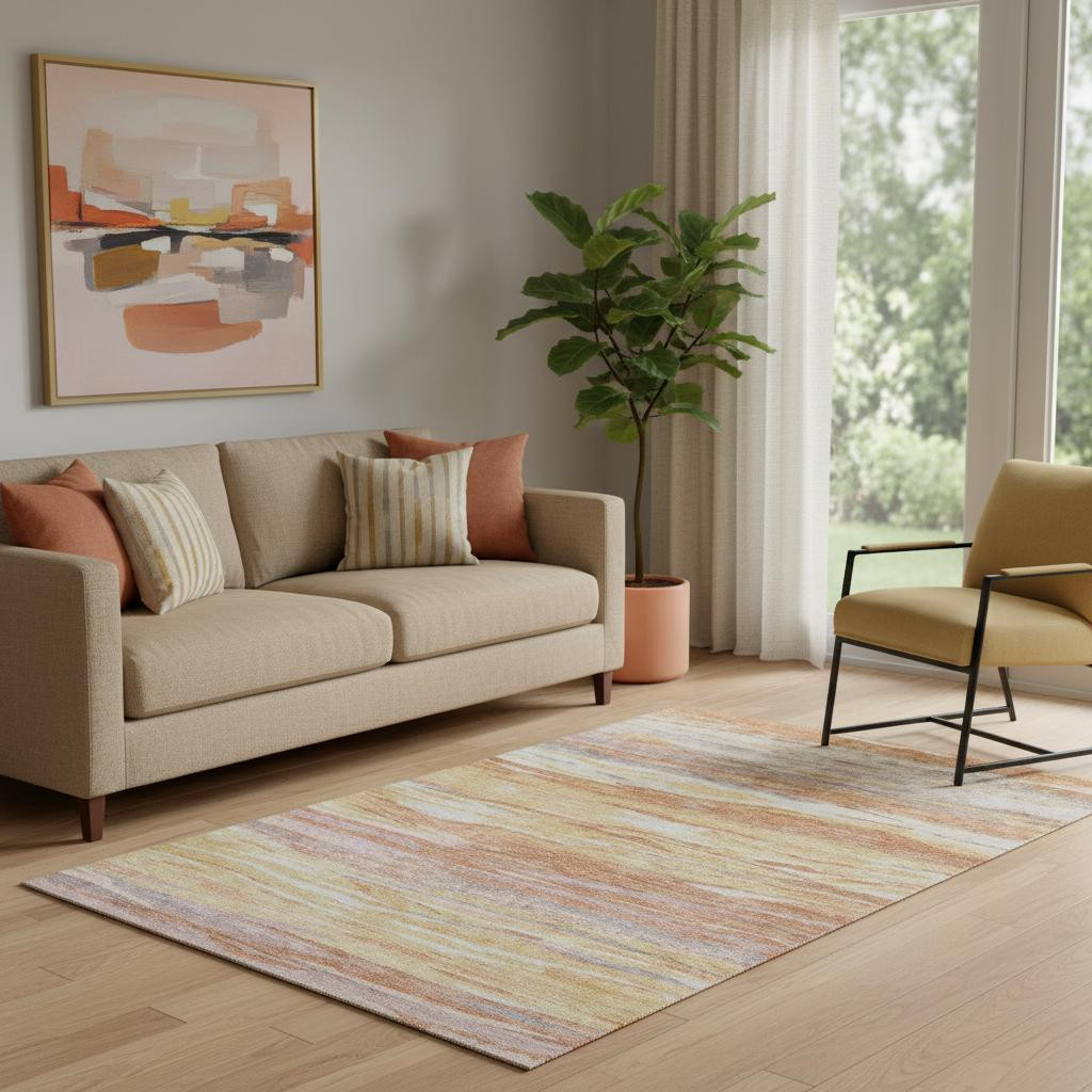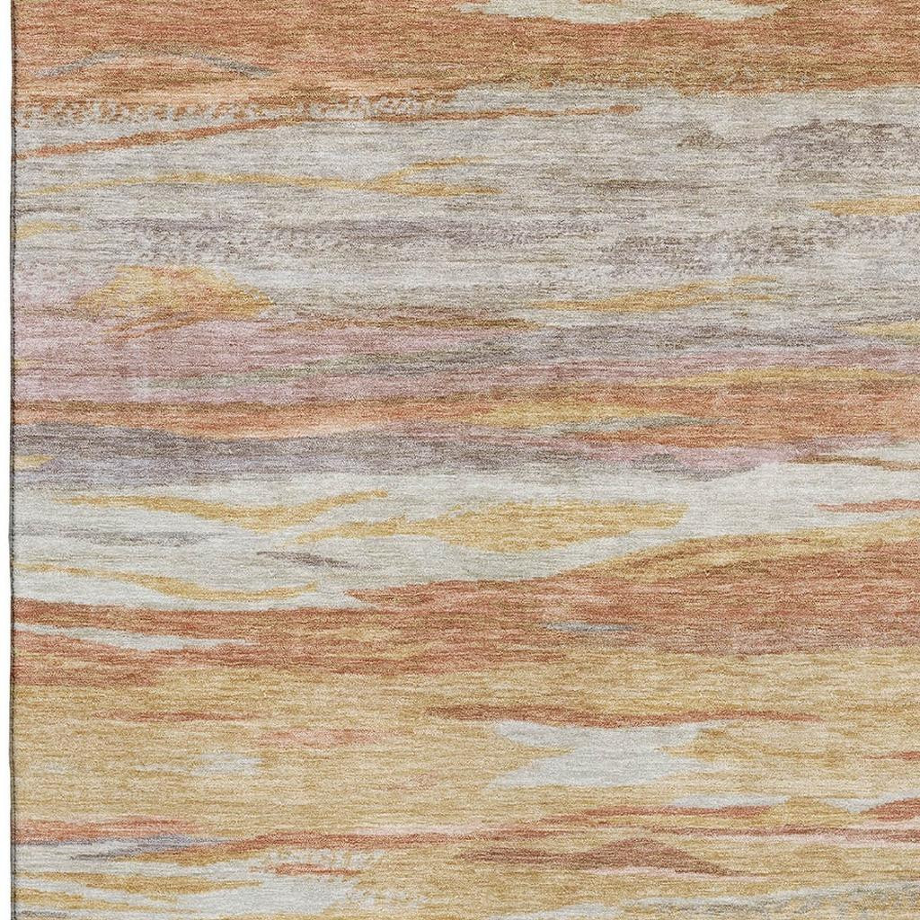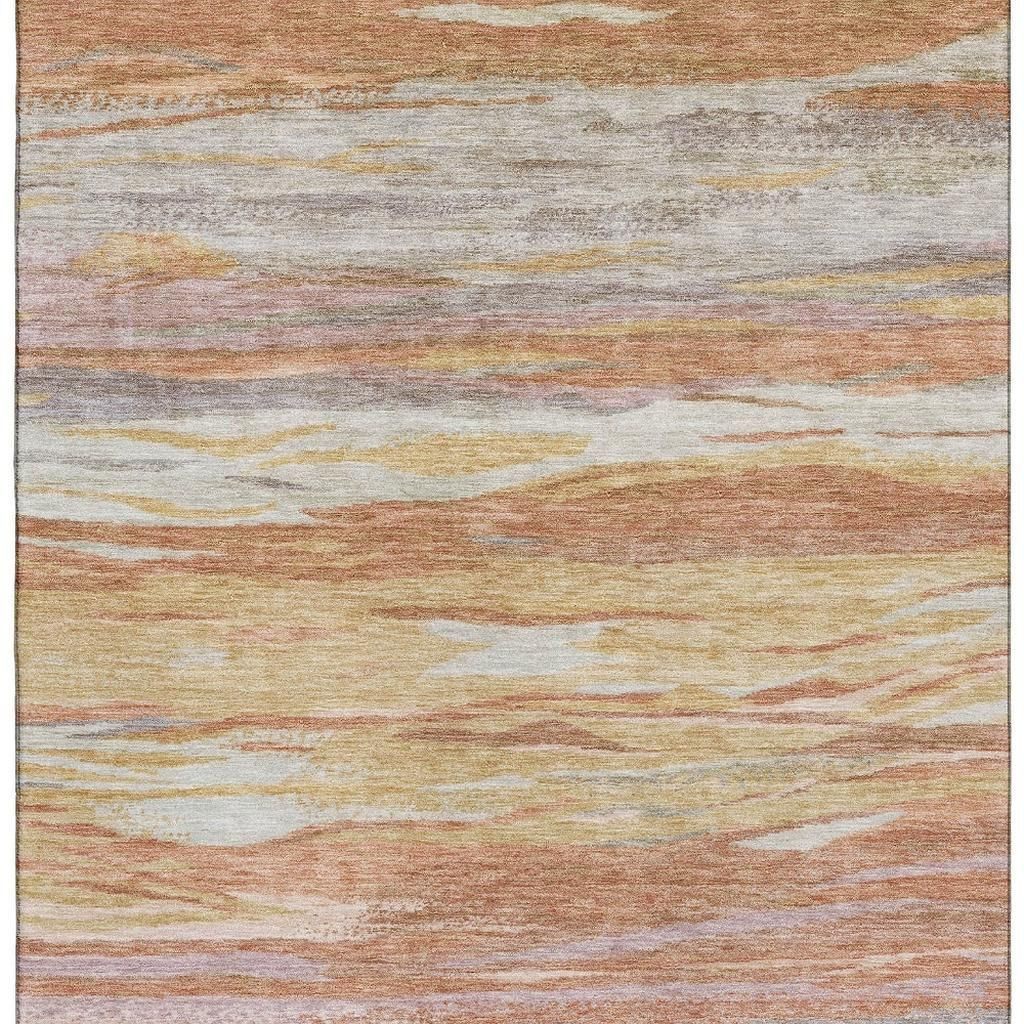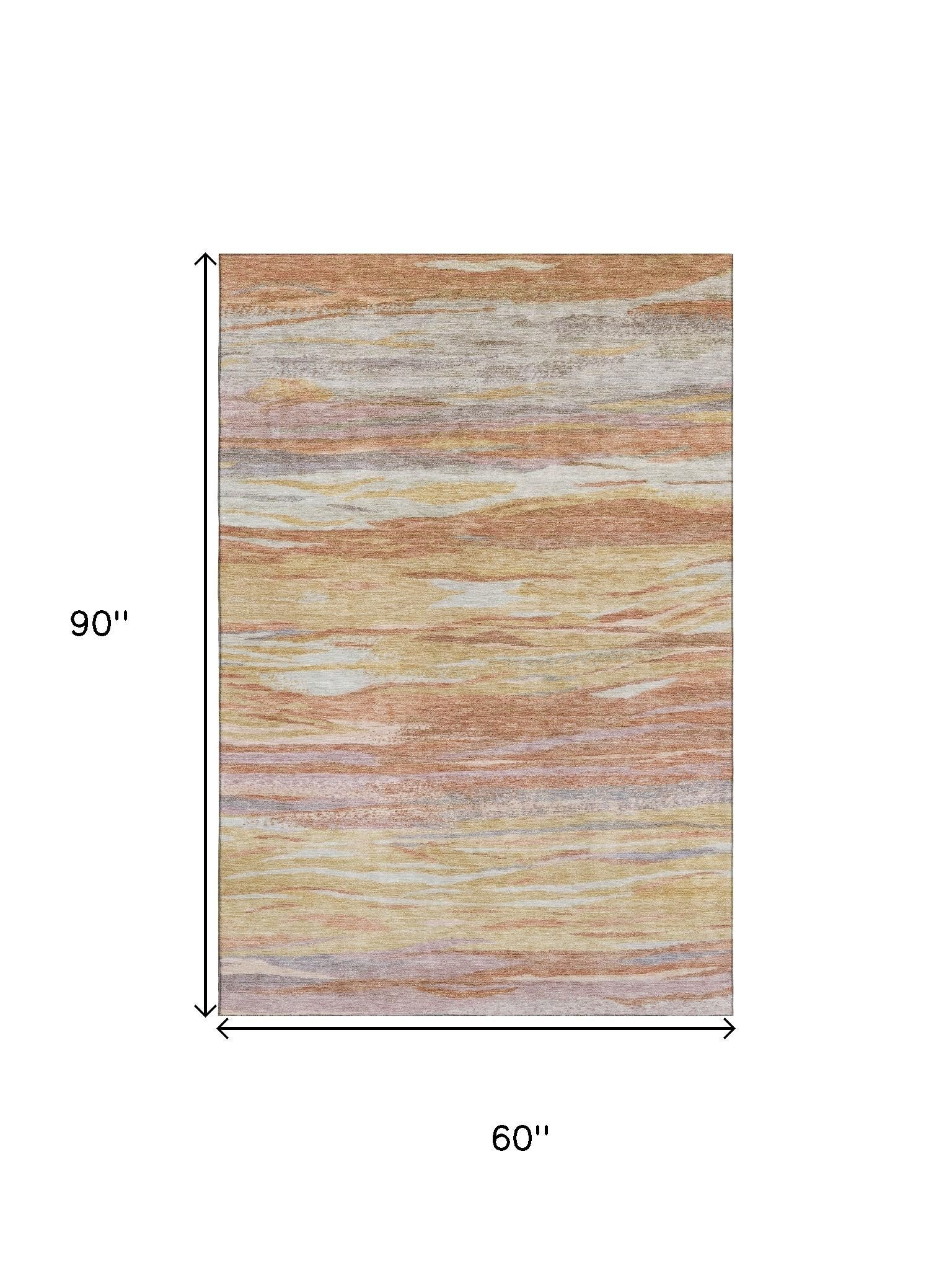 Set an inviting tone in your space with this 5-foot x 8-foot salmon gold and gray abstract washable area rug with uv protection. Ideal for spaces with kids and pets, this rug is stain resistant to help repel dirt and spilled liquids. Built to last, this rug crafted from polyester fibers is known for its durability and long lasting appeal. Rugs are a great way to showcase your style, hide imperfections, warm your home and reduce noise. This larger sized, transitional styled rug is ready to create a focal point or statement piece in your room. 60.00-inch h x 90.00-inch w x 0.39-inch d.