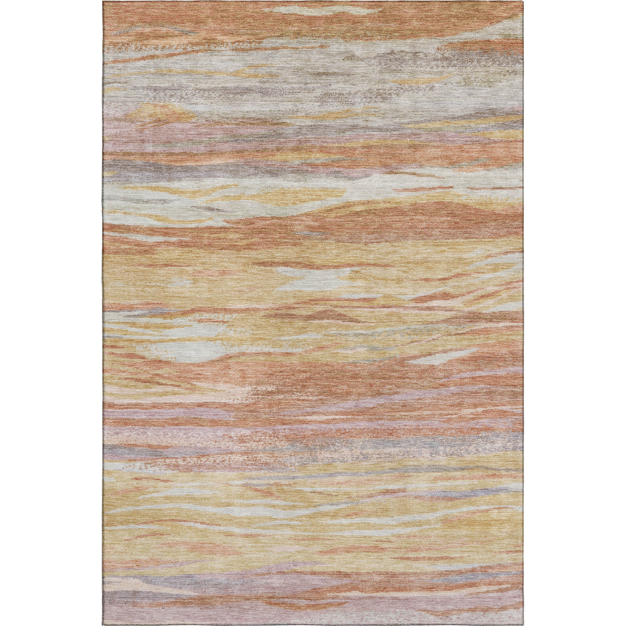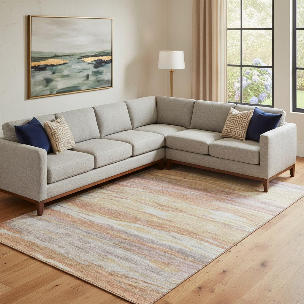 Add some artistry to your room with this 9-foot x 12-foot salmon gold and gray abstract washable area rug with uv protection. Ideal for spaces with kids and pets, this rug is stain resistant to help repel dirt and spilled liquids. Built to last, this rug crafted from polyester fibers is known for its durability and long lasting appeal. Rugs are a great way to showcase your style, hide imperfections, warm your home and reduce noise. This larger sized, transitional styled rug is ready to create a focal point or statement piece in your room. 108.00-inch h x 144.00-inch w x 0.39-inch d.