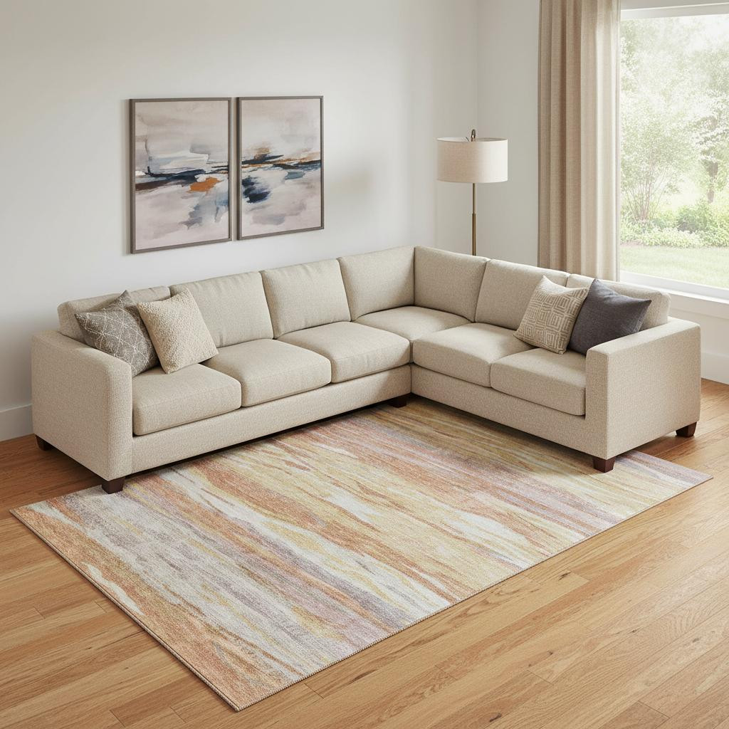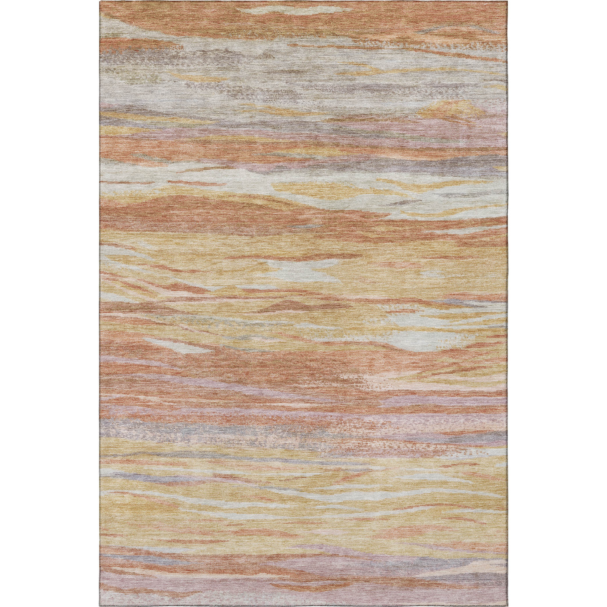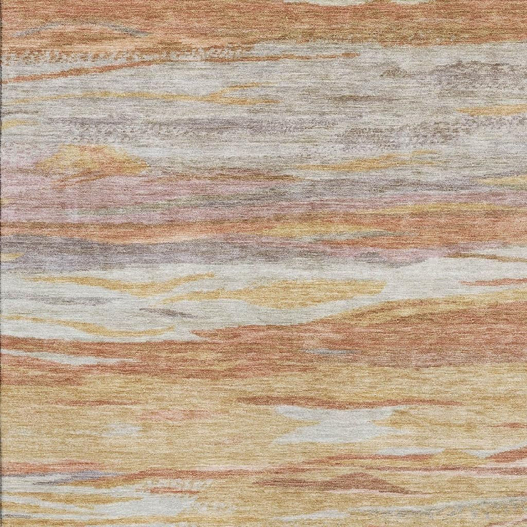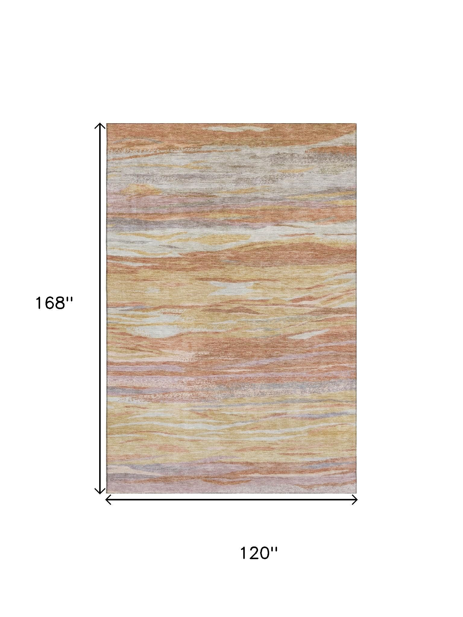 Add great coloration and comfortable texture to your space with this 10-foot x 14-foot salmon gold and gray abstract washable area rug with uv protection. Ideal for spaces with kids and pets, this rug is stain resistant to help repel dirt and spilled liquids. Built to last, this rug crafted from polyester fibers is known for its durability and long lasting appeal. Rugs are a great way to showcase your style, hide imperfections, warm your home and reduce noise. This larger sized, transitional styled rug is ready to create a focal point or statement piece in your room. 120.00-inch h x 168.00-inch w x 0.39-inch d.