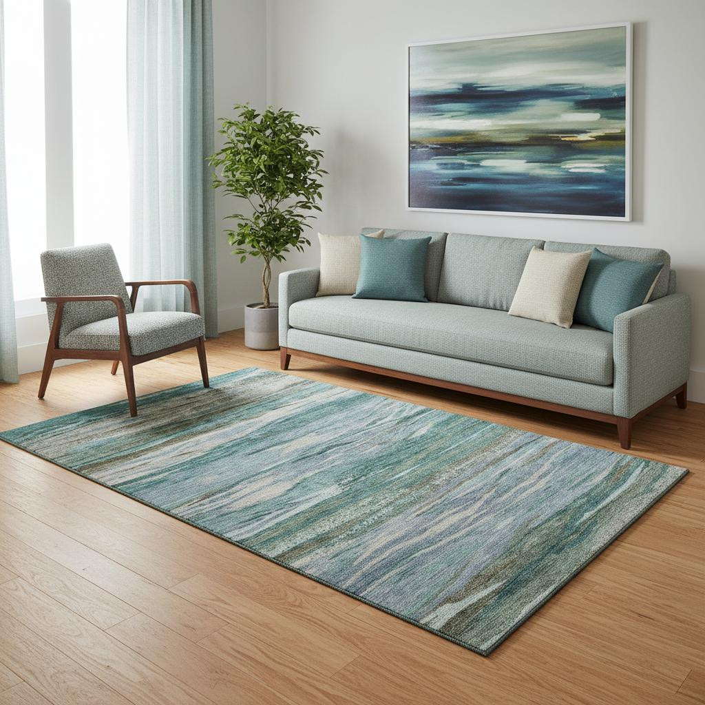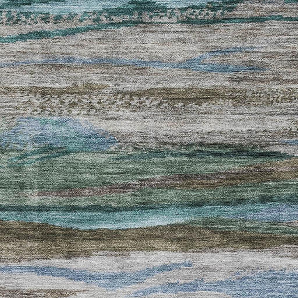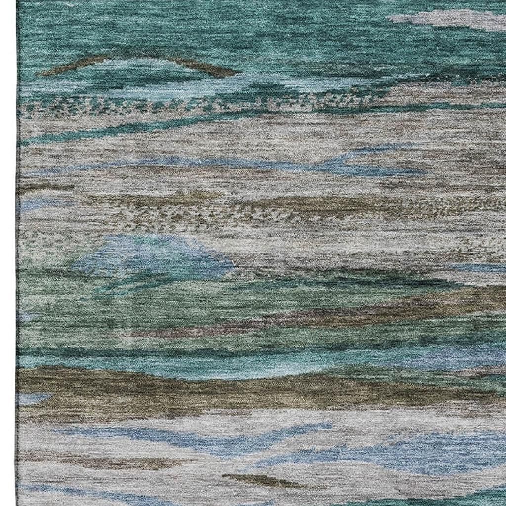 This 5-foot x 8-foot teal khaki and green abstract washable area rug with uv protection, is a great way to add warmth to a room. Ideal for spaces with kids and pets, this rug is stain resistant to help repel dirt and spilled liquids. Built to last, this rug crafted from polyester fibers is known for its durability and long lasting appeal. Rugs are a great way to showcase your style, hide imperfections, warm your home and reduce noise. This larger sized, transitional styled rug is ready to create a focal point or statement piece in your room. 60.00-inch h x 90.00-inch w x 0.39-inch d.