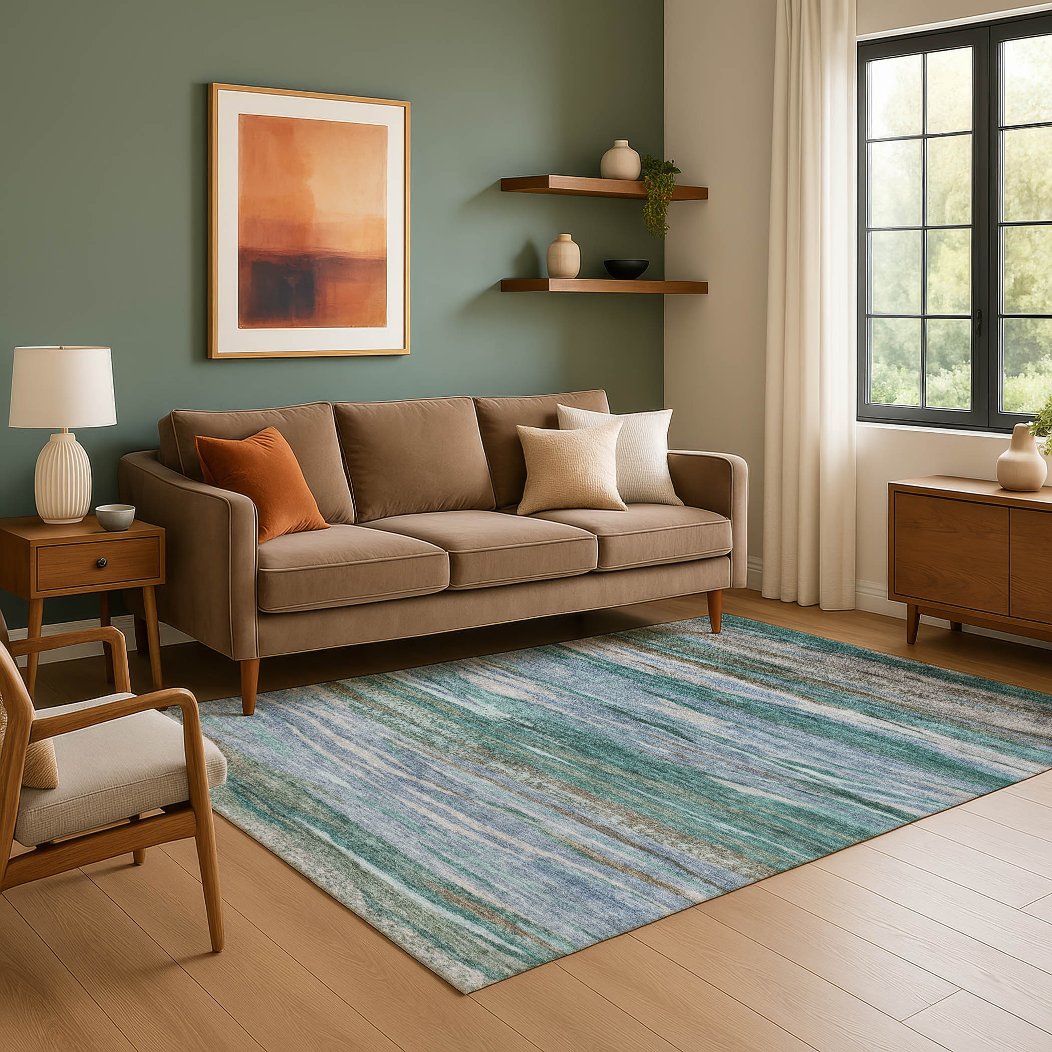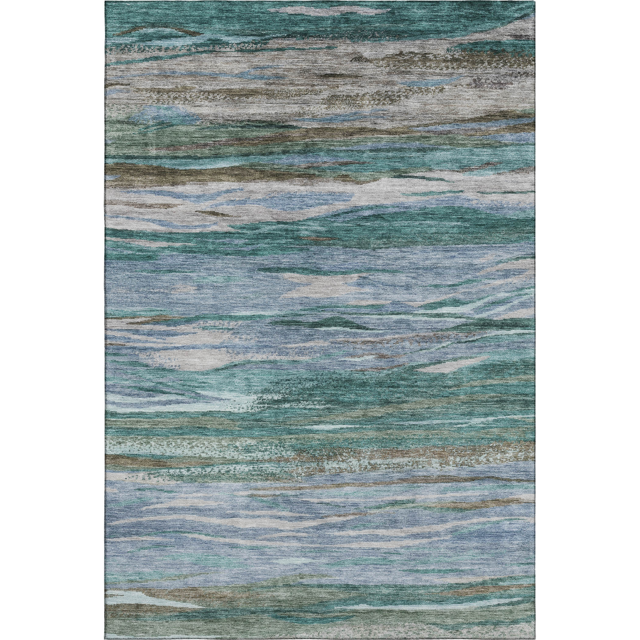 Set an inviting tone in your space with this 9-foot x 12-foot teal khaki and green abstract washable area rug with uv protection. Ideal for spaces with kids and pets, this rug is stain resistant to help repel dirt and spilled liquids. Built to last, this rug crafted from polyester fibers is known for its durability and long lasting appeal. Rugs are a great way to showcase your style, hide imperfections, warm your home and reduce noise. This larger sized, transitional styled rug is ready to create a focal point or statement piece in your room. 108.00-inch h x 144.00-inch w x 0.39-inch d.