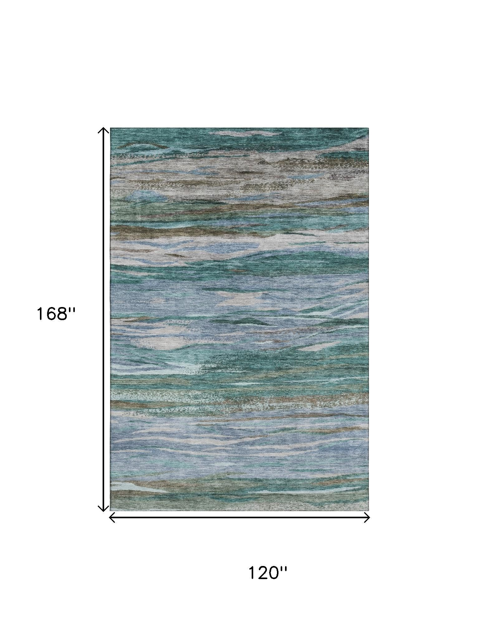 Add some artistry to your room with this 10-foot x 14-foot teal khaki and green abstract washable area rug with uv protection. Ideal for spaces with kids and pets, this rug is stain resistant to help repel dirt and spilled liquids. Built to last, this rug crafted from polyester fibers is known for its durability and long lasting appeal. Rugs are a great way to showcase your style, hide imperfections, warm your home and reduce noise. This larger sized, transitional styled rug is ready to create a focal point or statement piece in your room. 120.00-inch h x 168.00-inch w x 0.39-inch d.