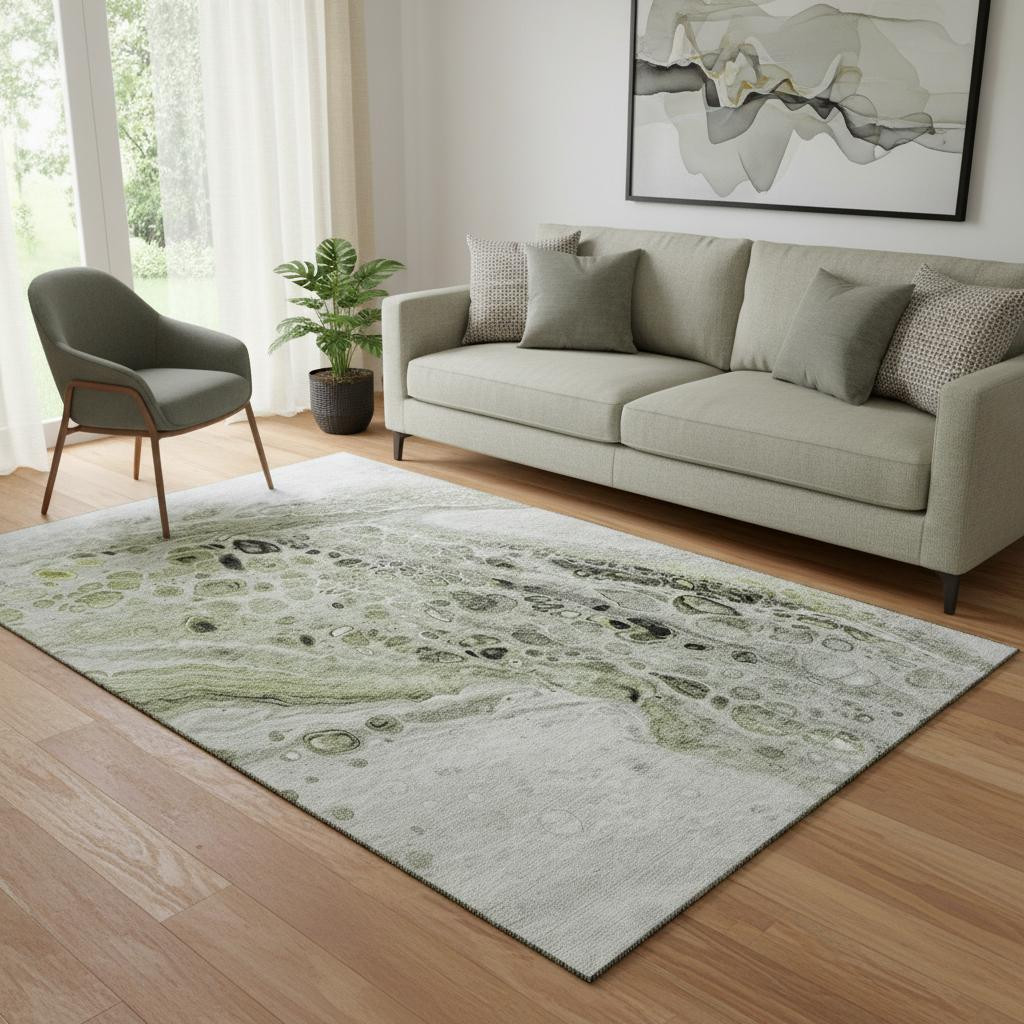 Add some artistry to your room with this 5-foot x 8-foot artichoke green gray and silver abstract washable area rug with uv protection. Ideal for spaces with kids and pets, this rug is stain resistant to help repel dirt and spilled liquids. Built to last, this rug crafted from polyester fibers is known for its durability and long lasting appeal. Rugs are a great way to showcase your style, hide imperfections, warm your home and reduce noise. This larger sized, transitional styled rug is ready to create a focal point or statement piece in your room. 60.00-inch h x 90.00-inch w x 0.39-inch d.
