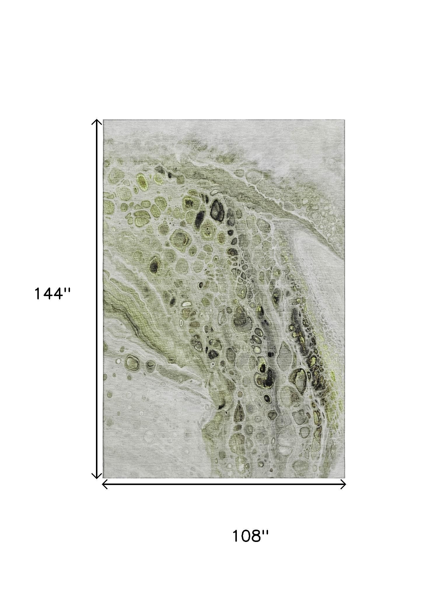 Add some artistry to your room with this 9-foot x 12-foot artichoke green gray and silver abstract washable area rug with uv protection. Ideal for spaces with kids and pets, this rug is stain resistant to help repel dirt and spilled liquids. Built to last, this rug crafted from polyester fibers is known for its durability and long lasting appeal. Rugs are a great way to showcase your style, hide imperfections, warm your home and reduce noise. This larger sized, transitional styled rug is ready to create a focal point or statement piece in your room. 108.00-inch h x 144.00-inch w x 0.39-inch d.