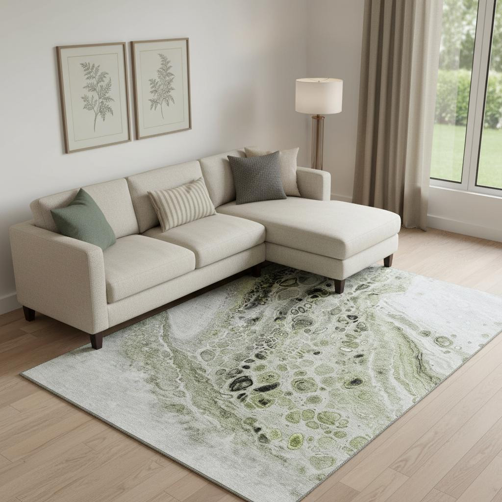 Add great coloration and comfortable texture to your space with this 10-foot x 14-foot artichoke green gray and silver abstract washable area rug with uv protection. Ideal for spaces with kids and pets, this rug is stain resistant to help repel dirt and spilled liquids. Built to last, this rug crafted from polyester fibers is known for its durability and long lasting appeal. Rugs are a great way to showcase your style, hide imperfections, warm your home and reduce noise. This larger sized, transitional styled rug is ready to create a focal point or statement piece in your room. 120.00-inch h x 168.00-inch w x 0.39-inch d.