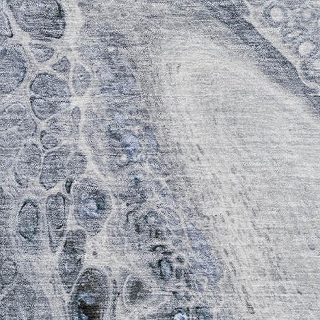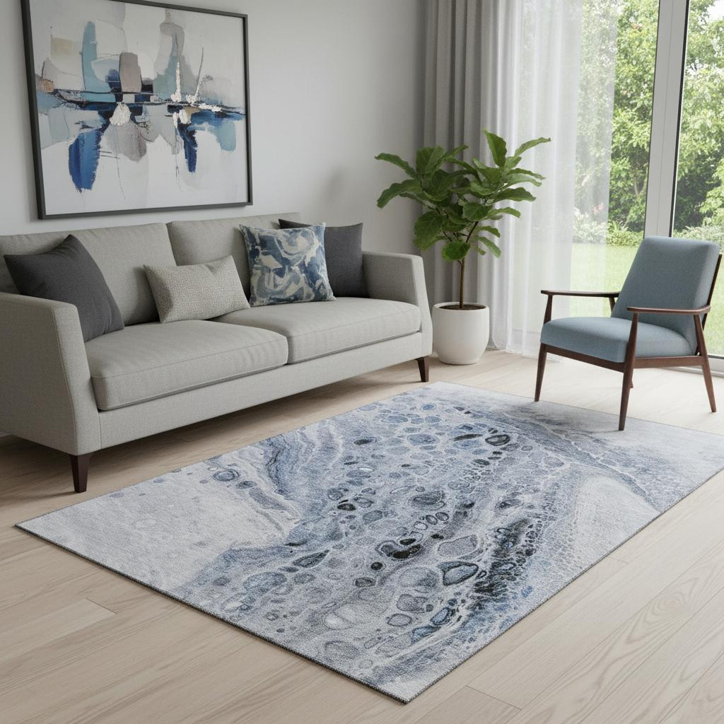 Set an inviting tone in your space with this 5-foot x 8-foot blue gray and silver abstract washable area rug with uv protection. Ideal for spaces with kids and pets, this rug is stain resistant to help repel dirt and spilled liquids. Built to last, this rug crafted from polyester fibers is known for its durability and long lasting appeal. Rugs are a great way to showcase your style, hide imperfections, warm your home and reduce noise. This larger sized, transitional styled rug is ready to create a focal point or statement piece in your room. 60.00-inch h x 90.00-inch w x 0.39-inch d.