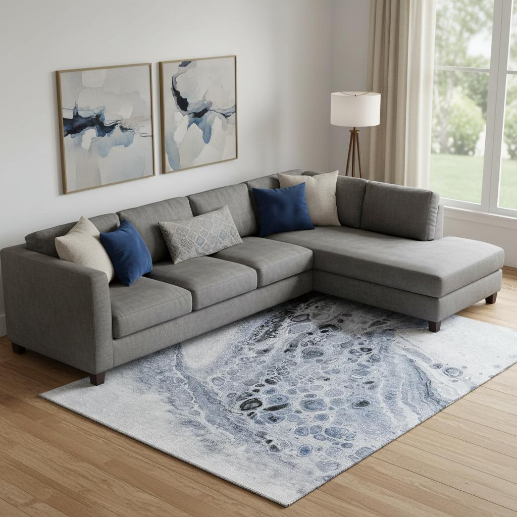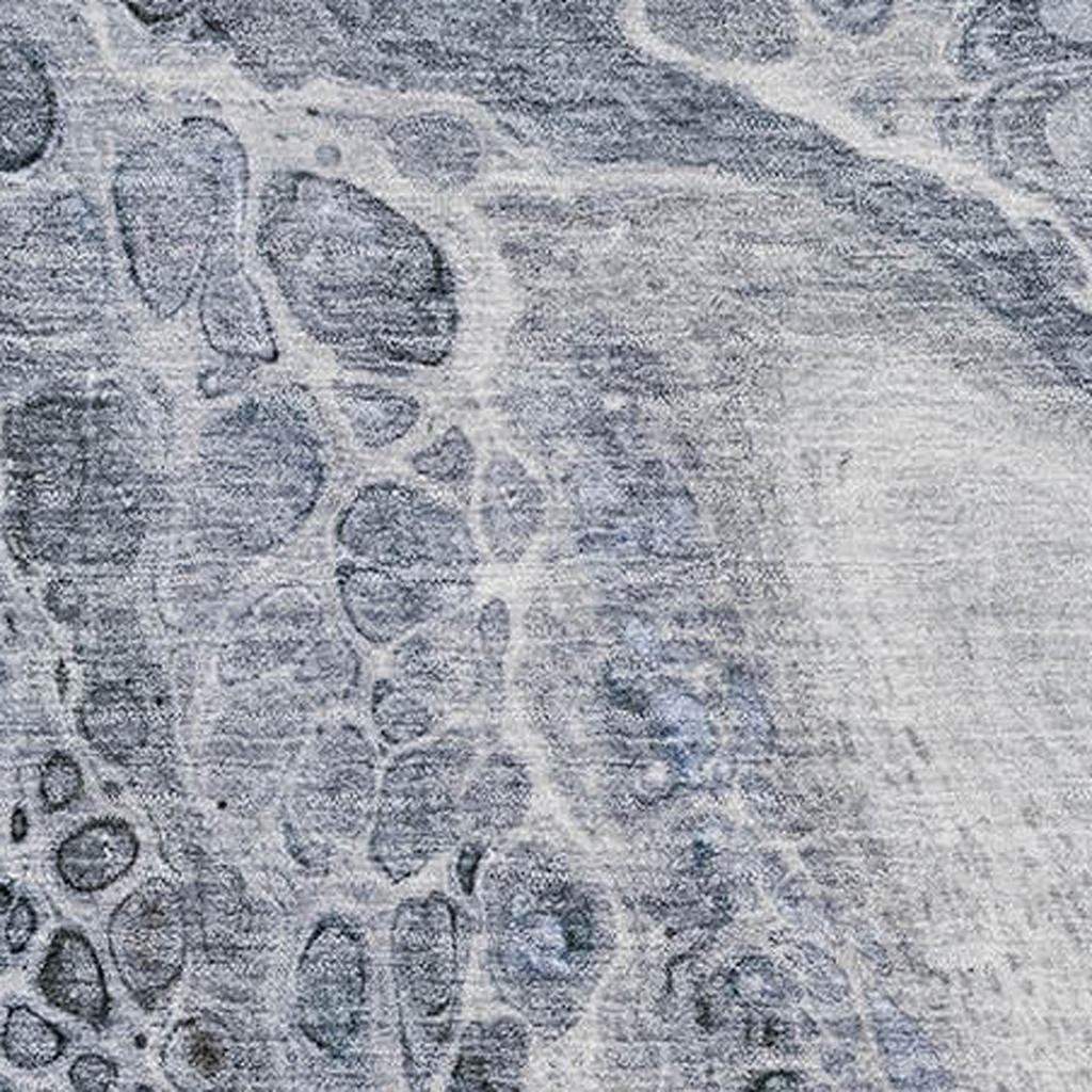 Add some artistry to your room with this 9-foot x 12-foot blue gray and silver abstract washable area rug with uv protection. Ideal for spaces with kids and pets, this rug is stain resistant to help repel dirt and spilled liquids. Built to last, this rug crafted from polyester fibers is known for its durability and long lasting appeal. Rugs are a great way to showcase your style, hide imperfections, warm your home and reduce noise. This larger sized, transitional styled rug is ready to create a focal point or statement piece in your room. 108.00-inch h x 144.00-inch w x 0.39-inch d.