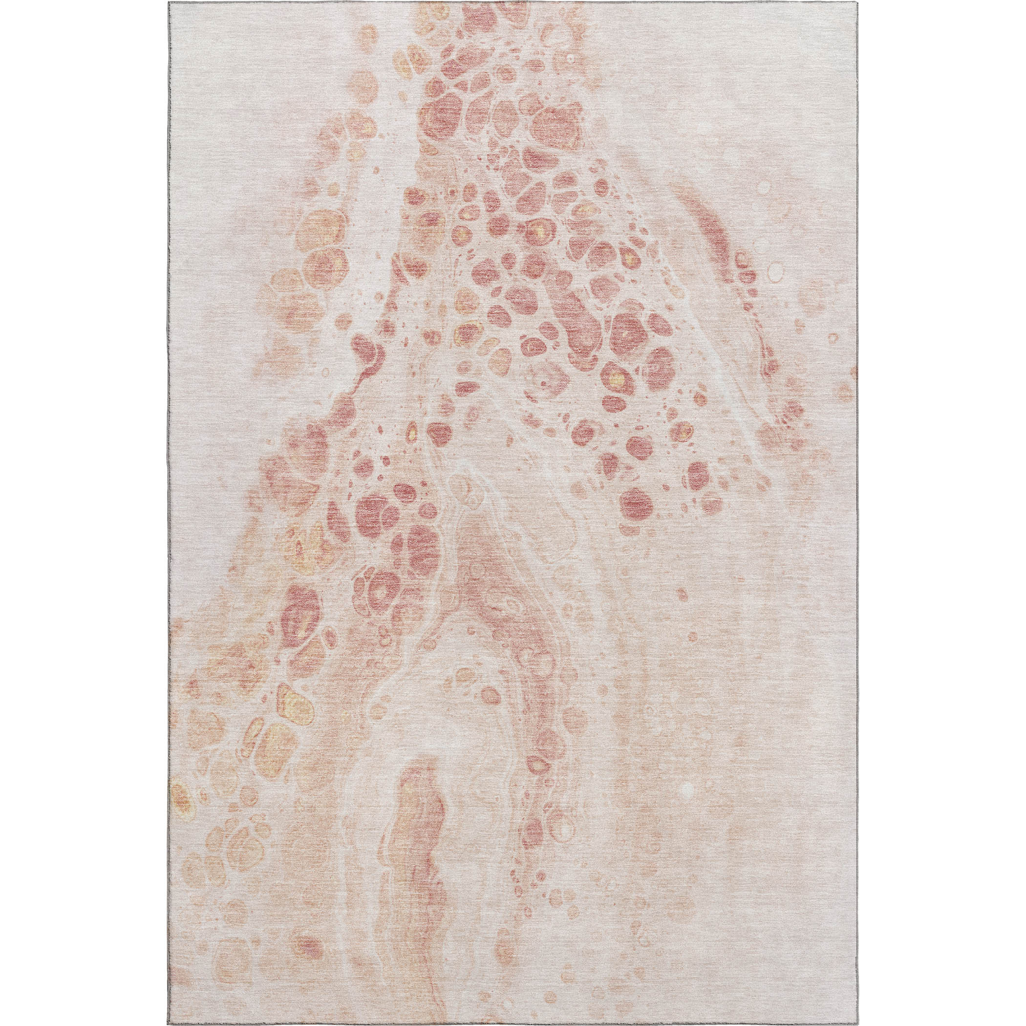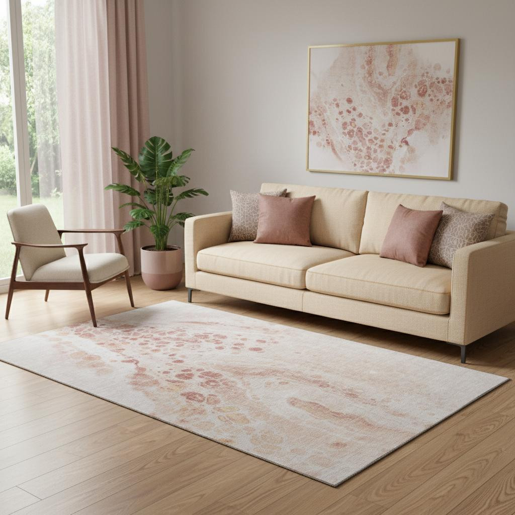 Add some artistry to your room with this 5-foot x 8-foot salmon and ivory abstract washable area rug with uv protection. Ideal for spaces with kids and pets, this rug is stain resistant to help repel dirt and spilled liquids. Built to last, this rug crafted from polyester fibers is known for its durability and long lasting appeal. Rugs are a great way to showcase your style, hide imperfections, warm your home and reduce noise. This larger sized, transitional styled rug is ready to create a focal point or statement piece in your room. 60.00-inch h x 90.00-inch w x 0.39-inch d.