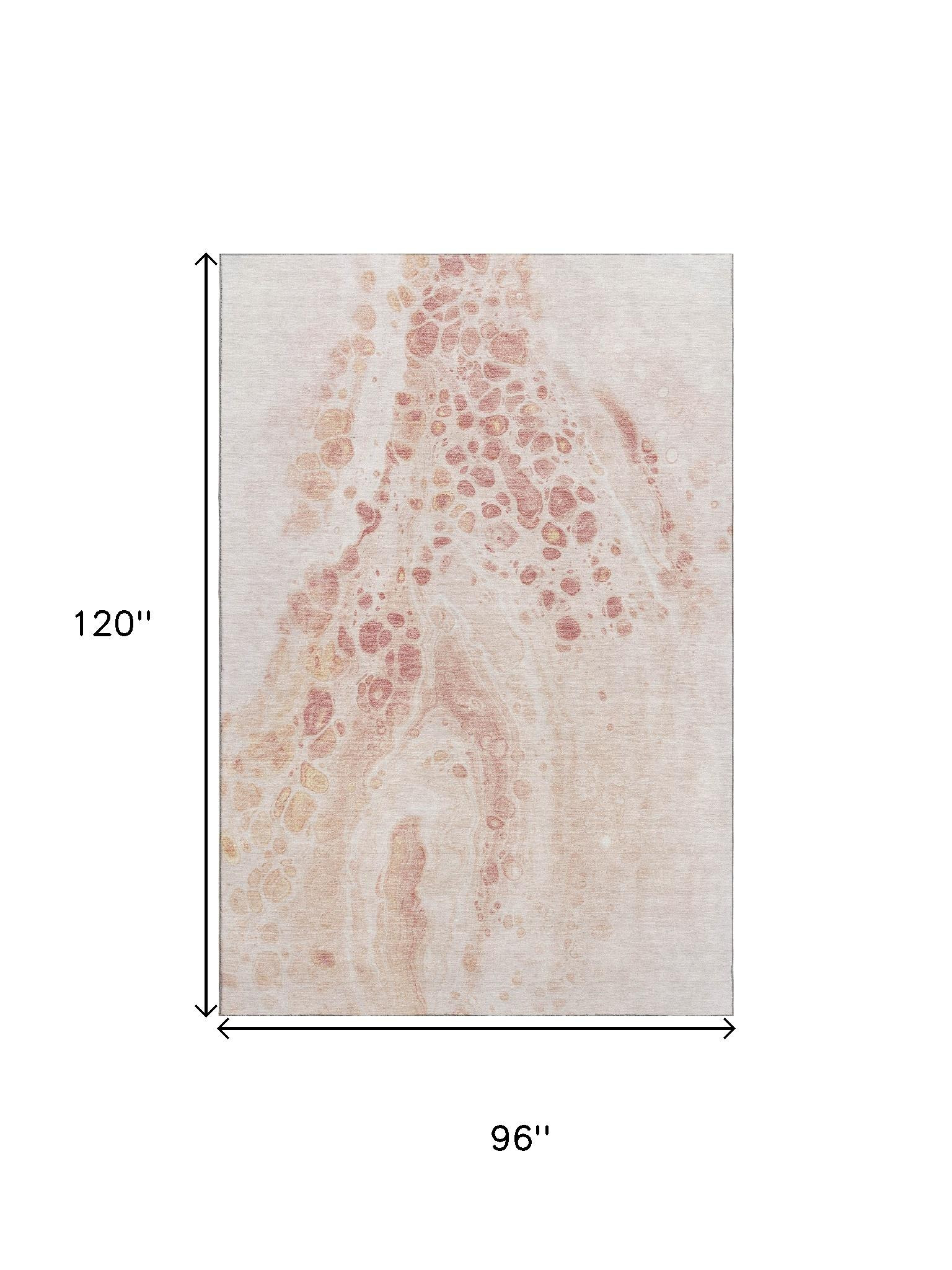 Set an inviting tone in your space with this 8-foot x 10-foot salmon and ivory abstract washable area rug with uv protection. Ideal for spaces with kids and pets, this rug is stain resistant to help repel dirt and spilled liquids. Built to last, this rug crafted from polyester fibers is known for its durability and long lasting appeal. Rugs are a great way to showcase your style, hide imperfections, warm your home and reduce noise. This larger sized, transitional styled rug is ready to create a focal point or statement piece in your room. 96.00-inch h x 120.00-inch w x 0.39-inch d.