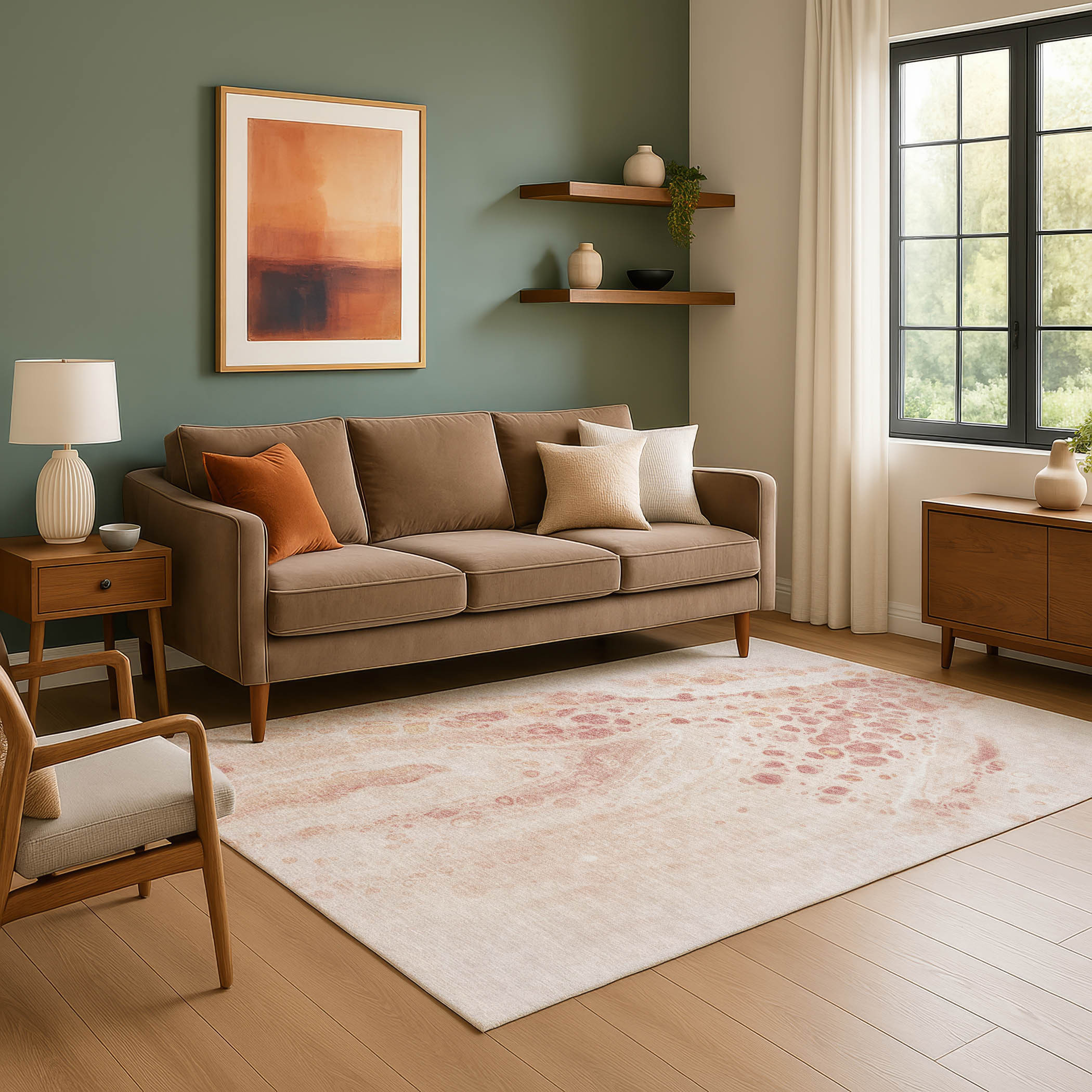 Add some artistry to your room with this 9-foot x 12-foot salmon and ivory abstract washable area rug with uv protection. Ideal for spaces with kids and pets, this rug is stain resistant to help repel dirt and spilled liquids. Built to last, this rug crafted from polyester fibers is known for its durability and long lasting appeal. Rugs are a great way to showcase your style, hide imperfections, warm your home and reduce noise. This larger sized, transitional styled rug is ready to create a focal point or statement piece in your room. 108.00-inch h x 144.00-inch w x 0.39-inch d.