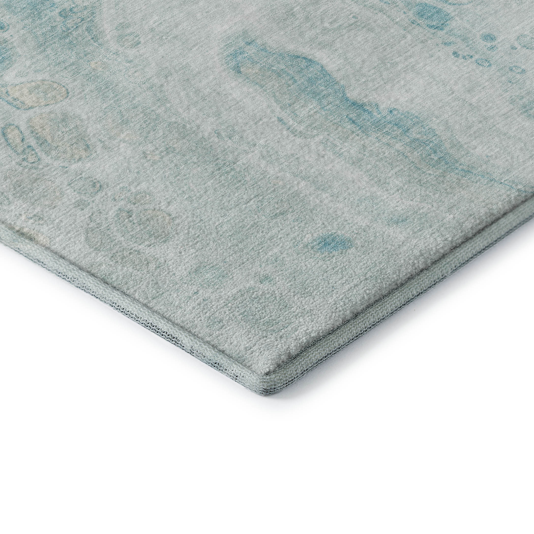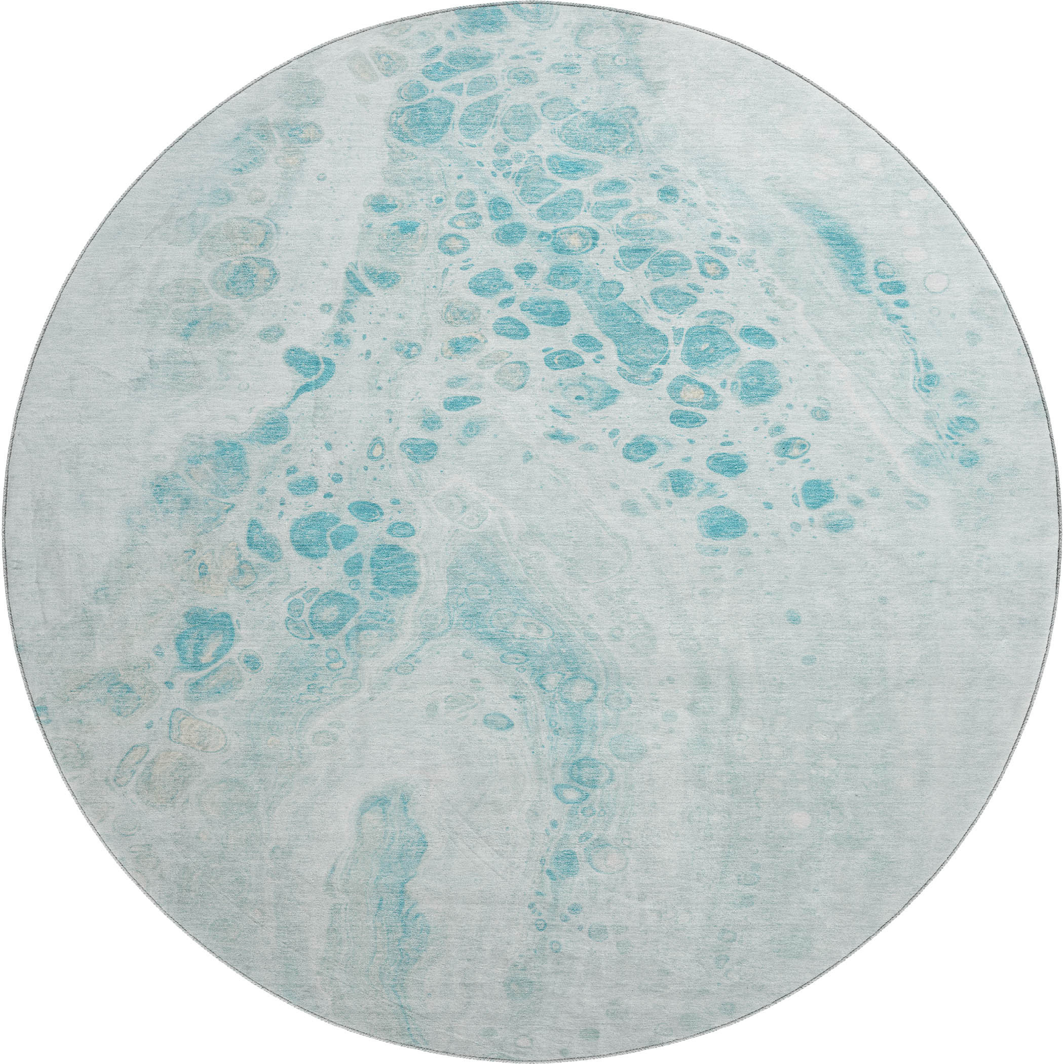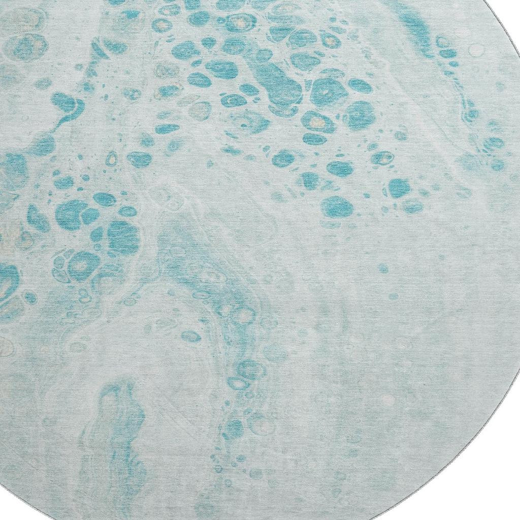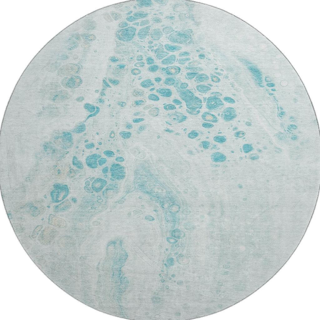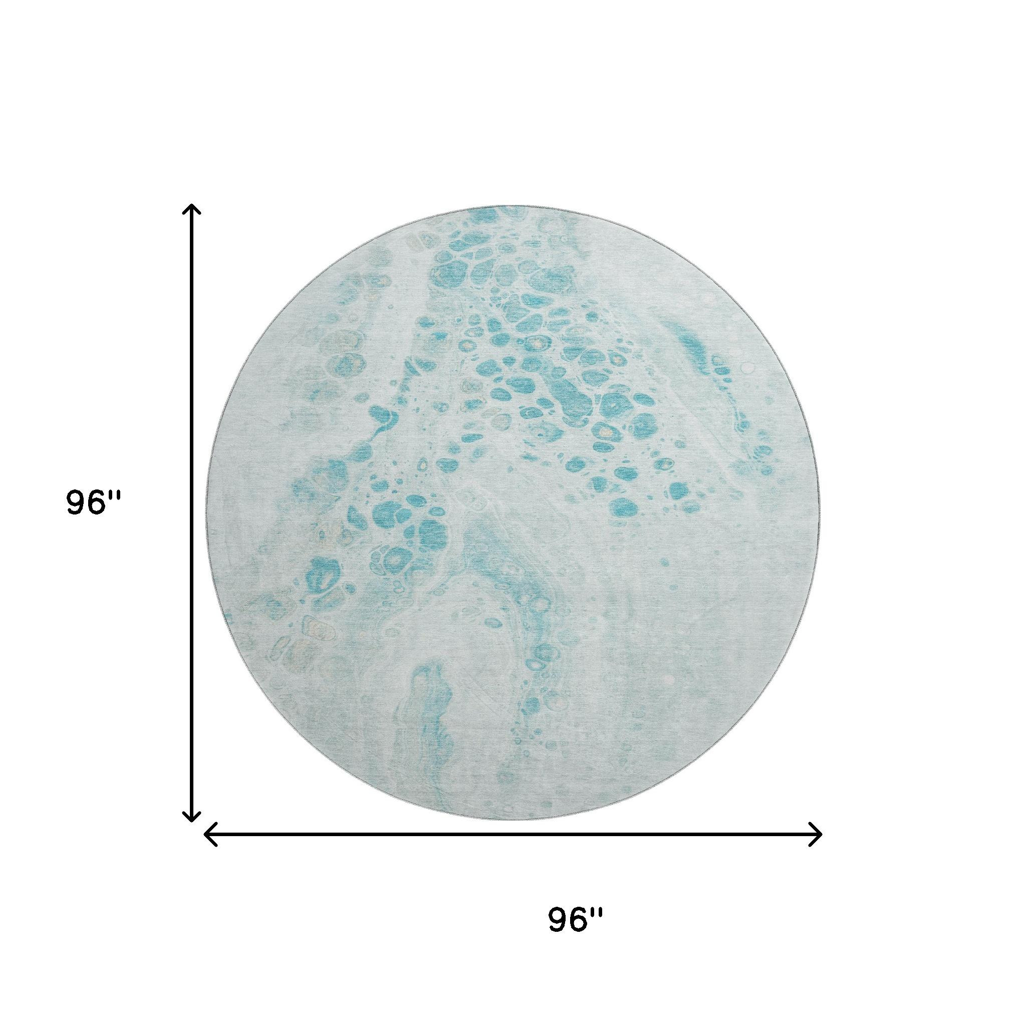 Add some artistry to your room with this 8-foot teal and ivory abstract washable round rug with uv protection. Ideal for spaces with kids and pets, this rug is stain resistant to help repel dirt and spilled liquids. Built to last, this rug crafted from polyester fibers is known for its durability and long lasting appeal. Rugs are a great way to showcase your style, hide imperfections, warm your home and reduce noise. This larger sized, transitional styled rug is ready to create a focal point or statement piece in your room. 96.00-inch h x 96.00-inch w x 0.39-inch d.