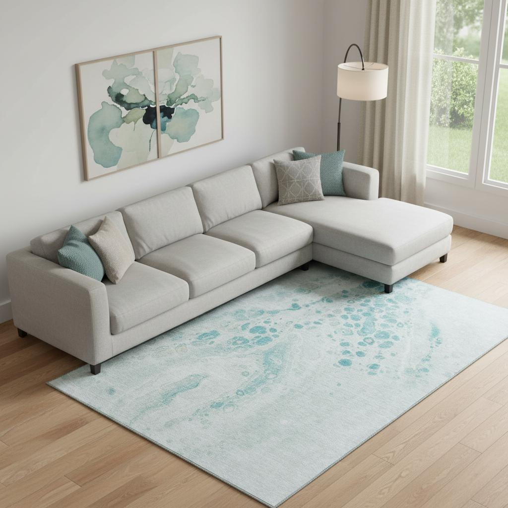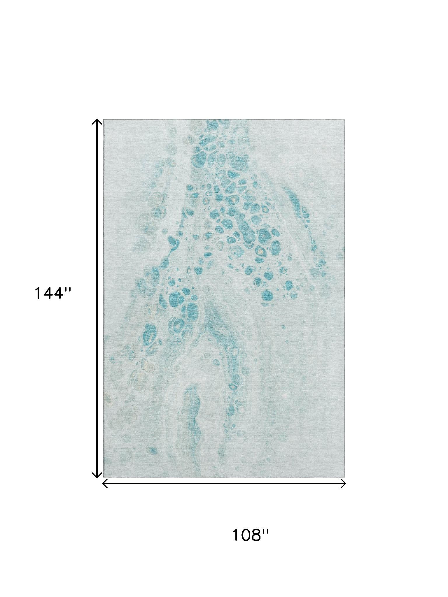 Set an inviting tone in your space with this 9-foot x 12-foot teal and ivory abstract washable area rug with uv protection. Ideal for spaces with kids and pets, this rug is stain resistant to help repel dirt and spilled liquids. Built to last, this rug crafted from polyester fibers is known for its durability and long lasting appeal. Rugs are a great way to showcase your style, hide imperfections, warm your home and reduce noise. This larger sized, transitional styled rug is ready to create a focal point or statement piece in your room. 108.00-inch h x 144.00-inch w x 0.39-inch d.