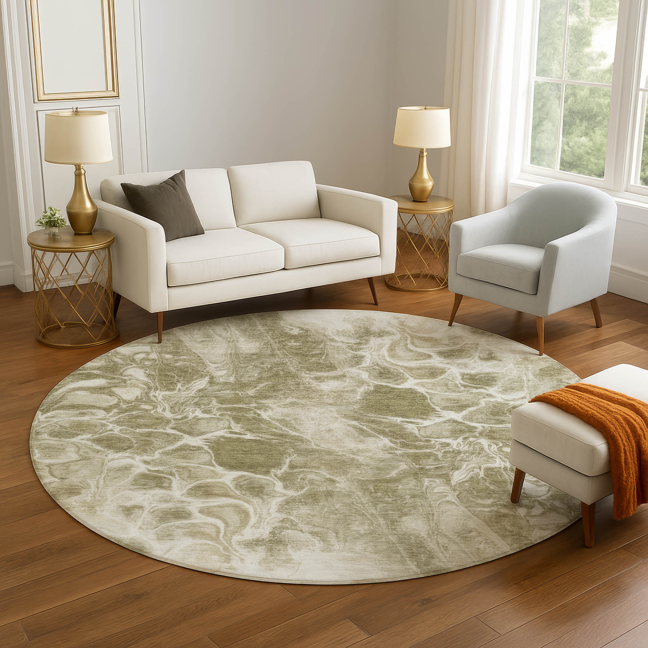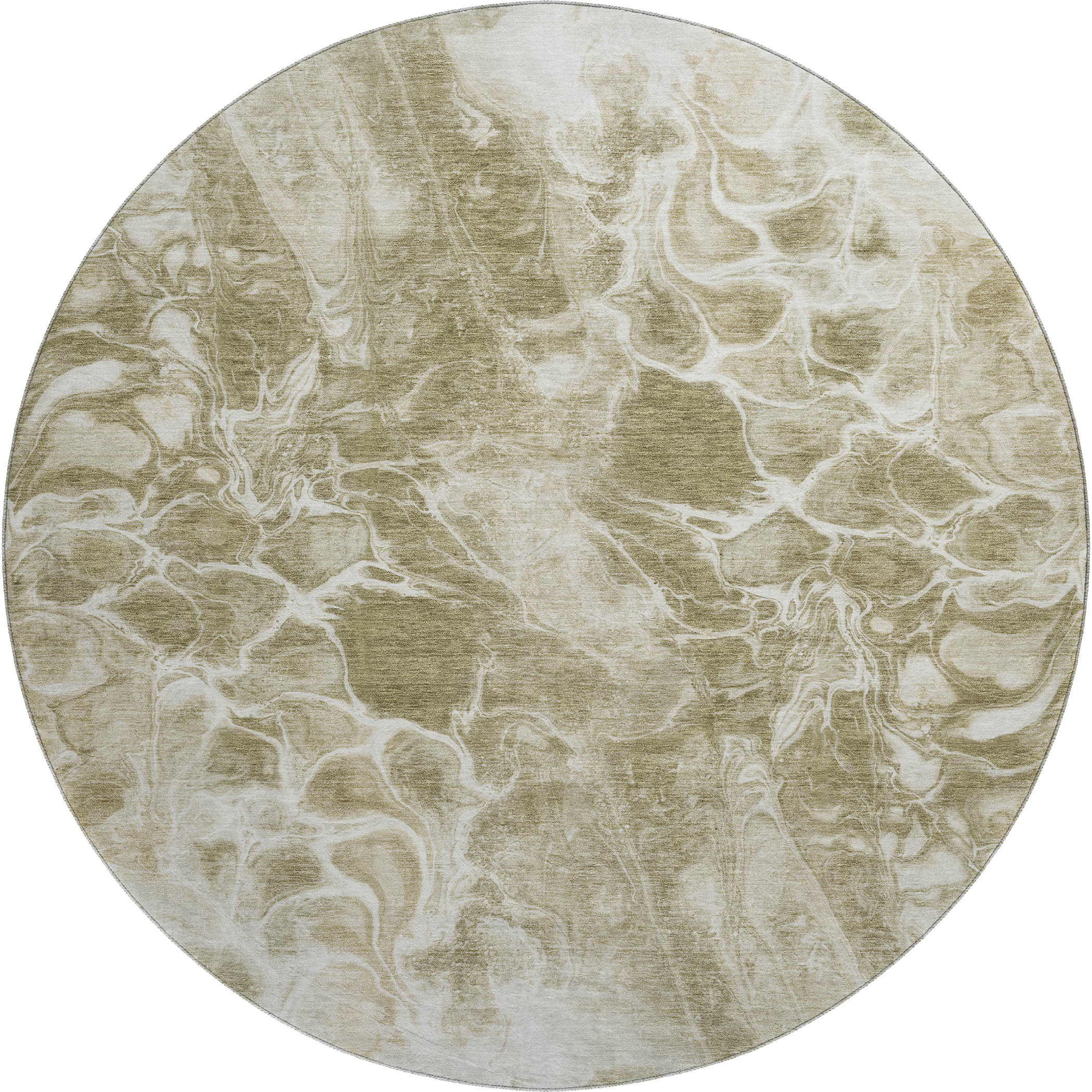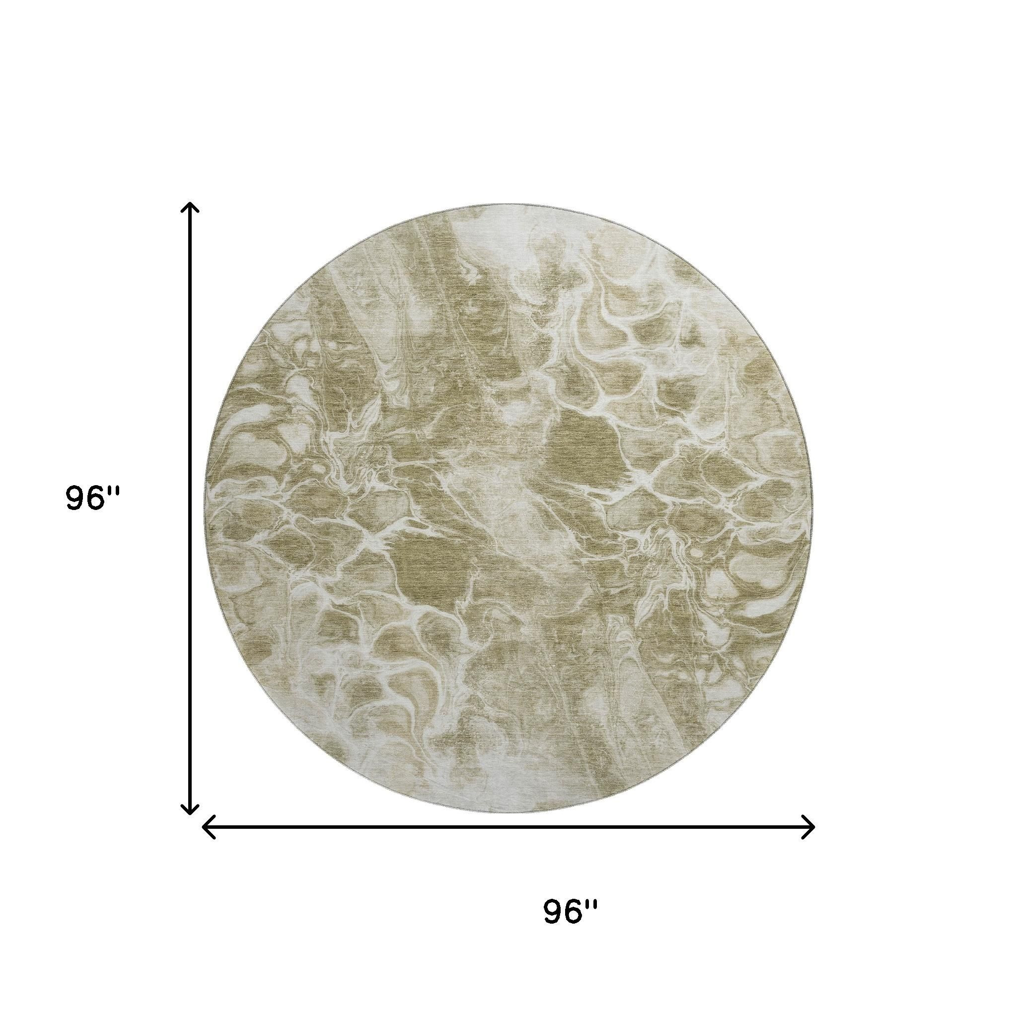 Set an inviting tone in your space with this 8-foot khaki and ivory abstract washable round rug with uv protection. Ideal for spaces with kids and pets, this rug is stain resistant to help repel dirt and spilled liquids. Built to last, this rug crafted from polyester fibers is known for its durability and long lasting appeal. Rugs are a great way to showcase your style, hide imperfections, warm your home and reduce noise. This larger sized, transitional styled rug is ready to create a focal point or statement piece in your room. 96.00-inch h x 96.00-inch w x 0.39-inch d.