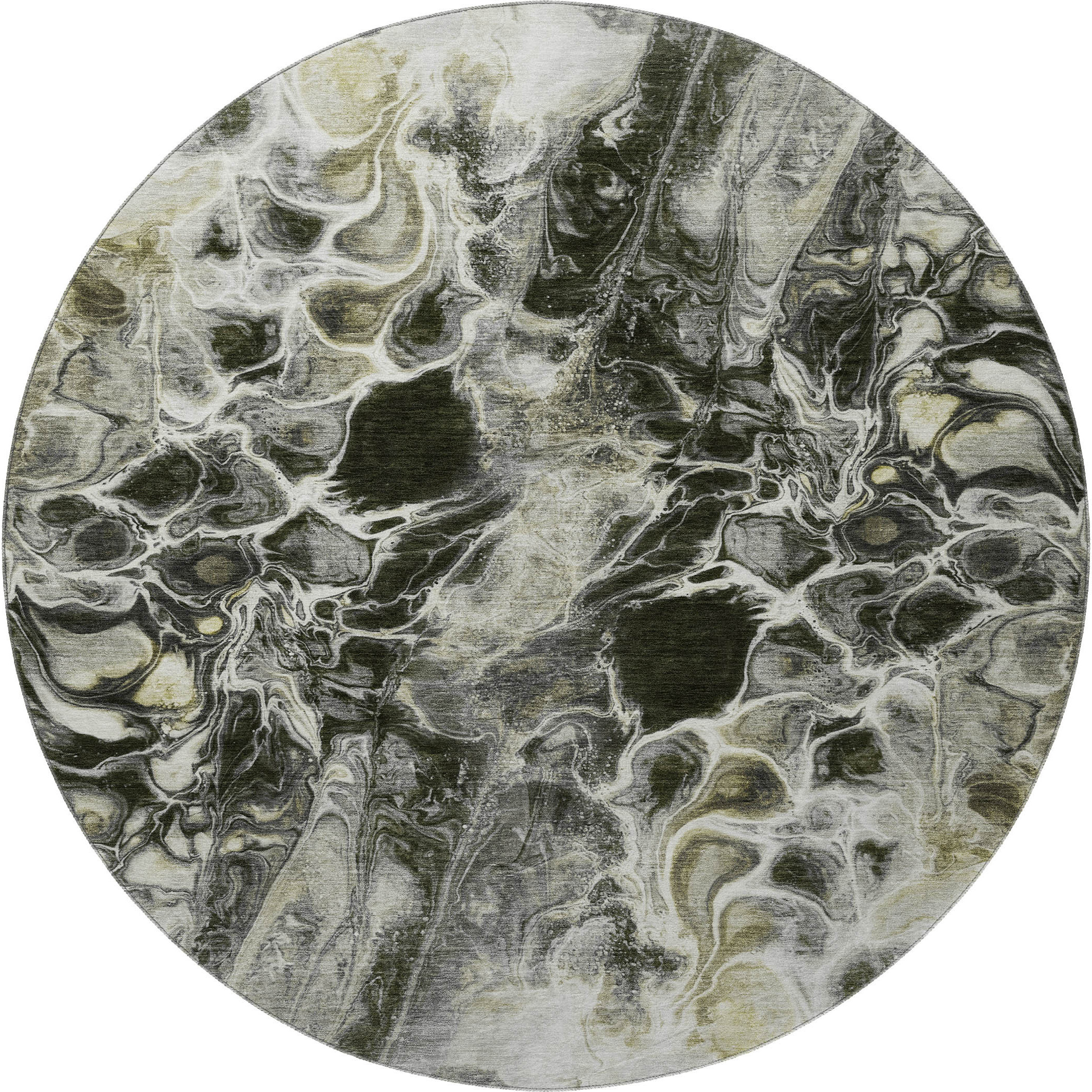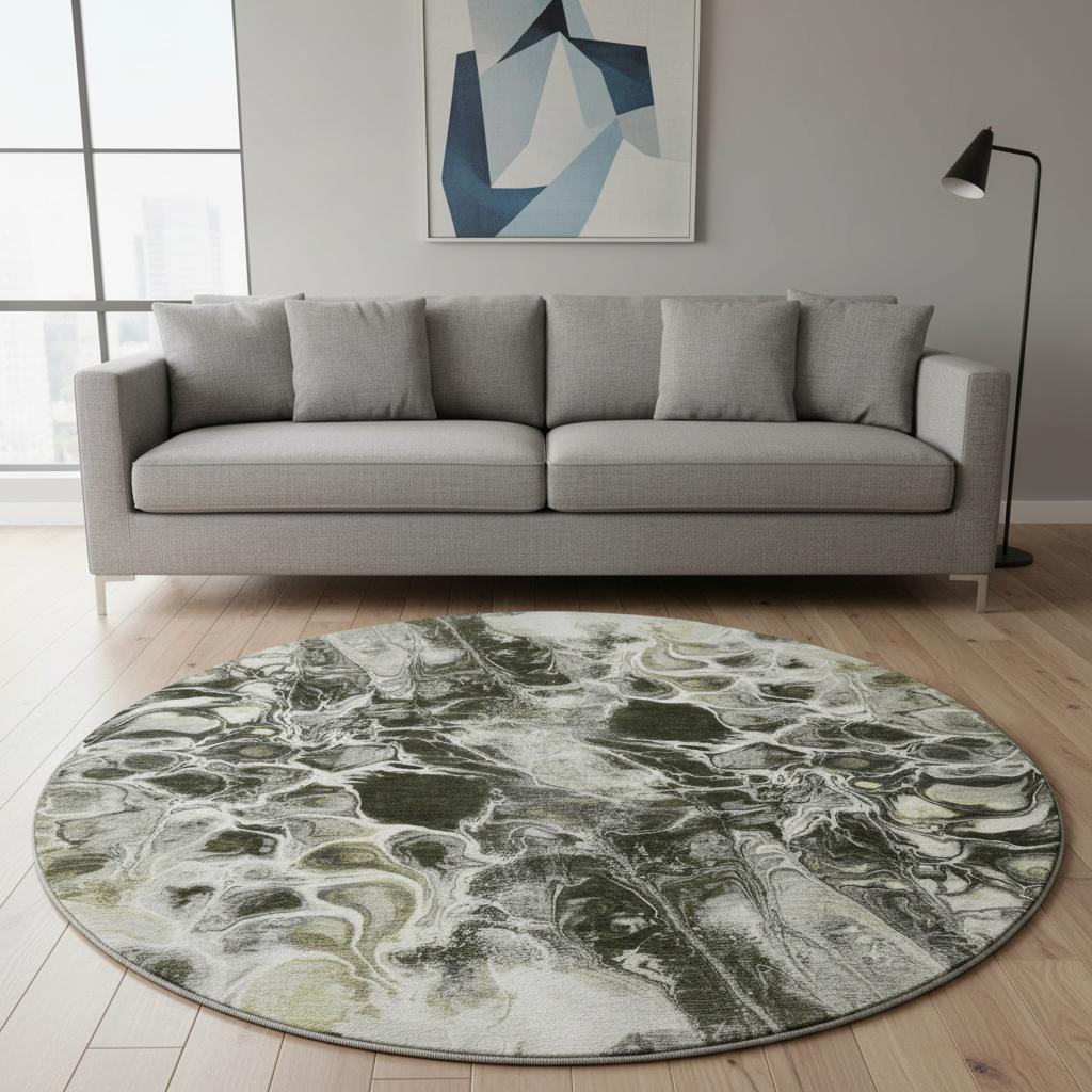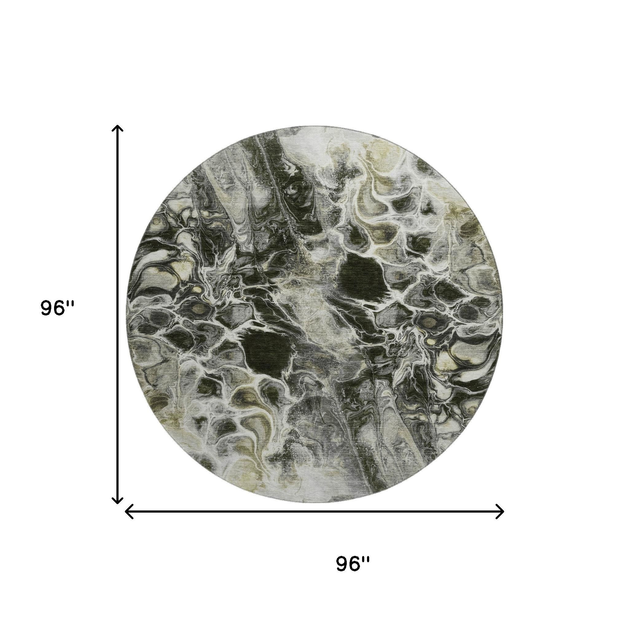 This 8-foot pewter black and silver abstract washable round rug with uv protection, is a great way to add warmth to a room. Ideal for spaces with kids and pets, this rug is stain resistant to help repel dirt and spilled liquids. Built to last, this rug crafted from polyester fibers is known for its durability and long lasting appeal. Rugs are a great way to showcase your style, hide imperfections, warm your home and reduce noise. This larger sized, transitional styled rug is ready to create a focal point or statement piece in your room. 96.00-inch h x 96.00-inch w x 0.39-inch d.