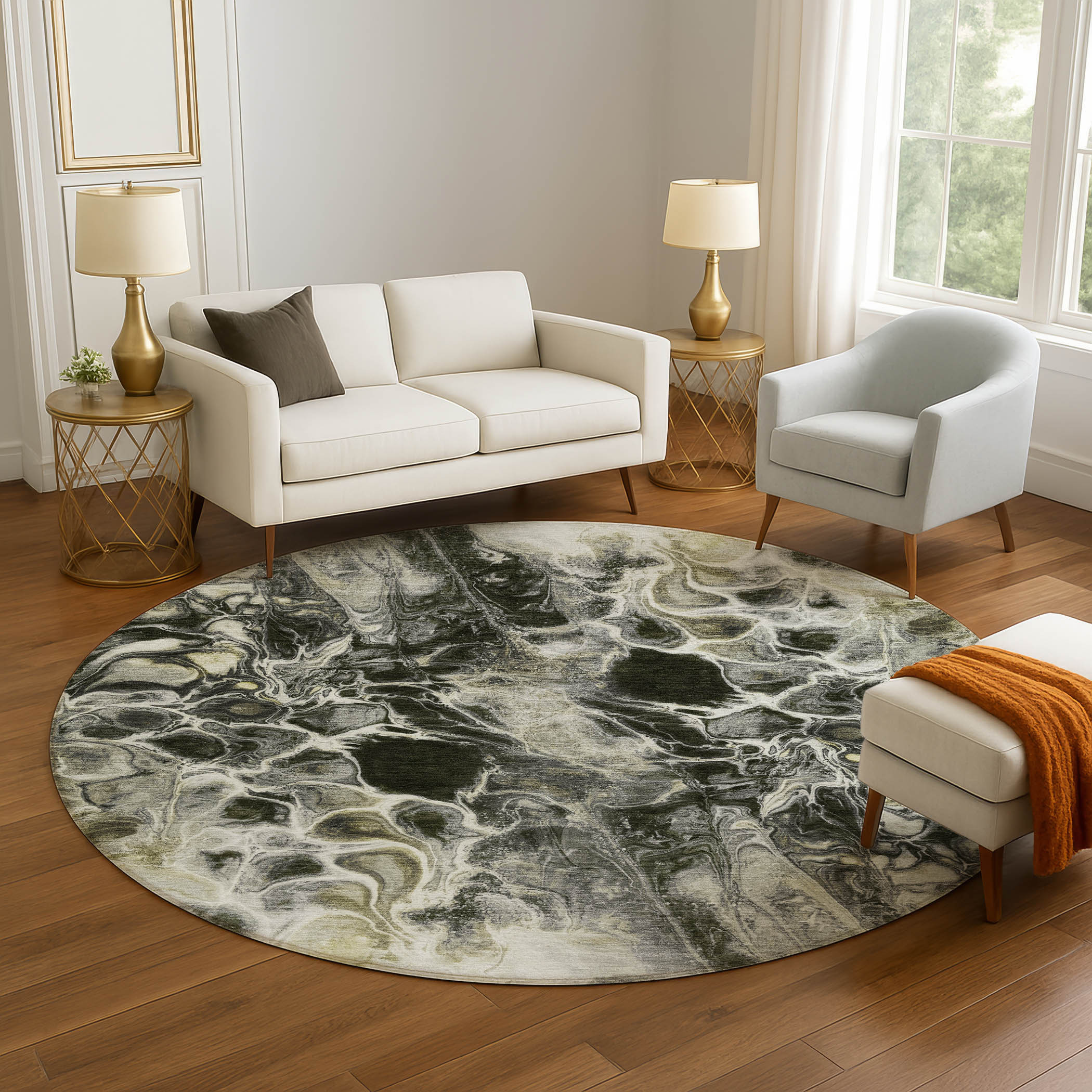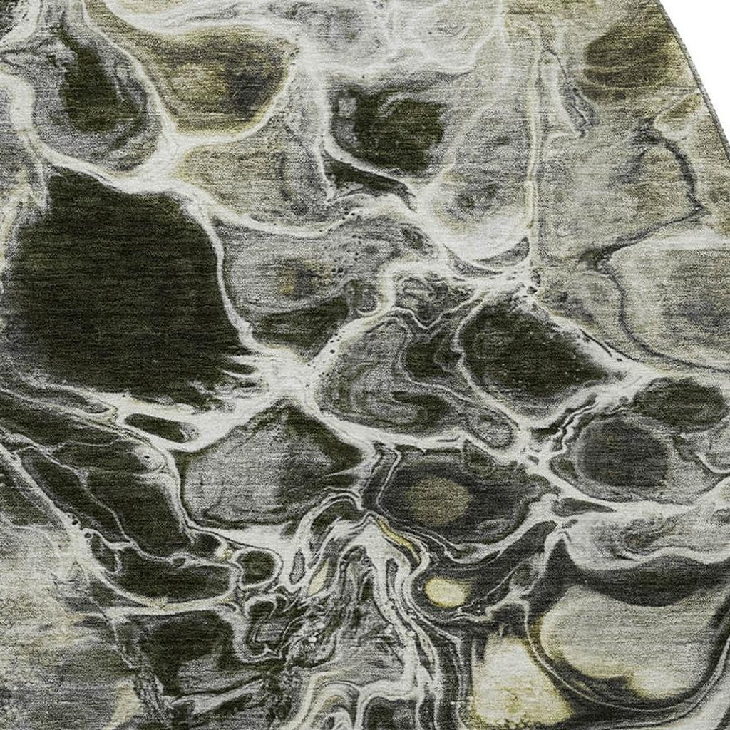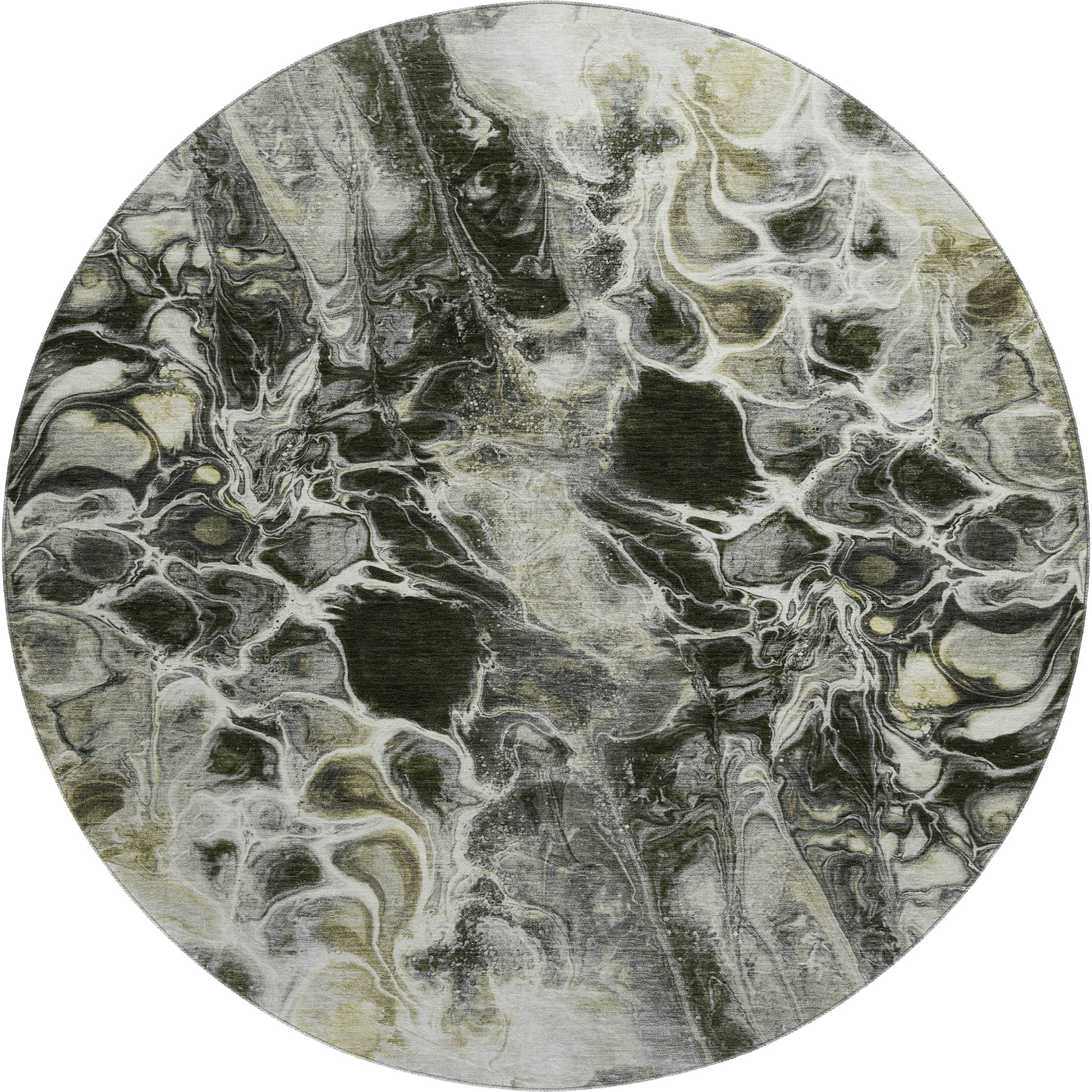 This 8-foot pewter black and silver abstract washable round rug with uv protection, is a great way to add warmth to a room. Ideal for spaces with kids and pets, this rug is stain resistant to help repel dirt and spilled liquids. Built to last, this rug crafted from polyester fibers is known for its durability and long lasting appeal. Rugs are a great way to showcase your style, hide imperfections, warm your home and reduce noise. This larger sized, transitional styled rug is ready to create a focal point or statement piece in your room. 96.00-inch h x 96.00-inch w x 0.39-inch d.