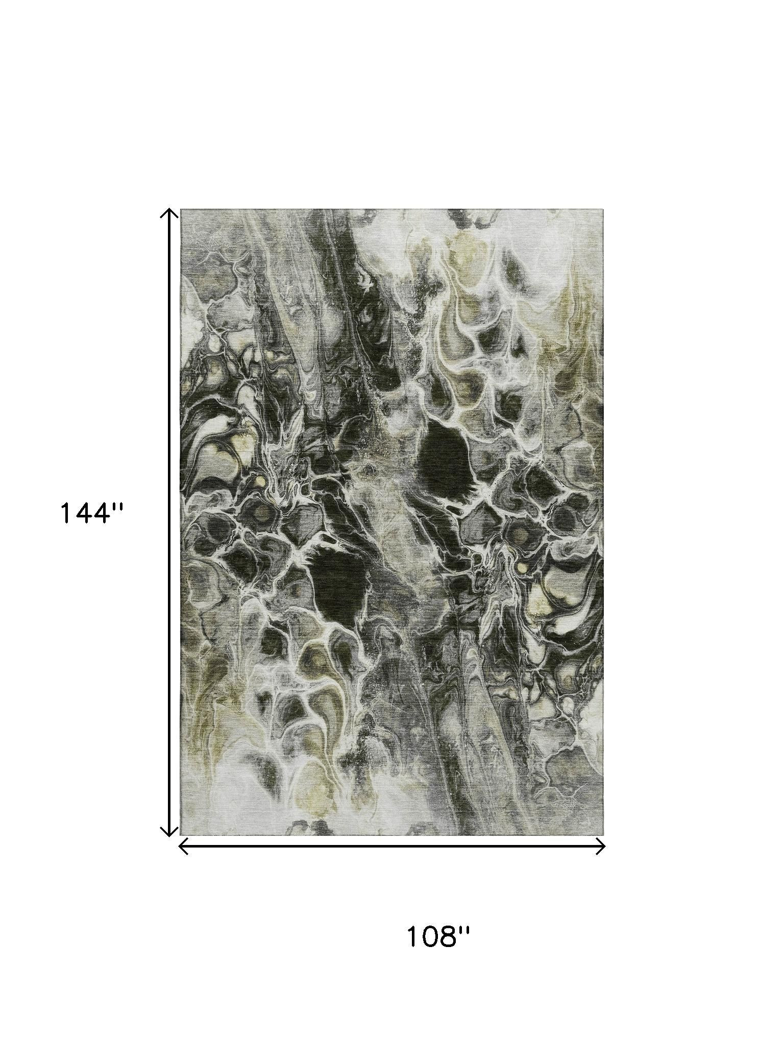 Set an inviting tone in your space with this 9-foot x 12-foot pewter black and silver abstract washable area rug with uv protection. Ideal for spaces with kids and pets, this rug is stain resistant to help repel dirt and spilled liquids. Built to last, this rug crafted from polyester fibers is known for its durability and long lasting appeal. Rugs are a great way to showcase your style, hide imperfections, warm your home and reduce noise. This larger sized, transitional styled rug is ready to create a focal point or statement piece in your room. 108.00-inch h x 144.00-inch w x 0.39-inch d.