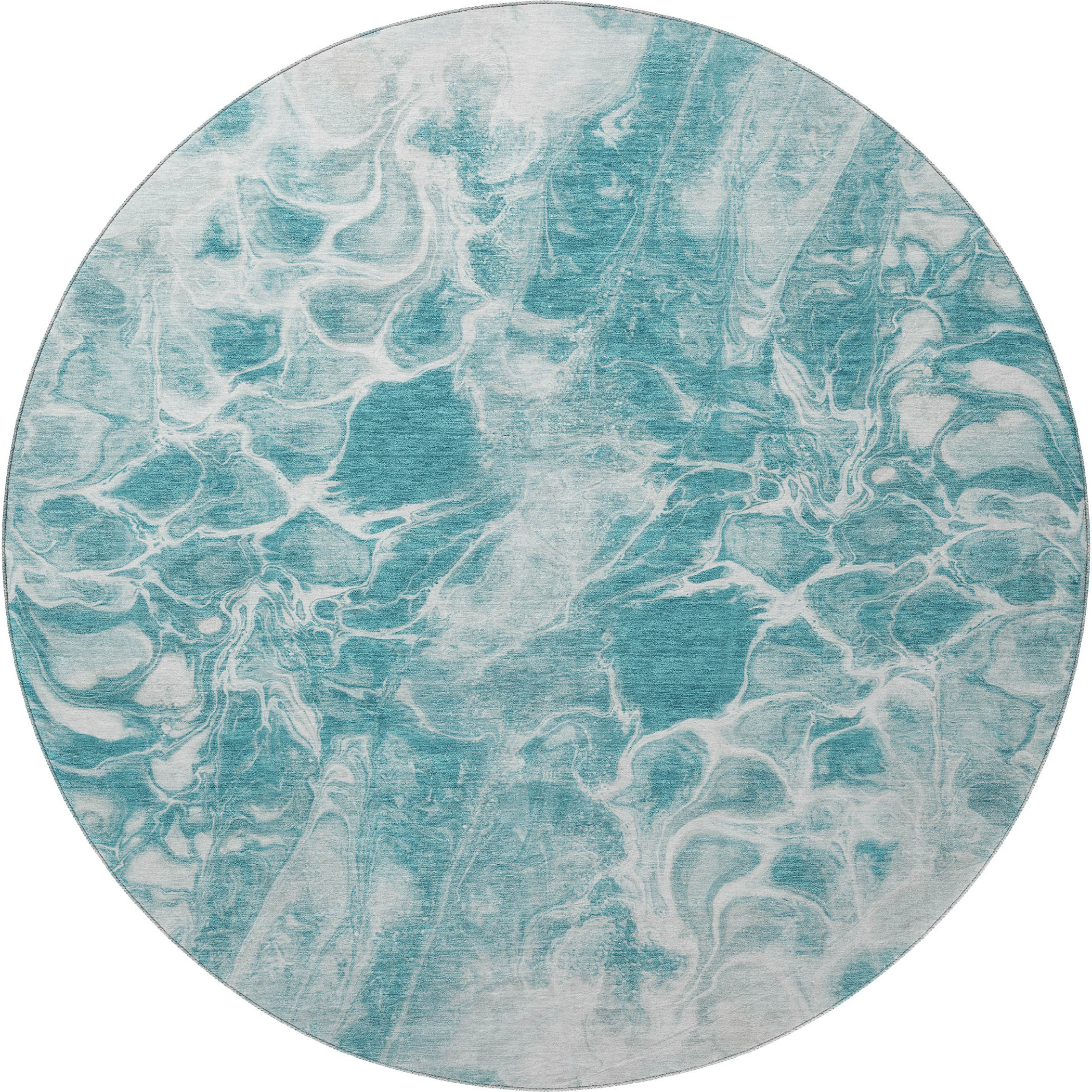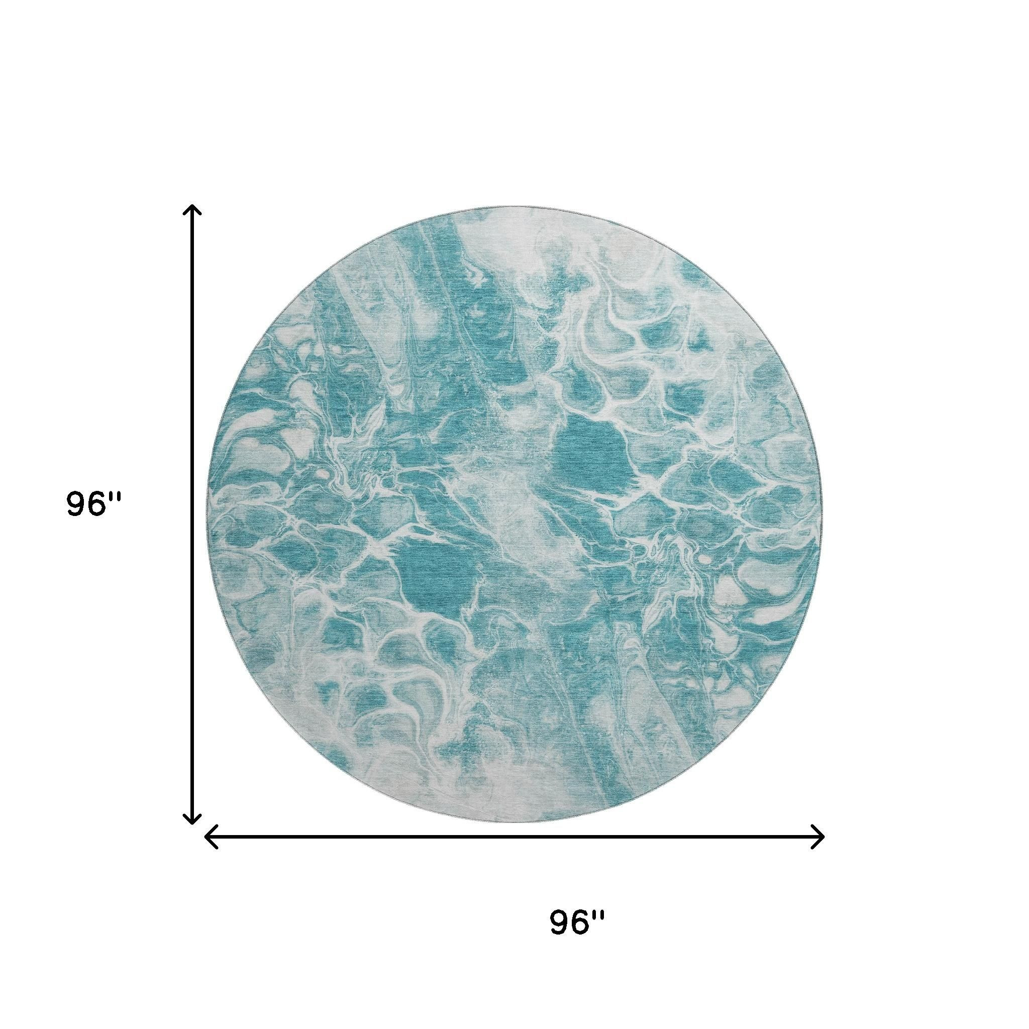 This 8-foot teal and ivory abstract washable round rug with uv protection, is a great way to add warmth to a room. Ideal for spaces with kids and pets, this rug is stain resistant to help repel dirt and spilled liquids. Built to last, this rug crafted from polyester fibers is known for its durability and long lasting appeal. Rugs are a great way to showcase your style, hide imperfections, warm your home and reduce noise. This larger sized, transitional styled rug is ready to create a focal point or statement piece in your room. 96.00-inch h x 96.00-inch w x 0.39-inch d.