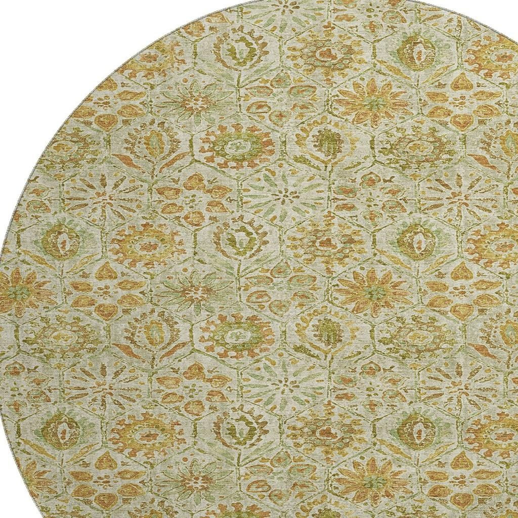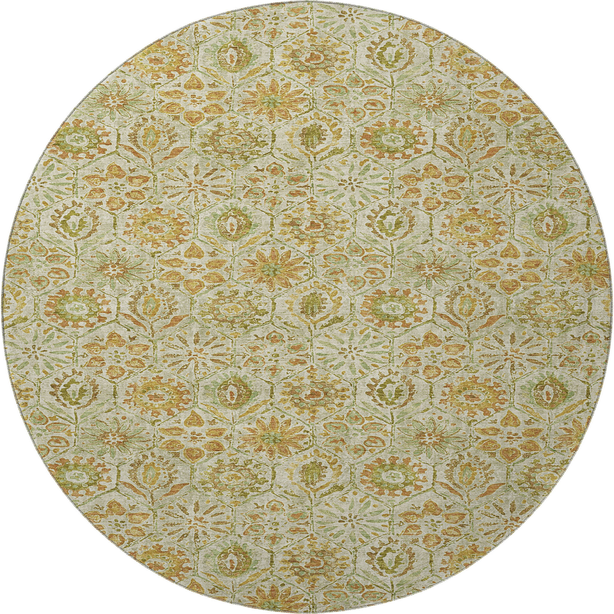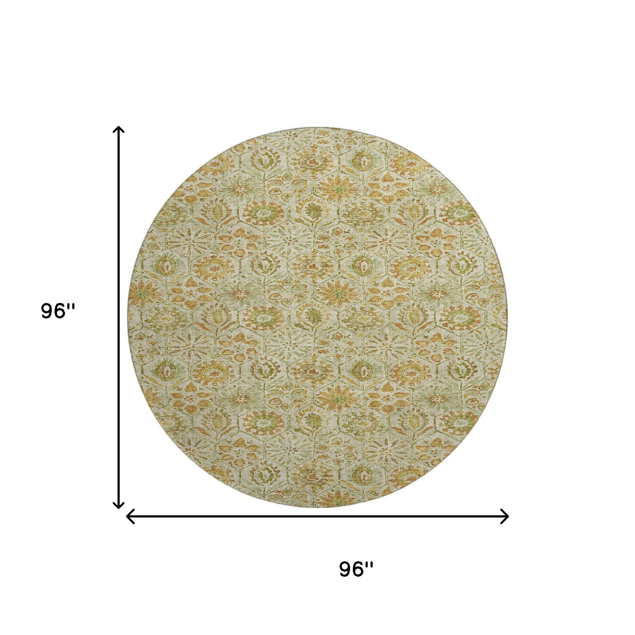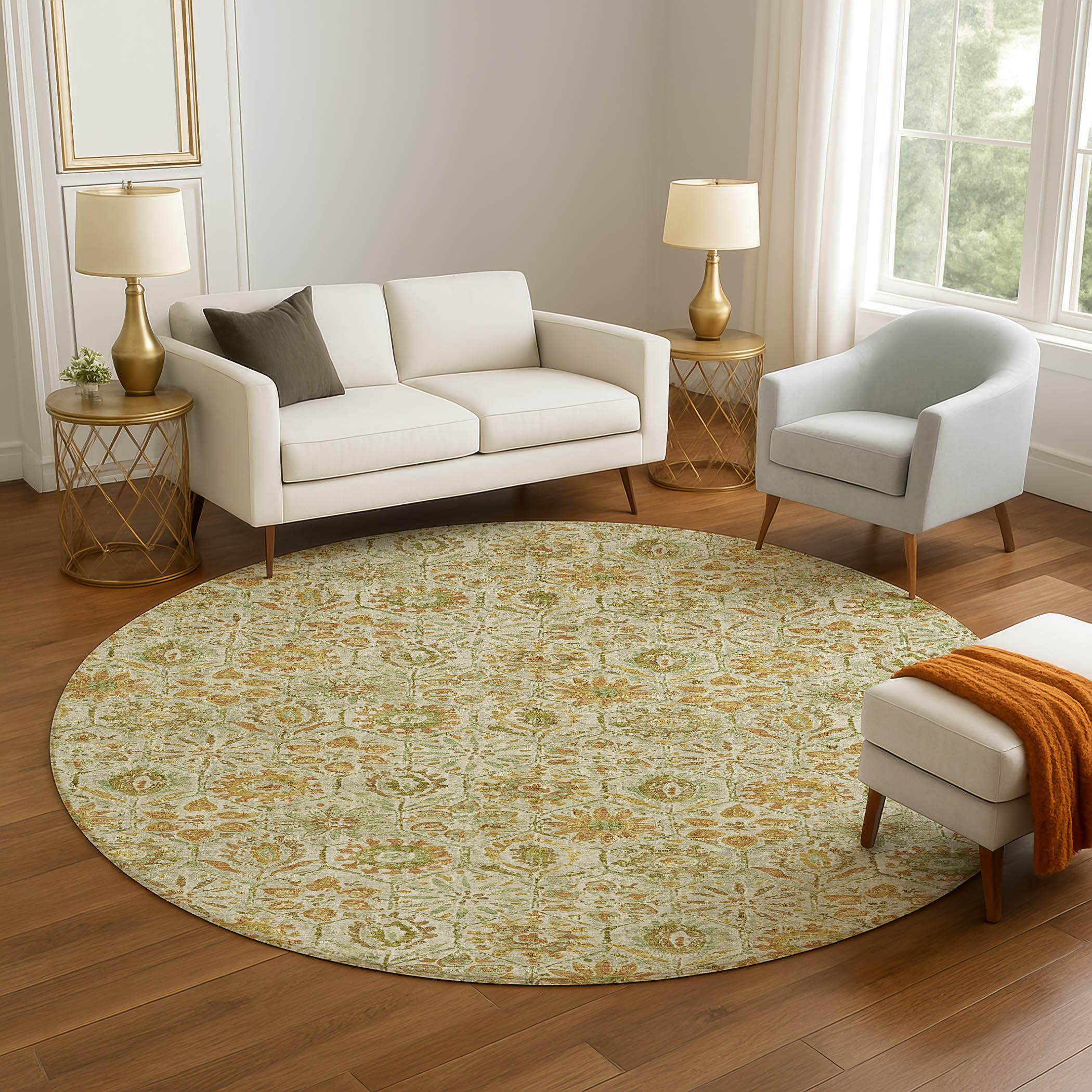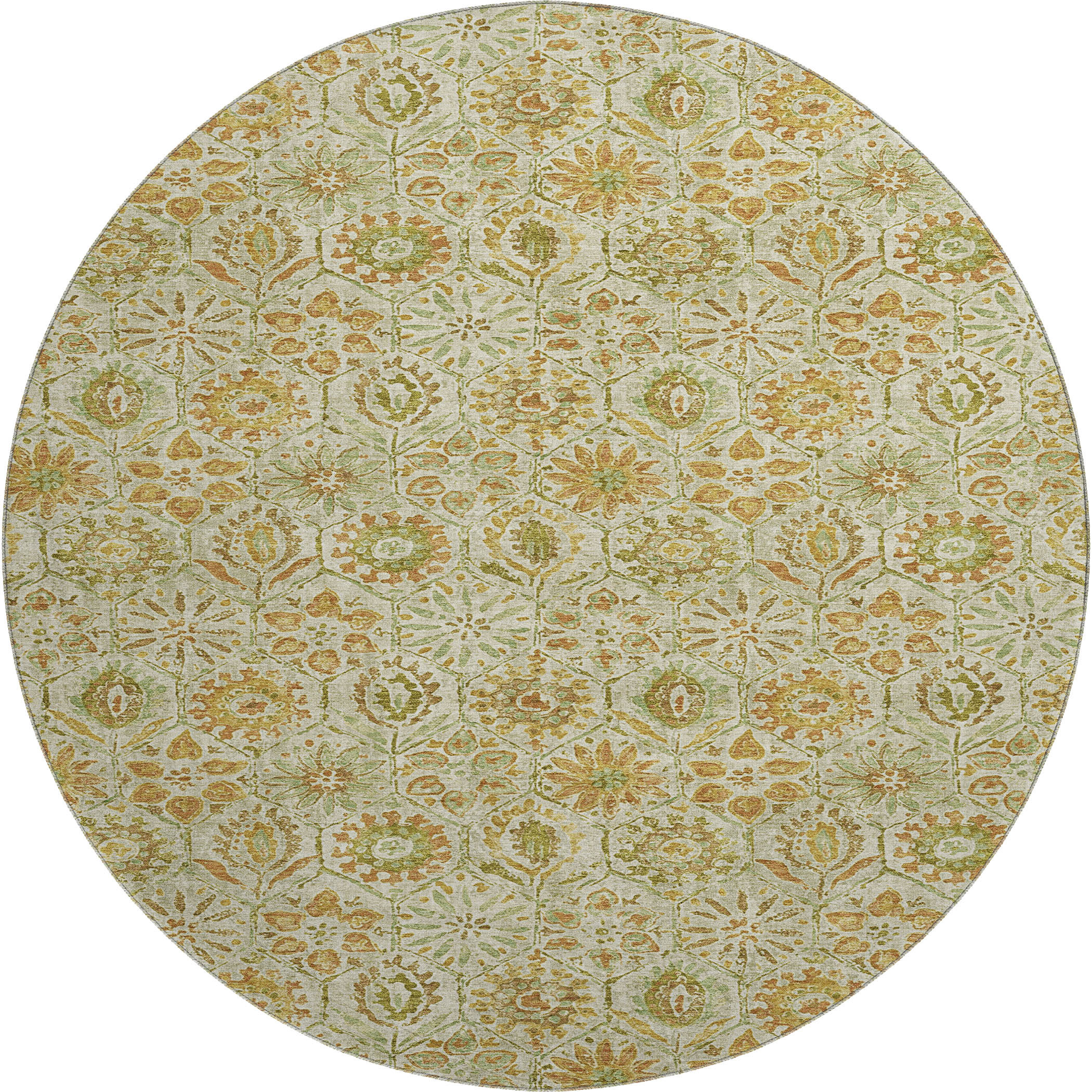 Add some artistry to your room with this 8-foot beige and gold floral washable round rug with uv protection. Ideal for spaces with kids and pets, this rug is stain resistant to help repel dirt and spilled liquids. Built to last, this rug crafted from polyester fibers is known for its durability and long lasting appeal. Rugs are a great way to showcase your style, hide imperfections, warm your home and reduce noise. This larger sized, transitional styled rug is ready to create a focal point or statement piece in your room. 96.00-inch h x 96.00-inch w x 0.39-inch d.