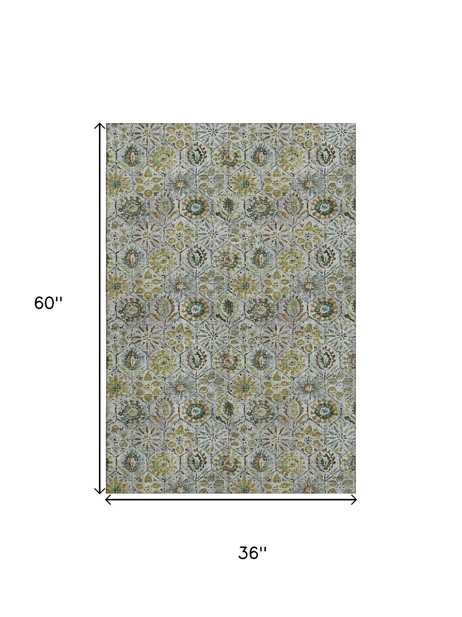 Set an inviting tone in your space with this 3-foot x 5-foot green gray and copper floral washable area rug with uv protection. Ideal for spaces with kids and pets, this rug is stain resistant to help repel dirt and spilled liquids. Built to last, this rug crafted from polyester fibers is known for its durability and long lasting appeal. Rugs are a great way to showcase your style, hide imperfections, warm your home and reduce noise. This smaller sized, transitional styled rug is just what you need for your walkway, bedside, in front of door, cabinet, refrigerator, or chair. 36.00-inch h x 60.00-inch w x 0.39-inch d.