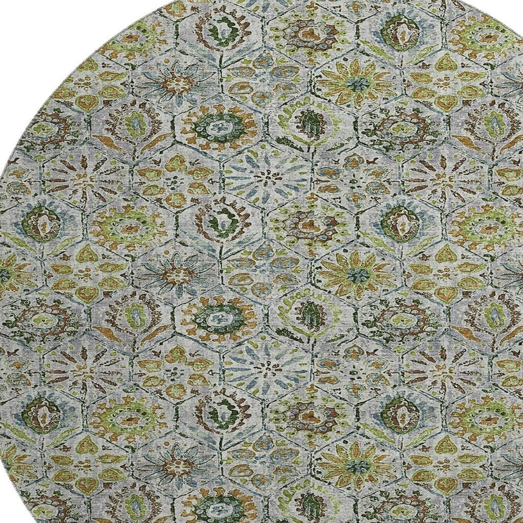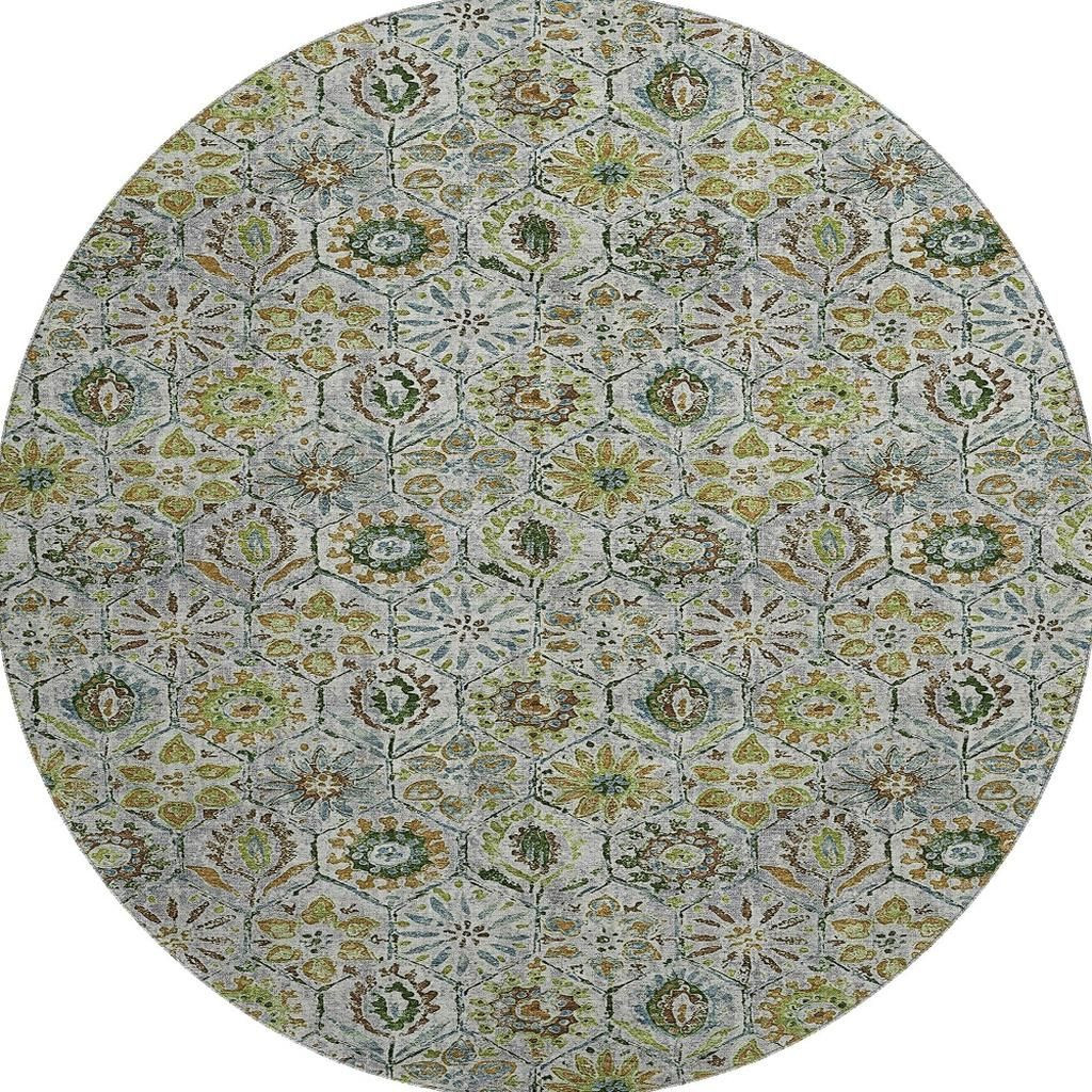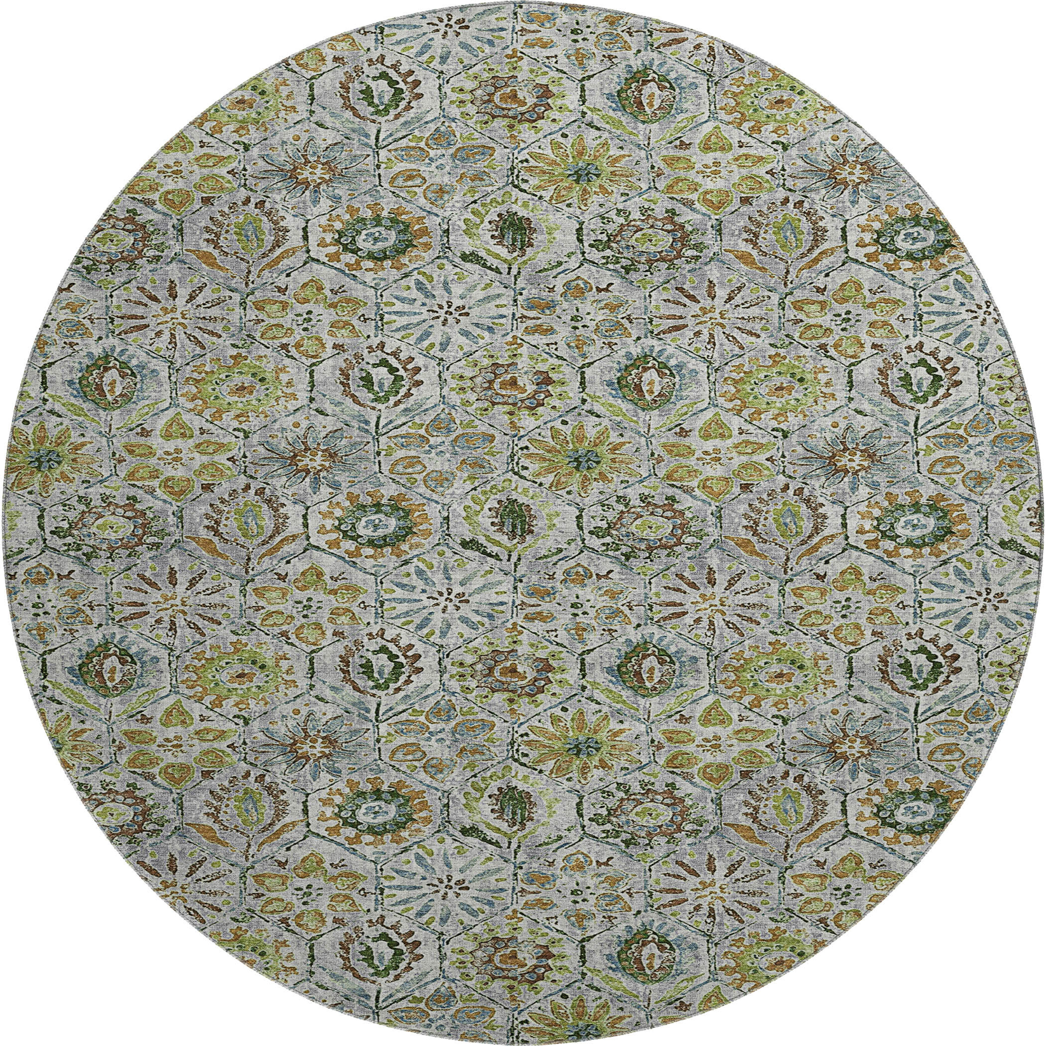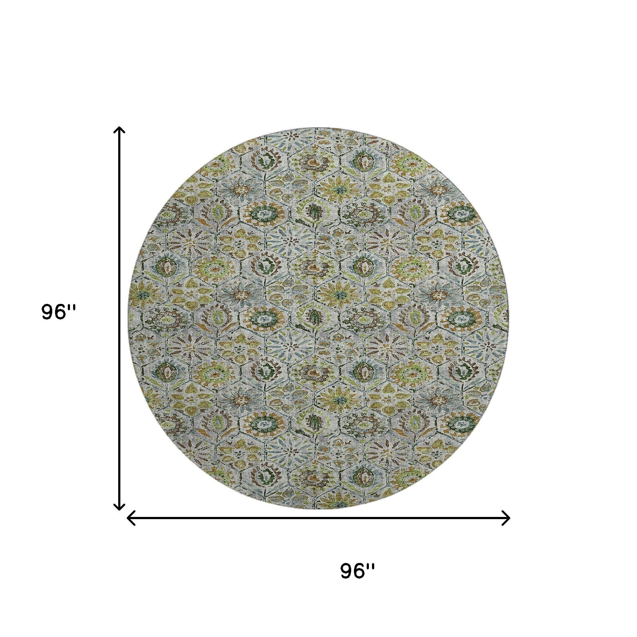 Add great coloration and comfortable texture to your space with this 8-foot green gray and copper floral washable round rug with uv protection. Ideal for spaces with kids and pets, this rug is stain resistant to help repel dirt and spilled liquids. Built to last, this rug crafted from polyester fibers is known for its durability and long lasting appeal. Rugs are a great way to showcase your style, hide imperfections, warm your home and reduce noise. This larger sized, transitional styled rug is ready to create a focal point or statement piece in your room. 96.00-inch h x 96.00-inch w x 0.39-inch d.