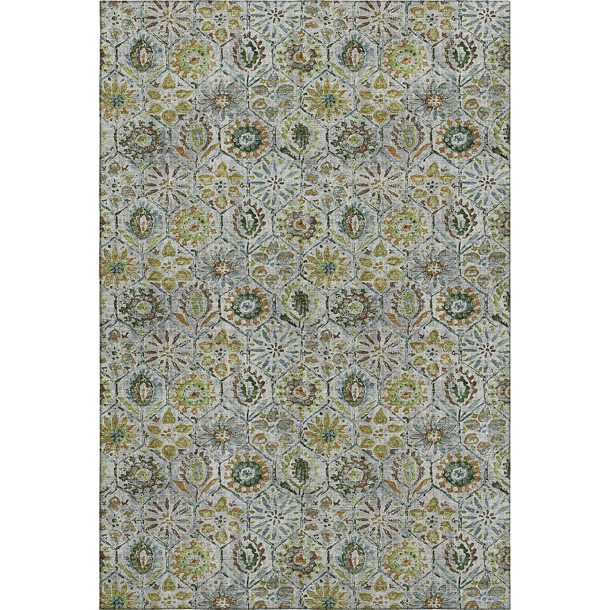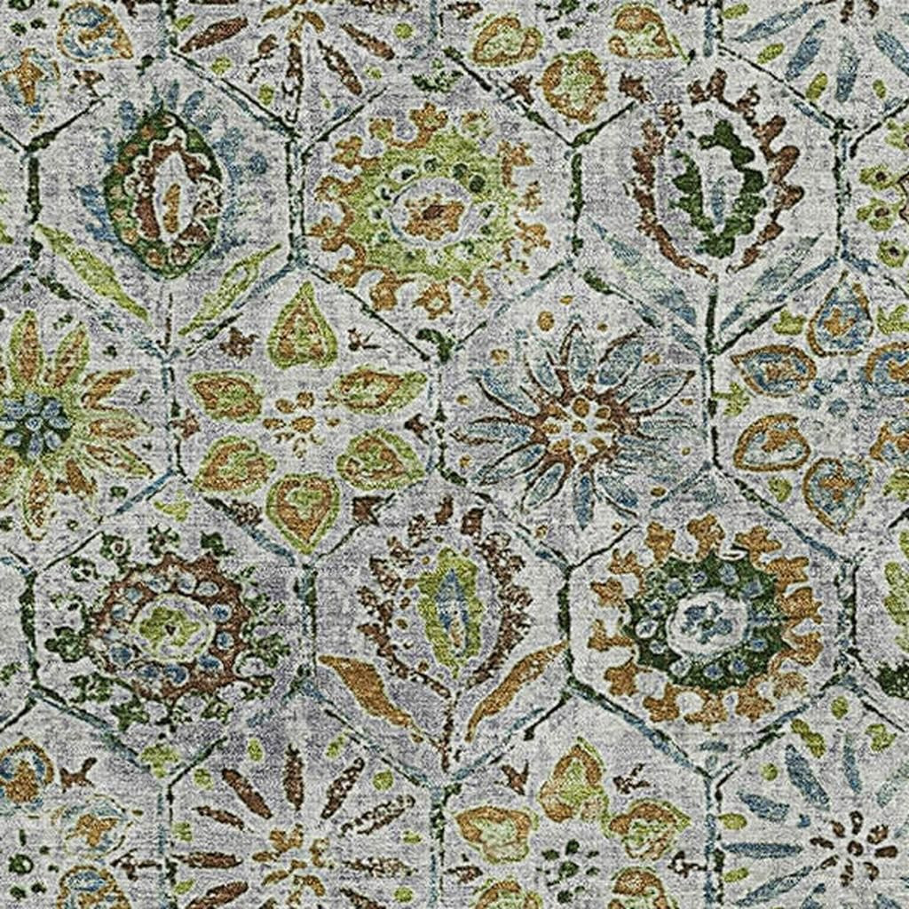 This 10-foot x 14-foot green gray and copper floral washable area rug with uv protection, is a great way to add warmth to a room. Ideal for spaces with kids and pets, this rug is stain resistant to help repel dirt and spilled liquids. Built to last, this rug crafted from polyester fibers is known for its durability and long lasting appeal. Rugs are a great way to showcase your style, hide imperfections, warm your home and reduce noise. This larger sized, transitional styled rug is ready to create a focal point or statement piece in your room. 120.00-inch h x 168.00-inch w x 0.39-inch d.