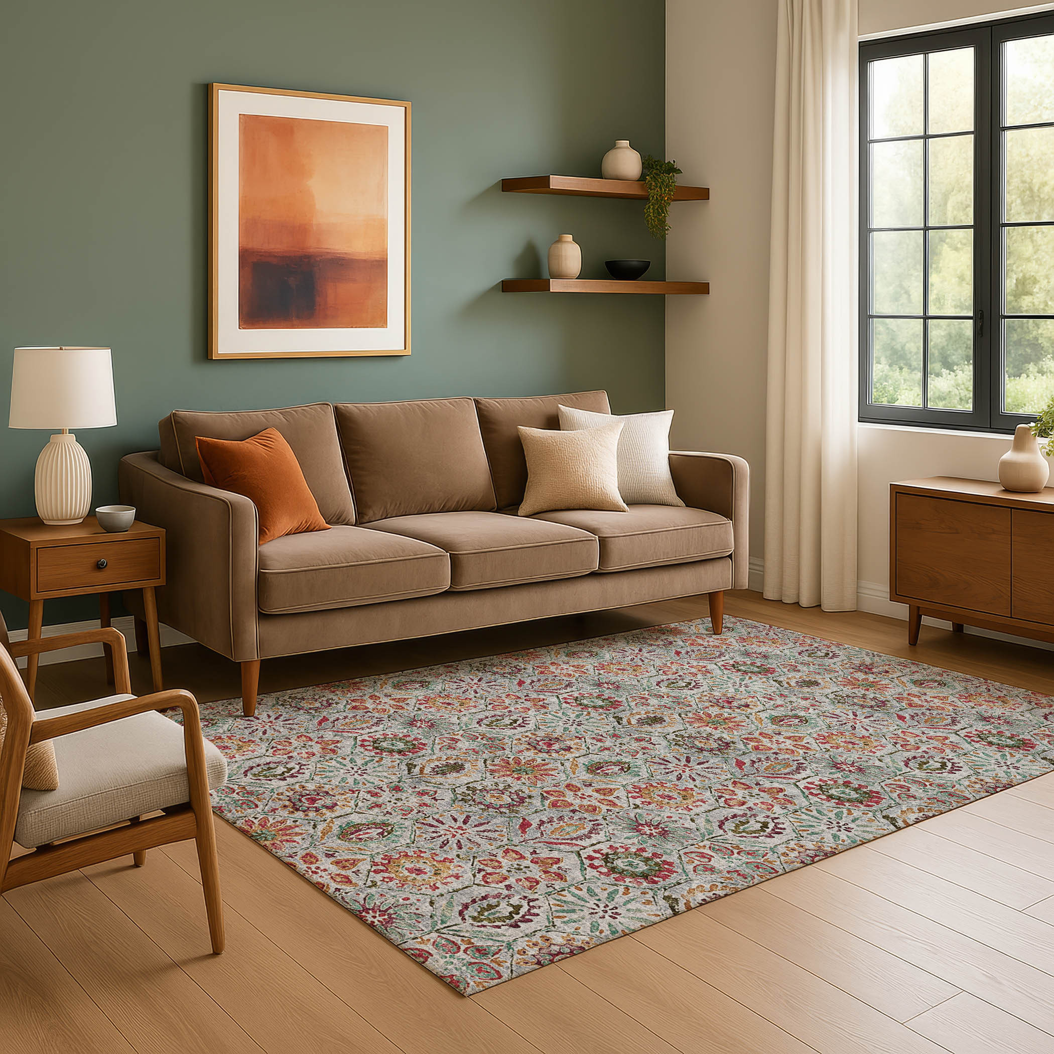 Set an inviting tone in your space with this 8-foot x 10-foot rust gray and silver floral washable area rug with uv protection. Ideal for spaces with kids and pets, this rug is stain resistant to help repel dirt and spilled liquids. Built to last, this rug crafted from polyester fibers is known for its durability and long lasting appeal. Rugs are a great way to showcase your style, hide imperfections, warm your home and reduce noise. This larger sized, transitional styled rug is ready to create a focal point or statement piece in your room. 96.00-inch h x 120.00-inch w x 0.39-inch d.