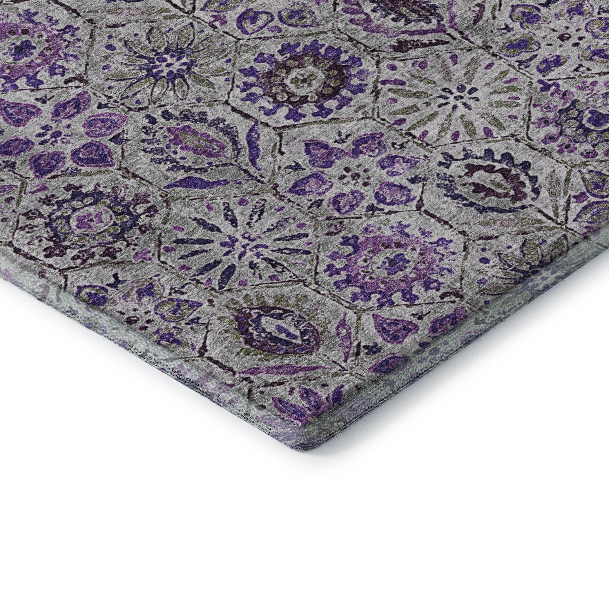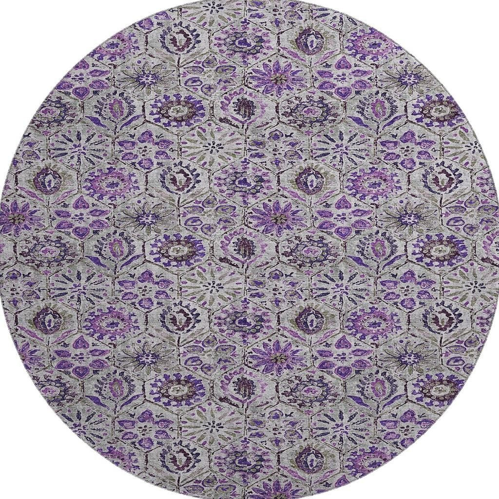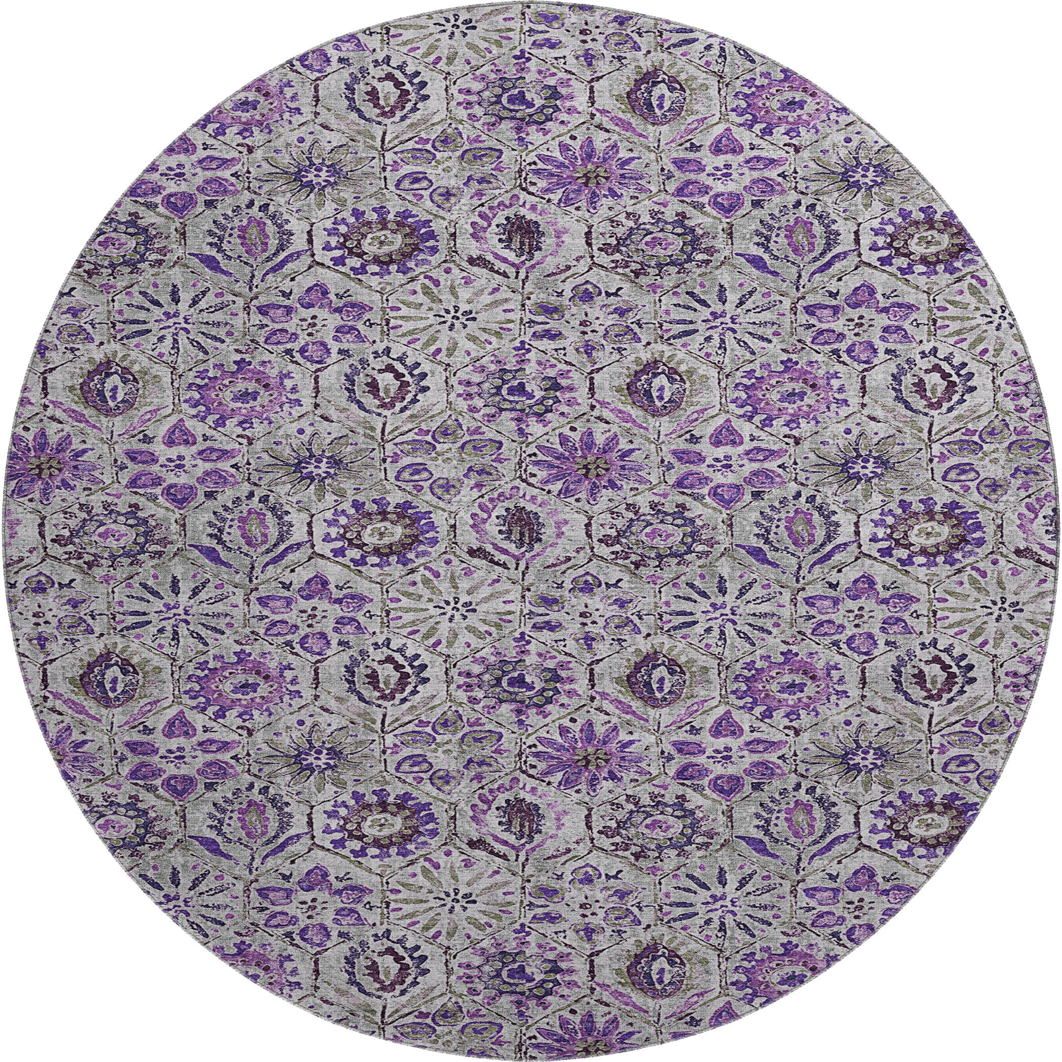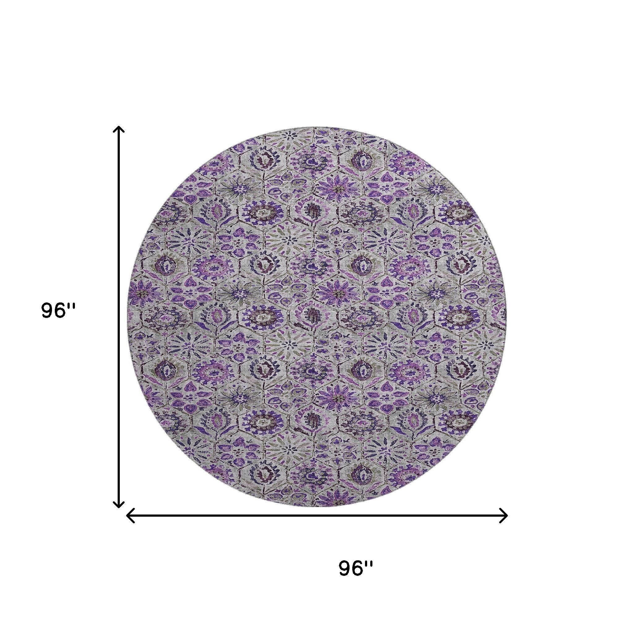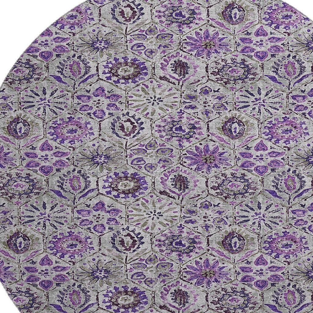 Add great coloration and comfortable texture to your space with this 8-foot purple gray and silver floral washable round rug with uv protection. Ideal for spaces with kids and pets, this rug is stain resistant to help repel dirt and spilled liquids. Built to last, this rug crafted from polyester fibers is known for its durability and long lasting appeal. Rugs are a great way to showcase your style, hide imperfections, warm your home and reduce noise. This larger sized, transitional styled rug is ready to create a focal point or statement piece in your room. 96.00-inch h x 96.00-inch w x 0.39-inch d.