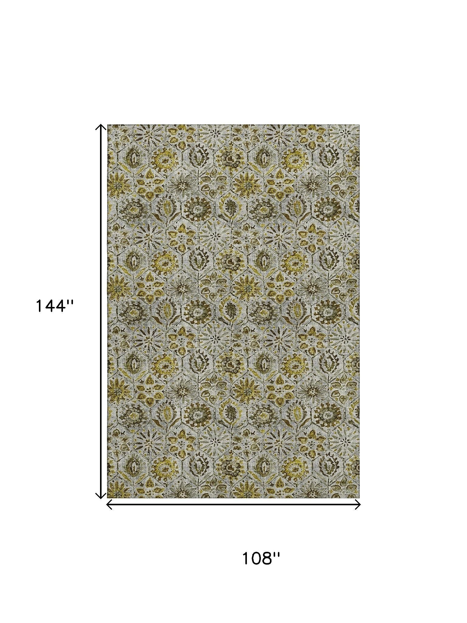 Add great coloration and comfortable texture to your space with this 9-foot x 12-foot pewter gold and gray floral washable area rug with uv protection. Ideal for spaces with kids and pets, this rug is stain resistant to help repel dirt and spilled liquids. Built to last, this rug crafted from polyester fibers is known for its durability and long lasting appeal. Rugs are a great way to showcase your style, hide imperfections, warm your home and reduce noise. This larger sized, transitional styled rug is ready to create a focal point or statement piece in your room. 108.00-inch h x 144.00-inch w x 0.39-inch d.