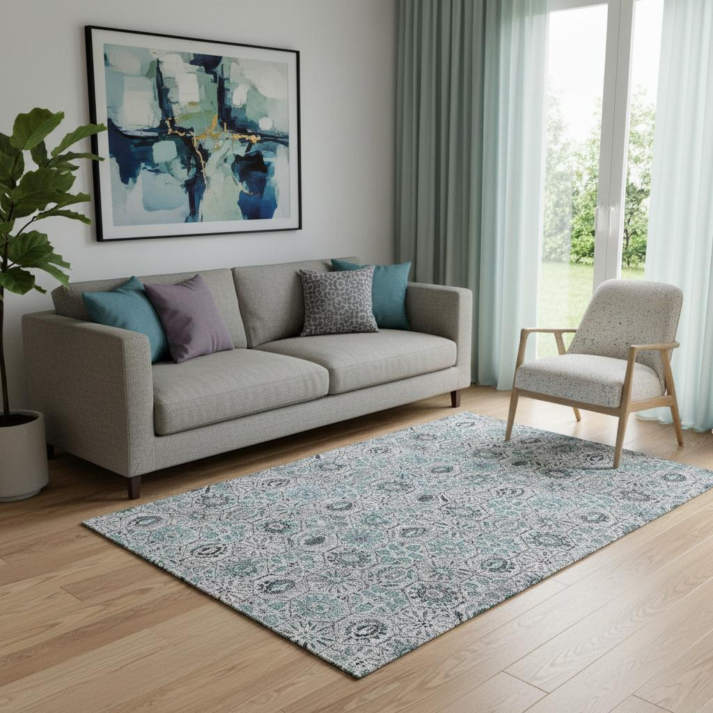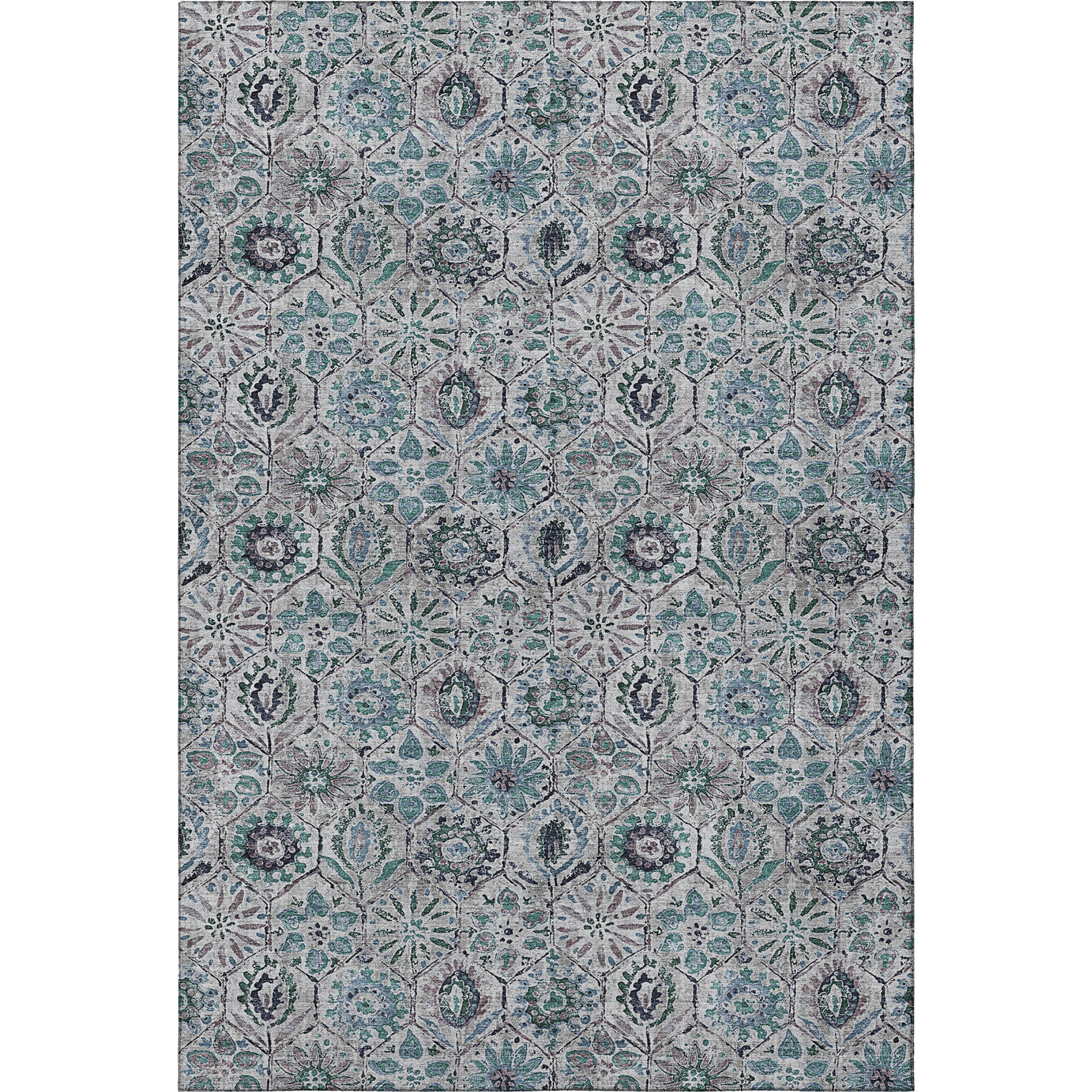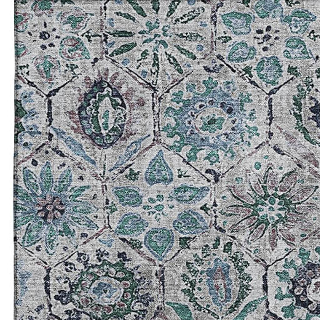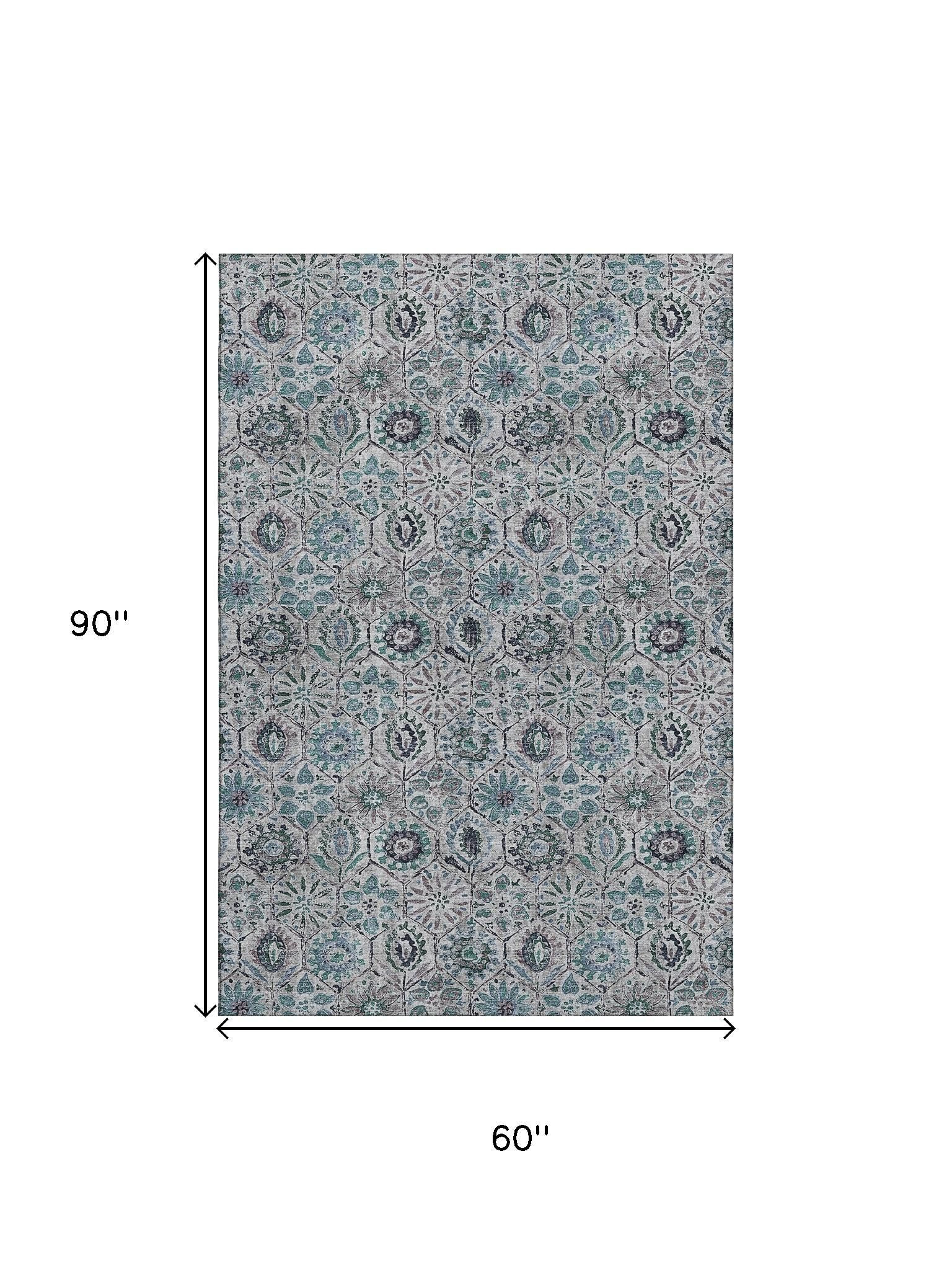 Add great coloration and comfortable texture to your space with this 5-foot x 8-foot teal gray and silver floral washable area rug with uv protection. Ideal for spaces with kids and pets, this rug is stain resistant to help repel dirt and spilled liquids. Built to last, this rug crafted from polyester fibers is known for its durability and long lasting appeal. Rugs are a great way to showcase your style, hide imperfections, warm your home and reduce noise. This larger sized, transitional styled rug is ready to create a focal point or statement piece in your room. 60.00-inch h x 90.00-inch w x 0.39-inch d.