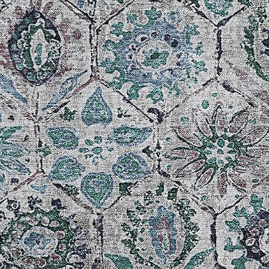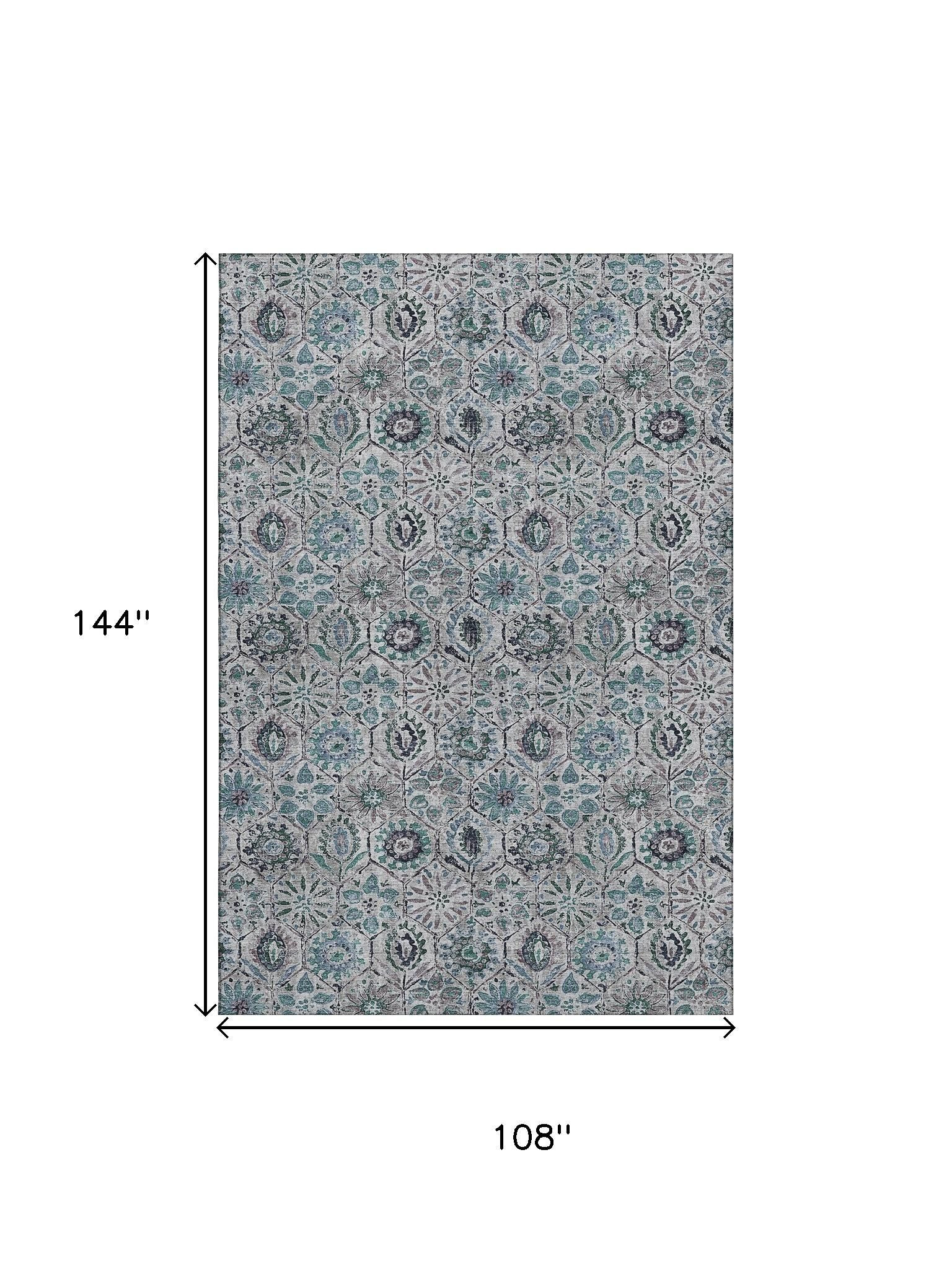 This 9-foot x 12-foot teal gray and silver floral washable area rug with uv protection, is a great way to add warmth to a room. Ideal for spaces with kids and pets, this rug is stain resistant to help repel dirt and spilled liquids. Built to last, this rug crafted from polyester fibers is known for its durability and long lasting appeal. Rugs are a great way to showcase your style, hide imperfections, warm your home and reduce noise. This larger sized, transitional styled rug is ready to create a focal point or statement piece in your room. 108.00-inch h x 144.00-inch w x 0.39-inch d.
