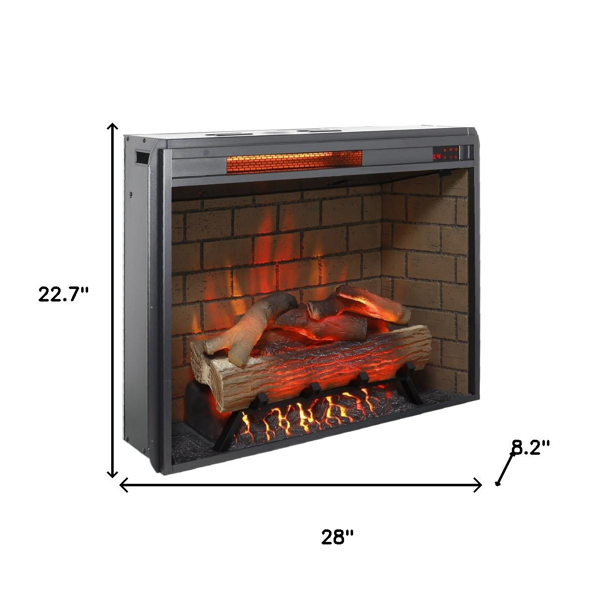 The 28-inch black metal electric fireplace adds a modern touch to any living space. Designed with electric fuel type, it provides warmth efficiently while enhancing your decor. Capable of heating an area of up to 400 square feet, this fireplace ensures comfort in both small and large gatherings. The durable metal construction not only offers a sleek look but also guarantees longevity. Enjoy the convenience of adjusting settings from a distance with the included fireplace remote, making it easy to create the perfect ambiance without leaving your seat. This stylish fireplace combines functionality and aesthetic appeal, making it an ideal focal point for cozy evenings spent indoors. 22.70-inch h x 28.00-inch w x 8.20-inch d.