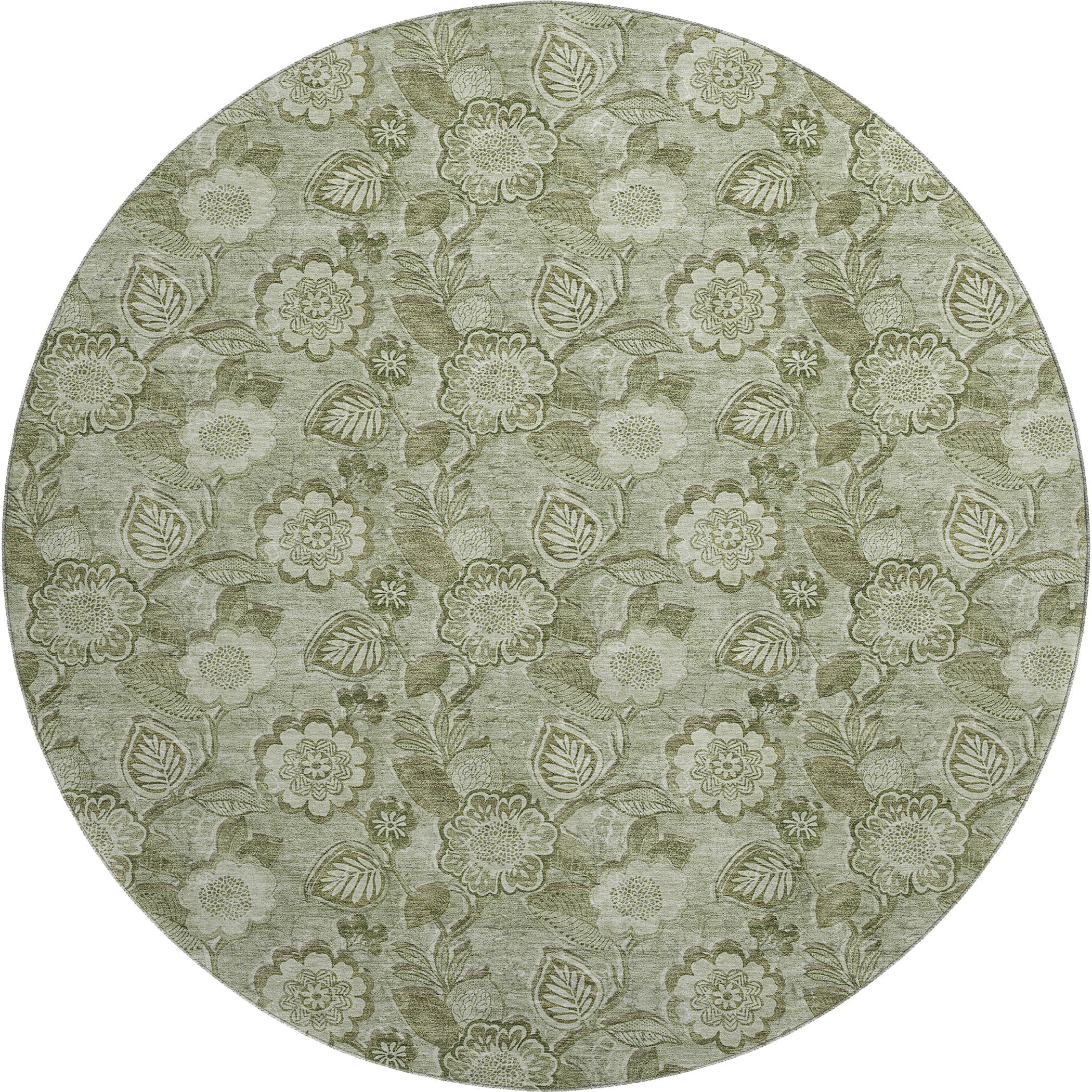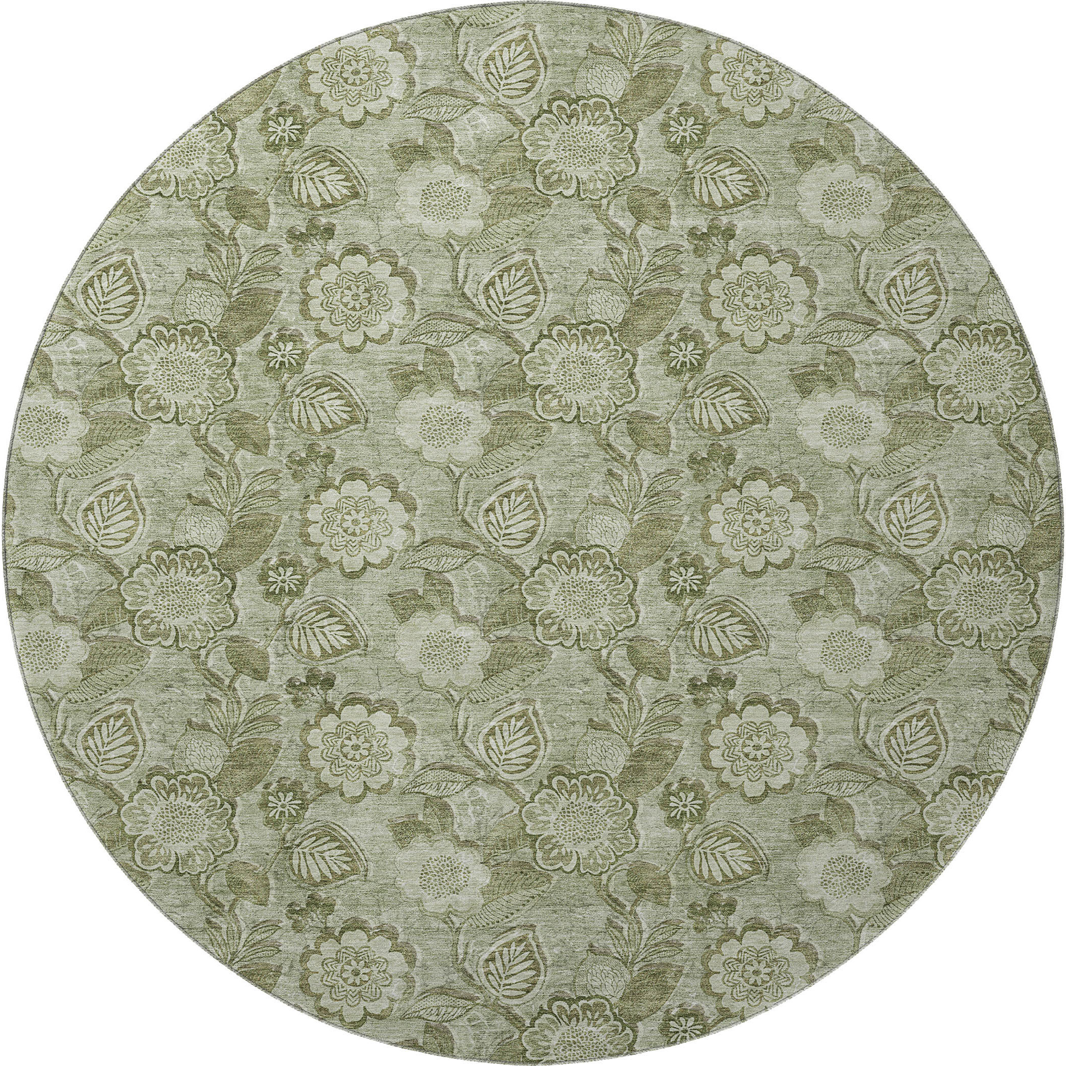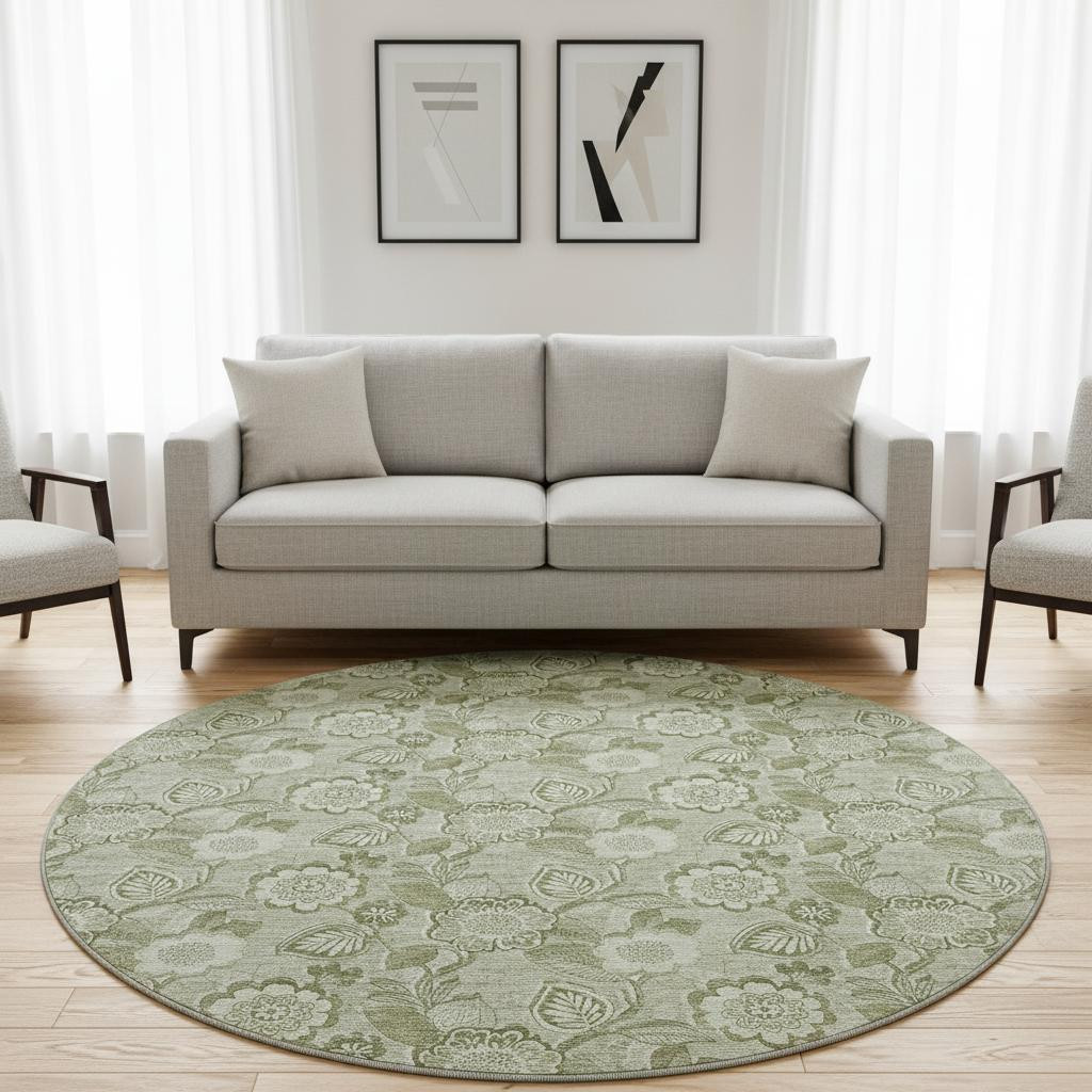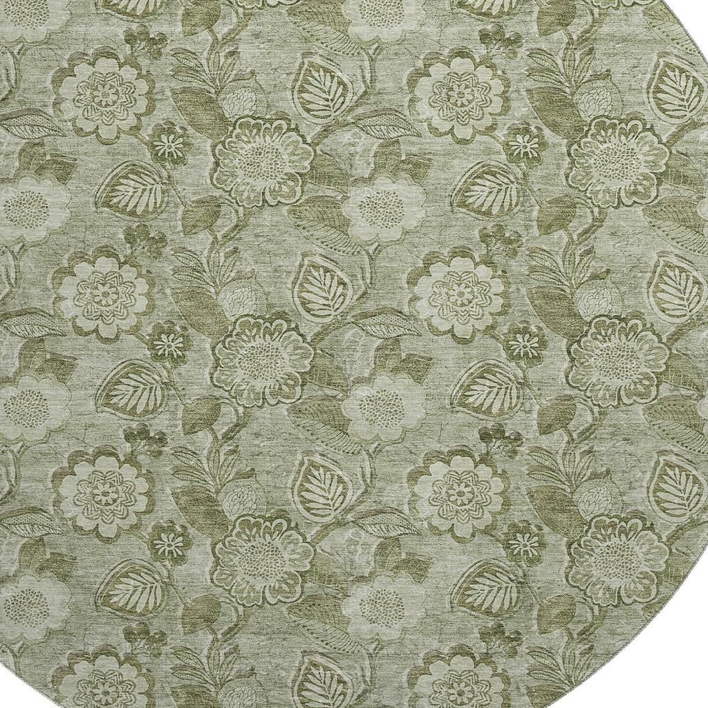 Add great coloration and comfortable texture to your space with this 8-foot artichoke green and fern green floral washable round rug with uv protection. Ideal for spaces with kids and pets, this rug is stain resistant to help repel dirt and spilled liquids. Built to last, this rug crafted from polyester fibers is known for its durability and long lasting appeal. Rugs are a great way to showcase your style, hide imperfections, warm your home and reduce noise. This larger sized, transitional styled rug is ready to create a focal point or statement piece in your room. 96.00-inch h x 96.00-inch w x 0.39-inch d.