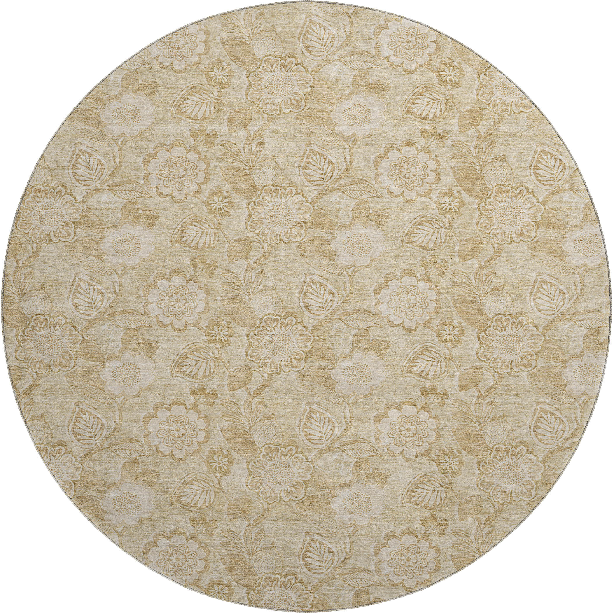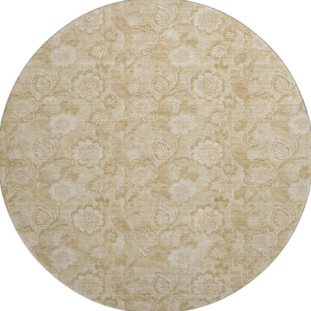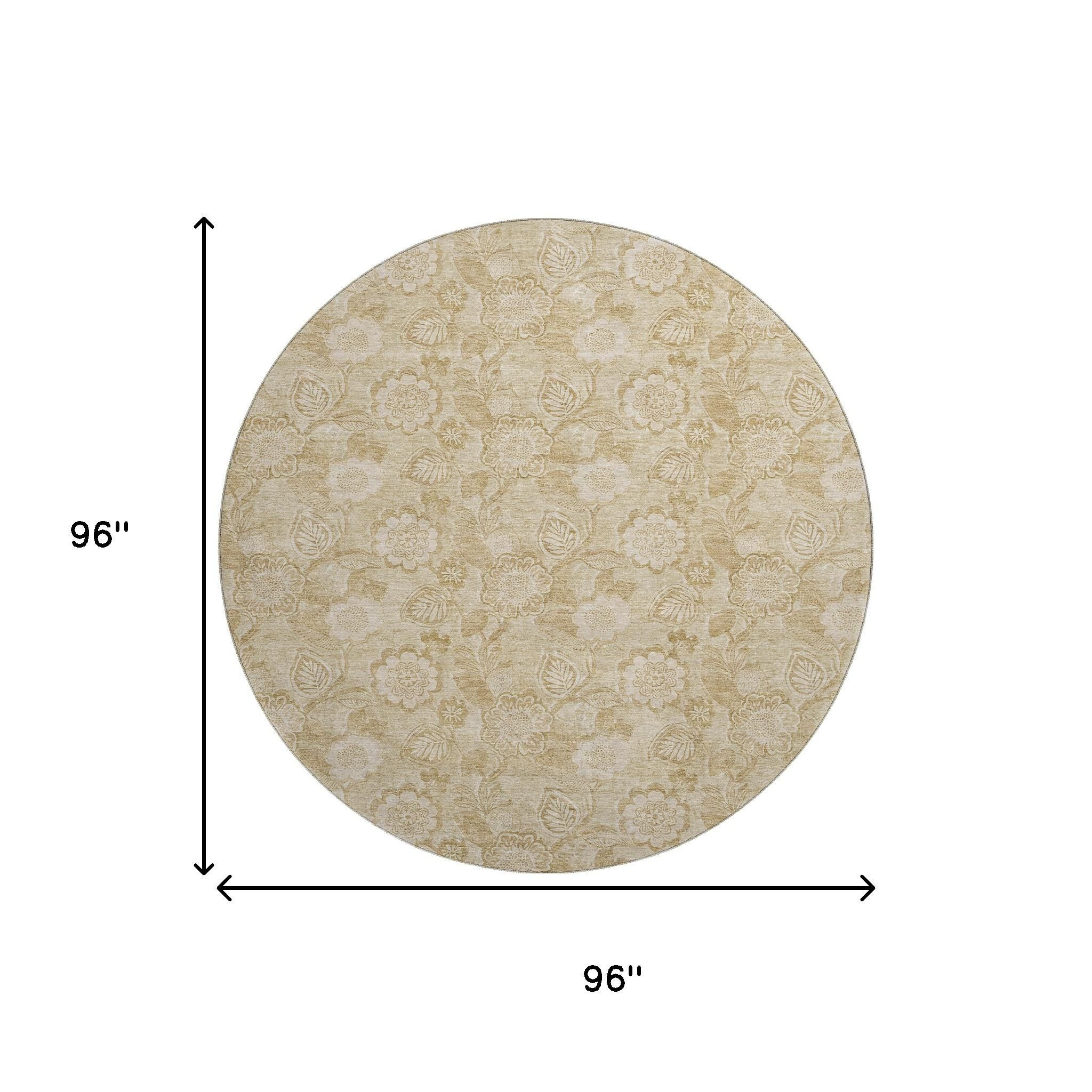 Add great coloration and comfortable texture to your space with this 8-foot beige and tan floral washable round rug with uv protection. Ideal for spaces with kids and pets, this rug is stain resistant to help repel dirt and spilled liquids. Built to last, this rug crafted from polyester fibers is known for its durability and long lasting appeal. Rugs are a great way to showcase your style, hide imperfections, warm your home and reduce noise. This larger sized, transitional styled rug is ready to create a focal point or statement piece in your room. 96.00-inch h x 96.00-inch w x 0.39-inch d.