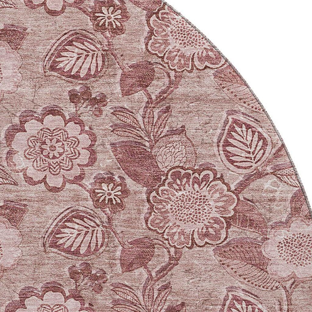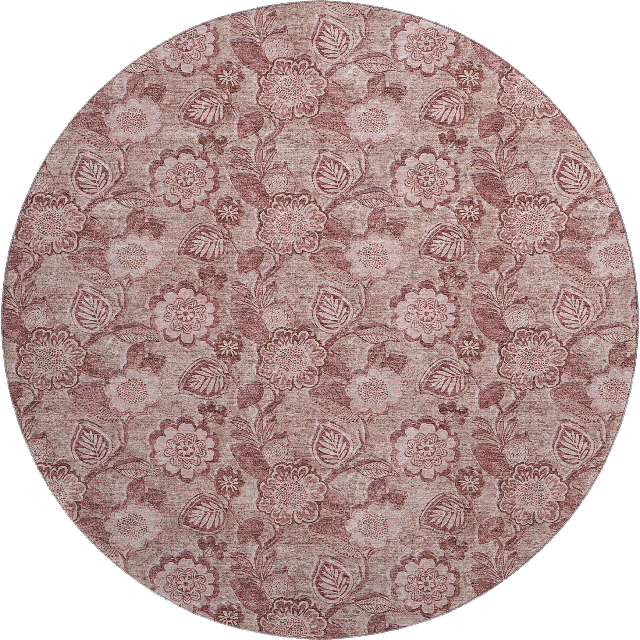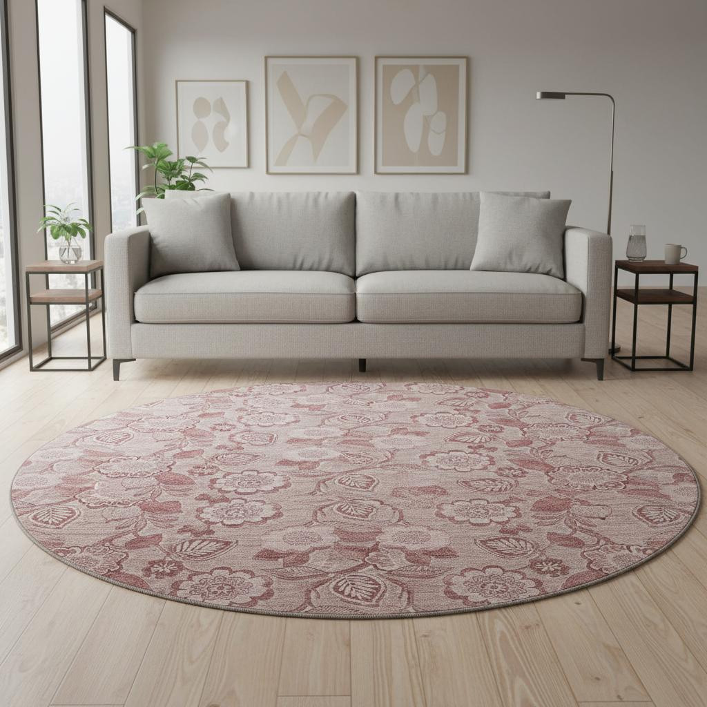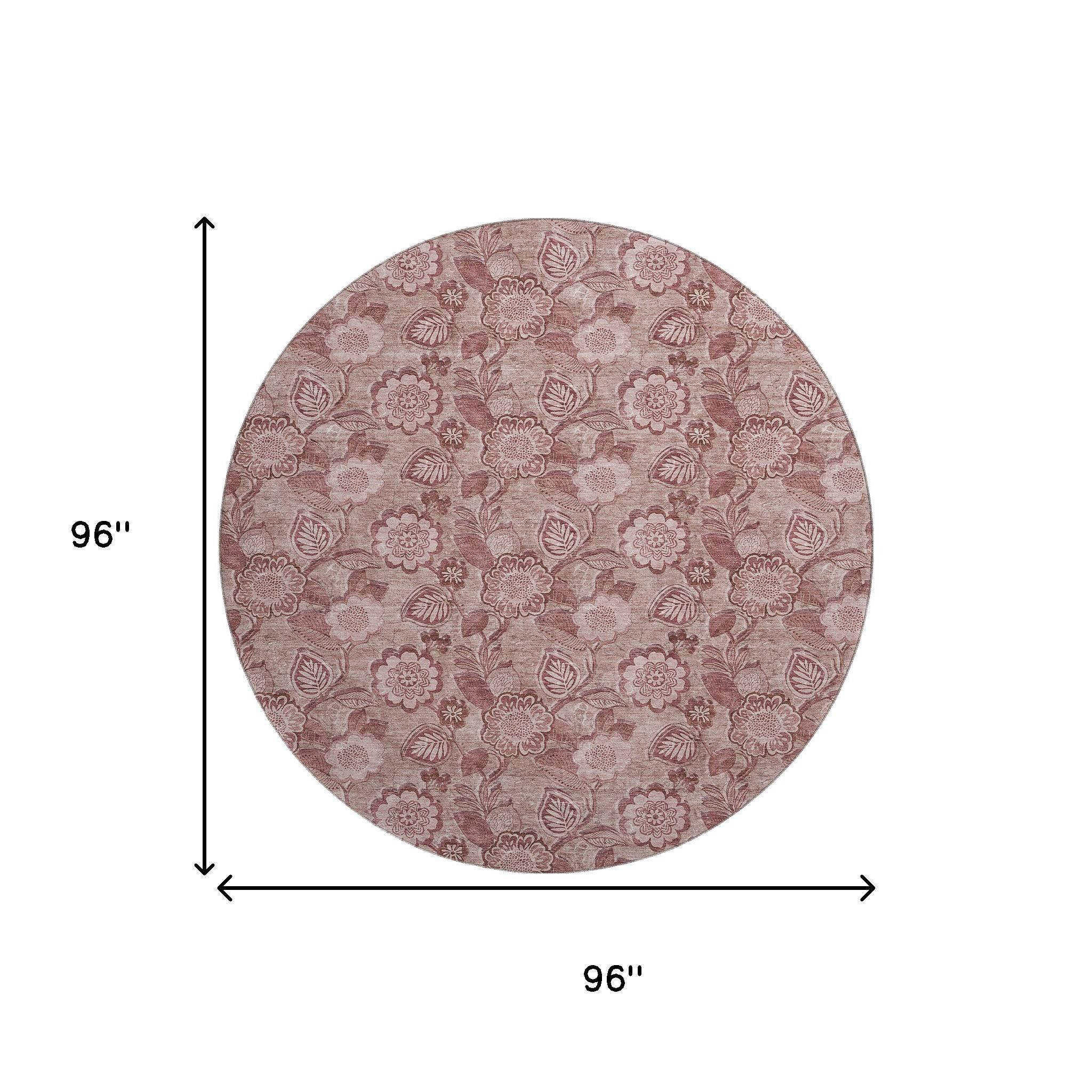 Set an inviting tone in your space with this 8-foot blush and pink floral washable round rug with uv protection. Ideal for spaces with kids and pets, this rug is stain resistant to help repel dirt and spilled liquids. Built to last, this rug crafted from polyester fibers is known for its durability and long lasting appeal. Rugs are a great way to showcase your style, hide imperfections, warm your home and reduce noise. This larger sized, transitional styled rug is ready to create a focal point or statement piece in your room. 96.00-inch h x 96.00-inch w x 0.39-inch d.