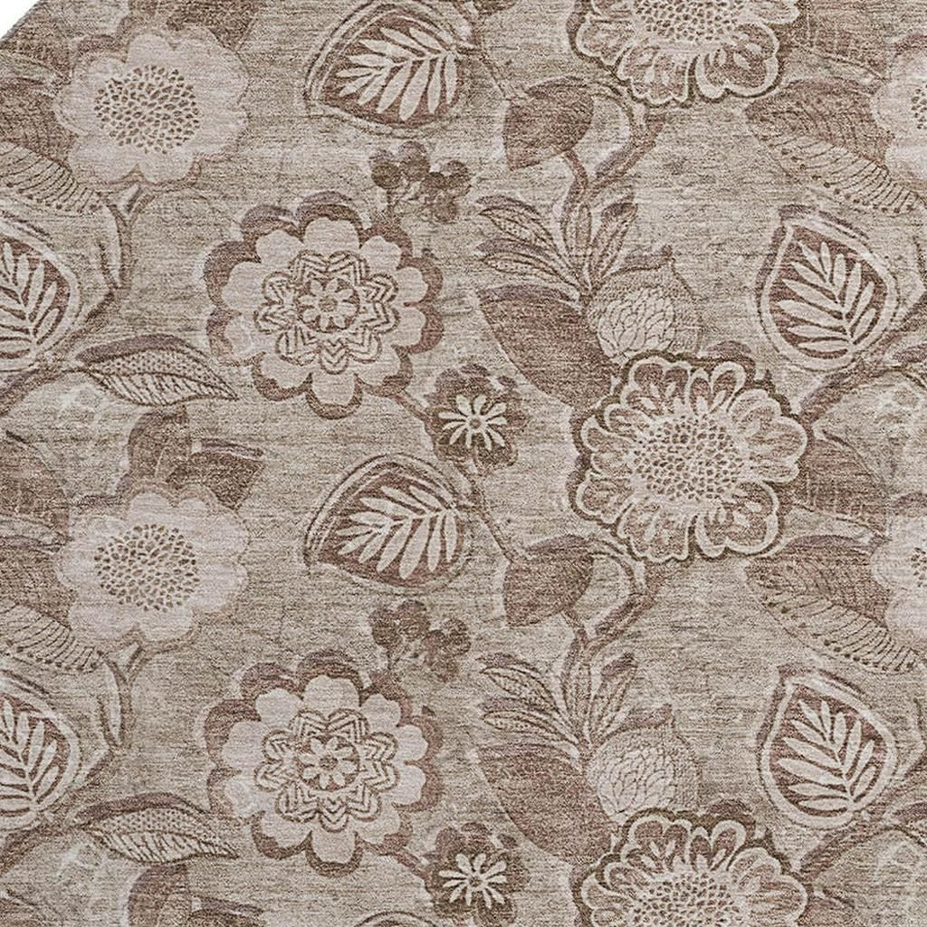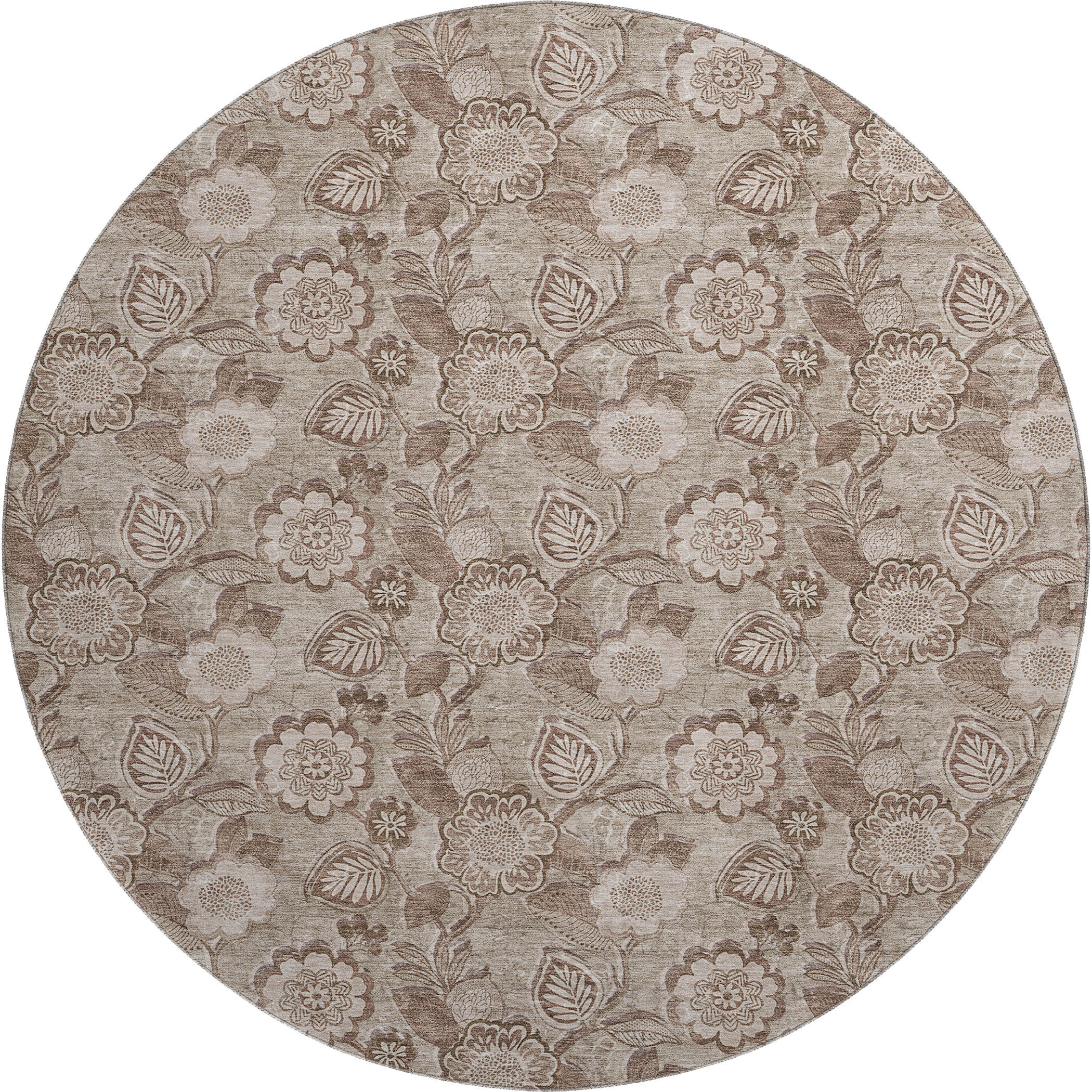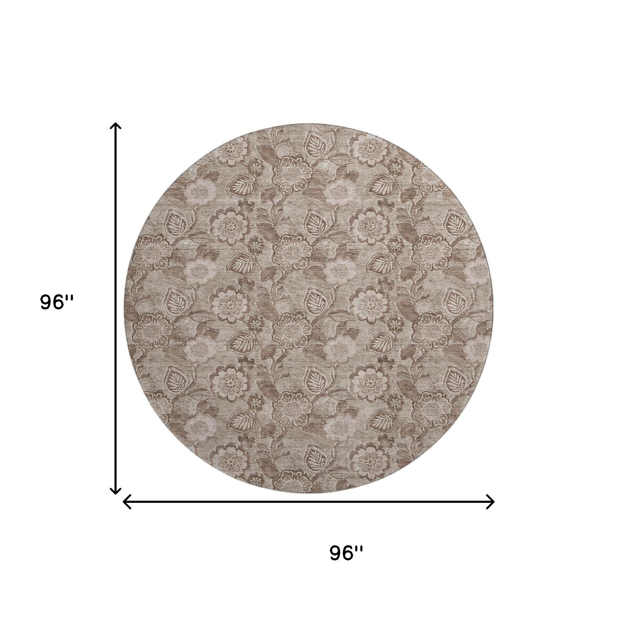 Add some artistry to your room with this 8-foot brown and taupe floral washable round rug with uv protection. Ideal for spaces with kids and pets, this rug is stain resistant to help repel dirt and spilled liquids. Built to last, this rug crafted from polyester fibers is known for its durability and long lasting appeal. Rugs are a great way to showcase your style, hide imperfections, warm your home and reduce noise. This larger sized, transitional styled rug is ready to create a focal point or statement piece in your room. 96.00-inch h x 96.00-inch w x 0.39-inch d.