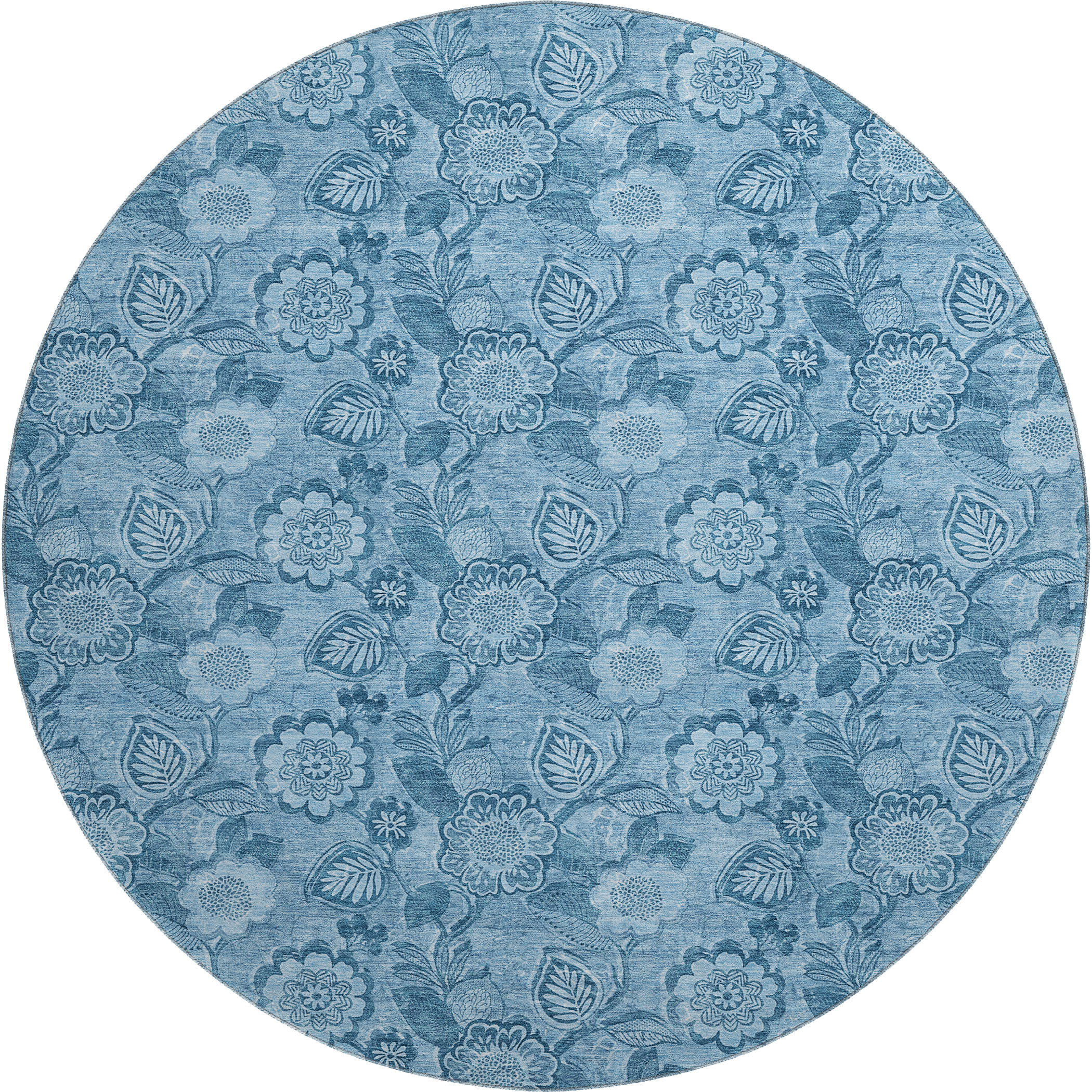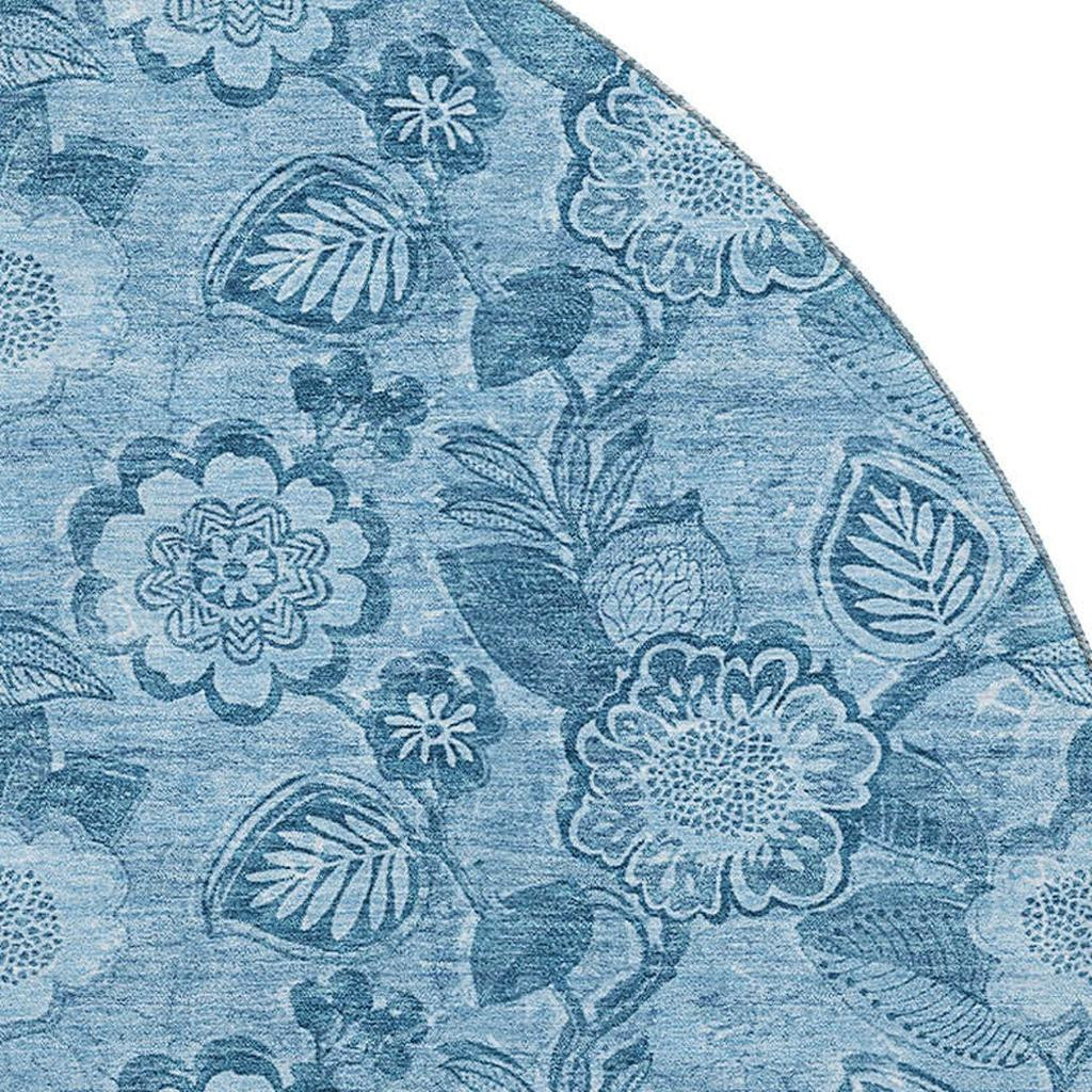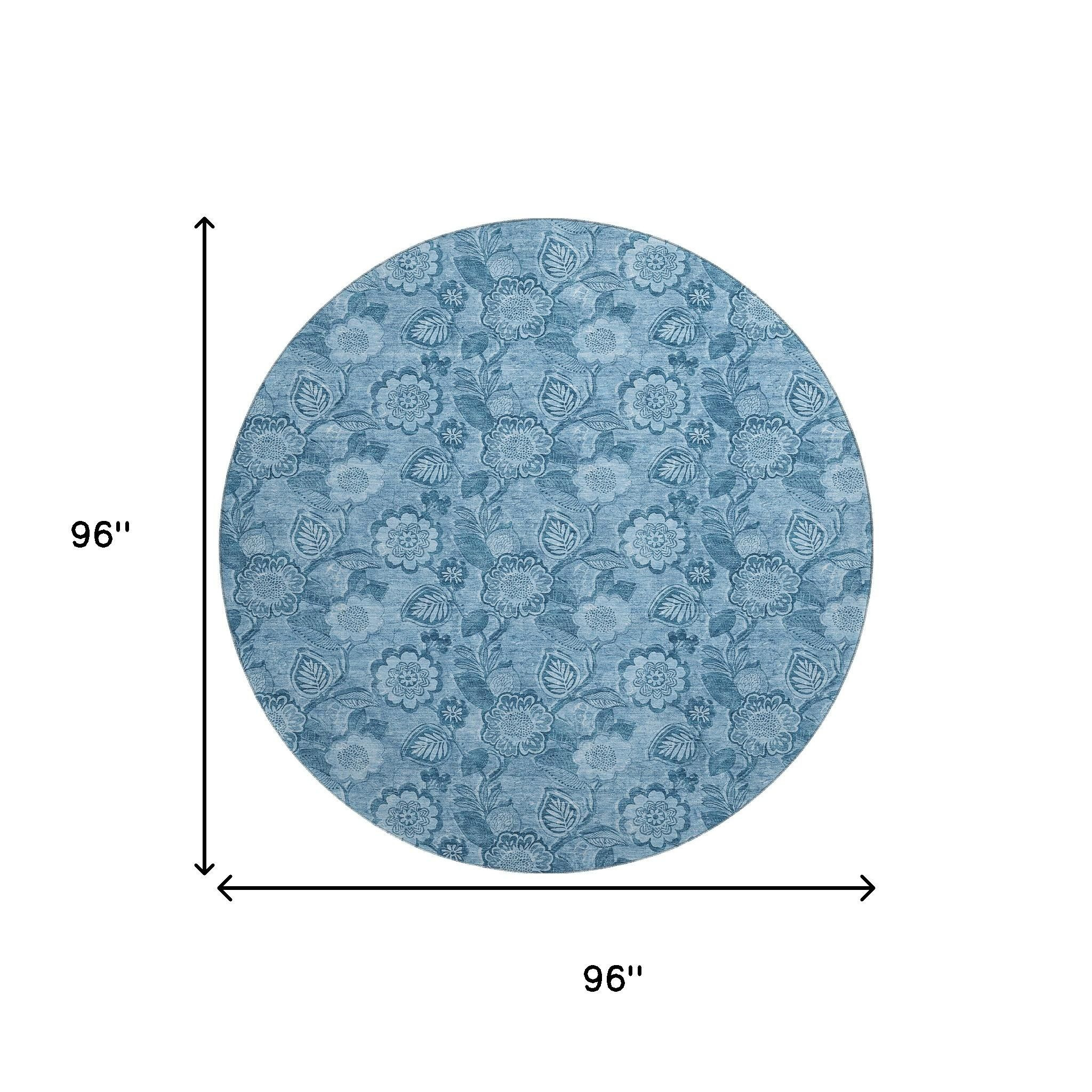 Add great coloration and comfortable texture to your space with this 8-foot blue and sky blue floral washable round rug with uv protection. Ideal for spaces with kids and pets, this rug is stain resistant to help repel dirt and spilled liquids. Built to last, this rug crafted from polyester fibers is known for its durability and long lasting appeal. Rugs are a great way to showcase your style, hide imperfections, warm your home and reduce noise. This larger sized, transitional styled rug is ready to create a focal point or statement piece in your room. 96.00-inch h x 96.00-inch w x 0.39-inch d.