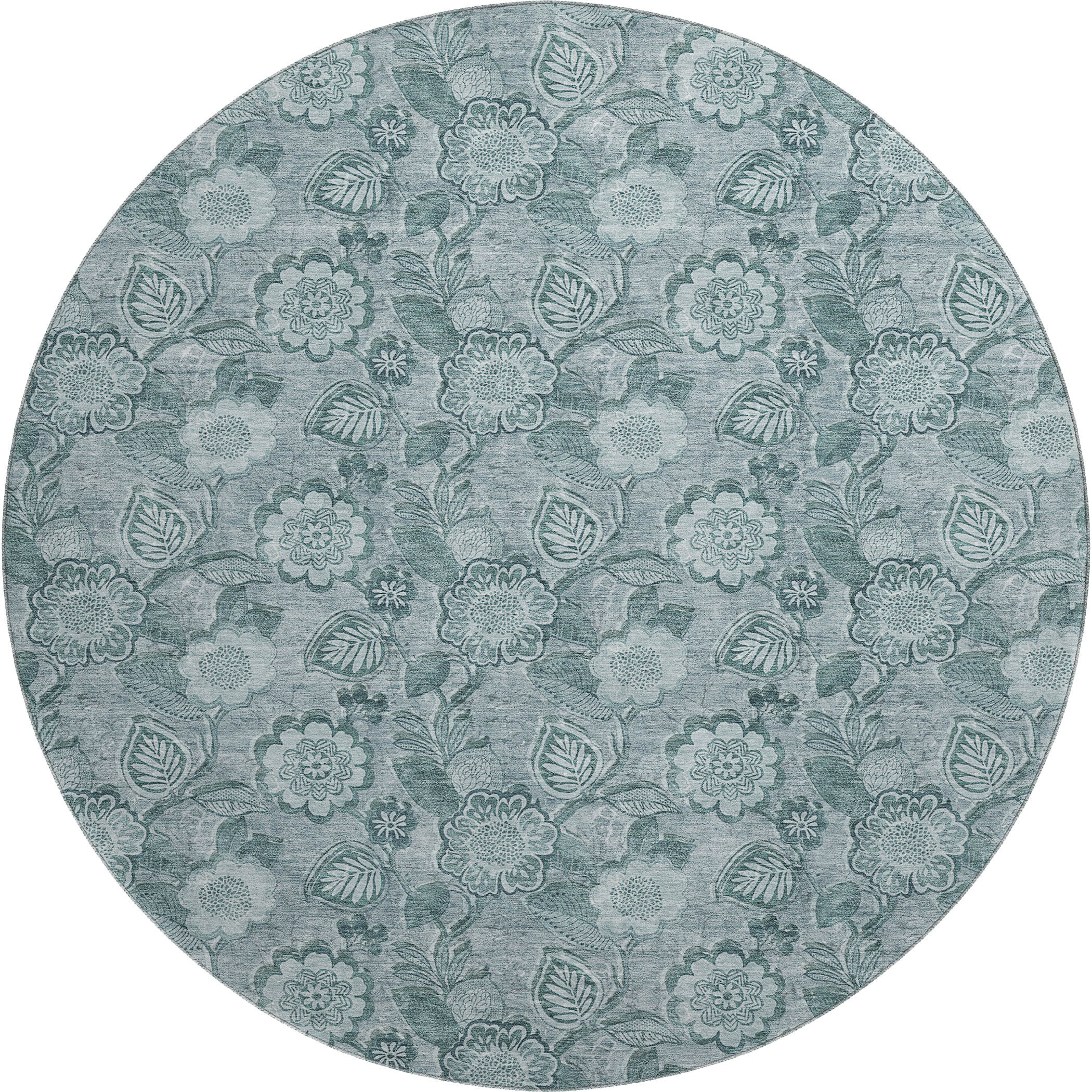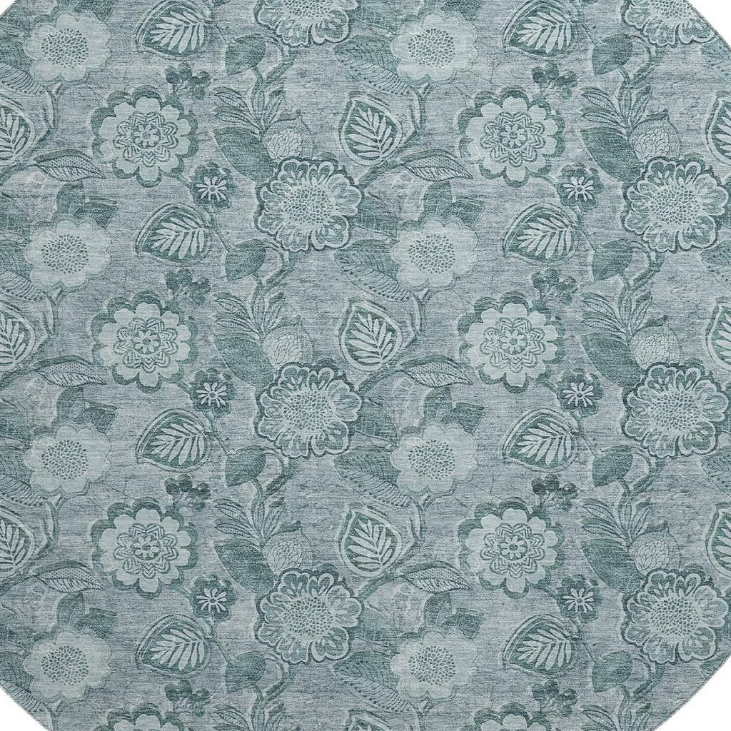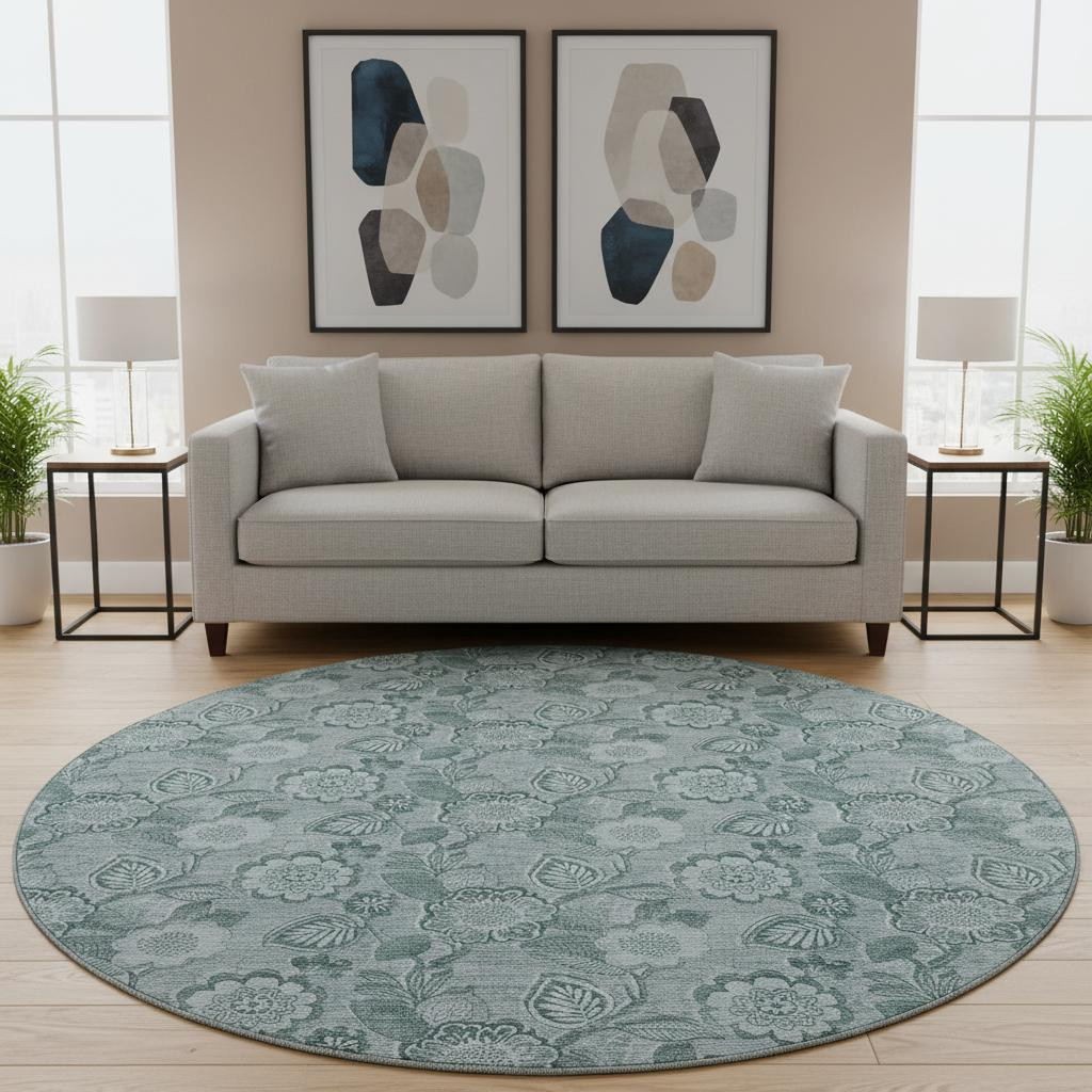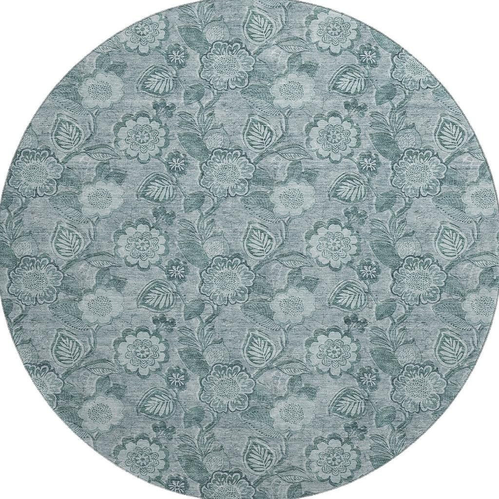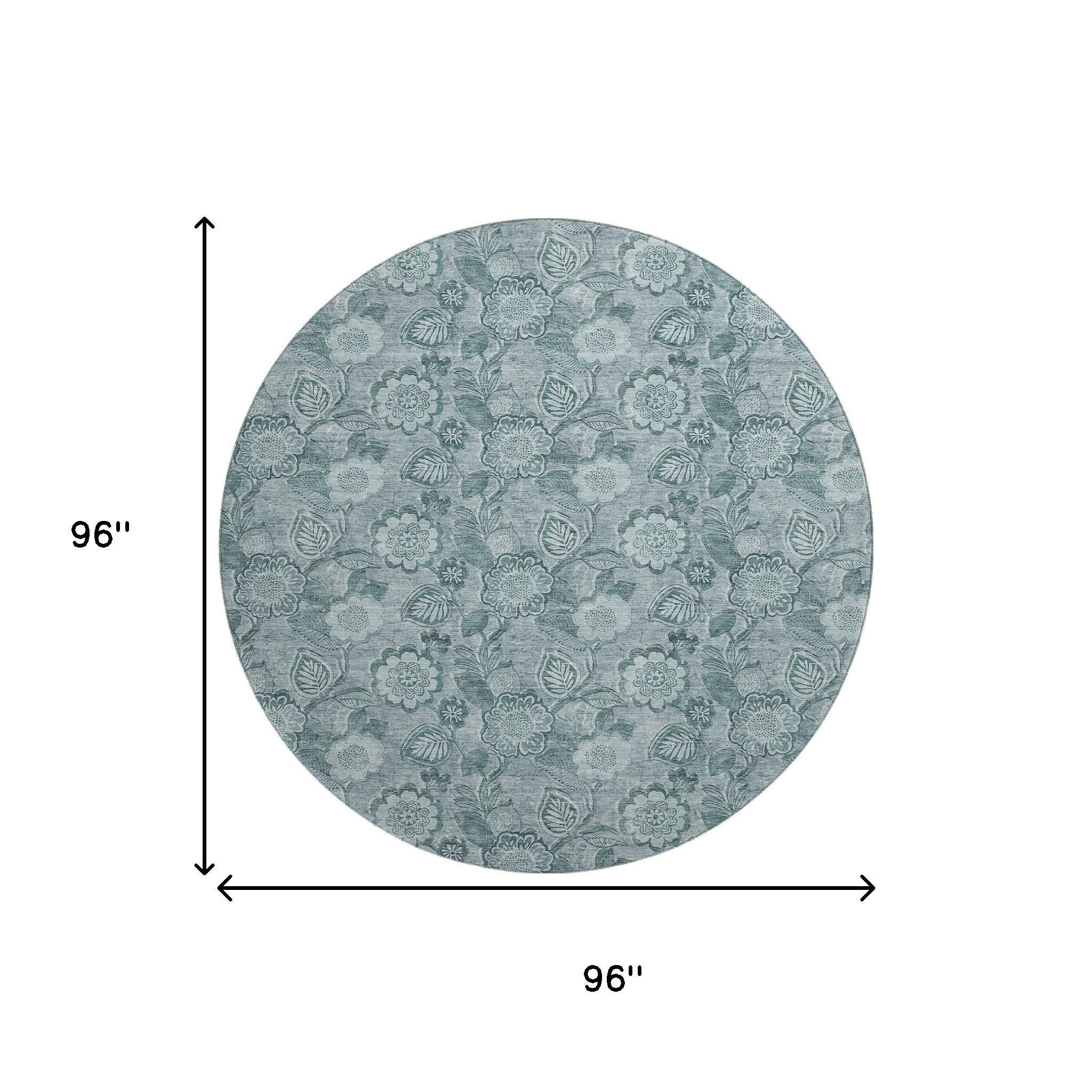 This 8-foot teal and aqua floral washable round rug with uv protection, is a great way to add warmth to a room. Ideal for spaces with kids and pets, this rug is stain resistant to help repel dirt and spilled liquids. Built to last, this rug crafted from polyester fibers is known for its durability and long lasting appeal. Rugs are a great way to showcase your style, hide imperfections, warm your home and reduce noise. This larger sized, transitional styled rug is ready to create a focal point or statement piece in your room. 96.00-inch h x 96.00-inch w x 0.39-inch d.