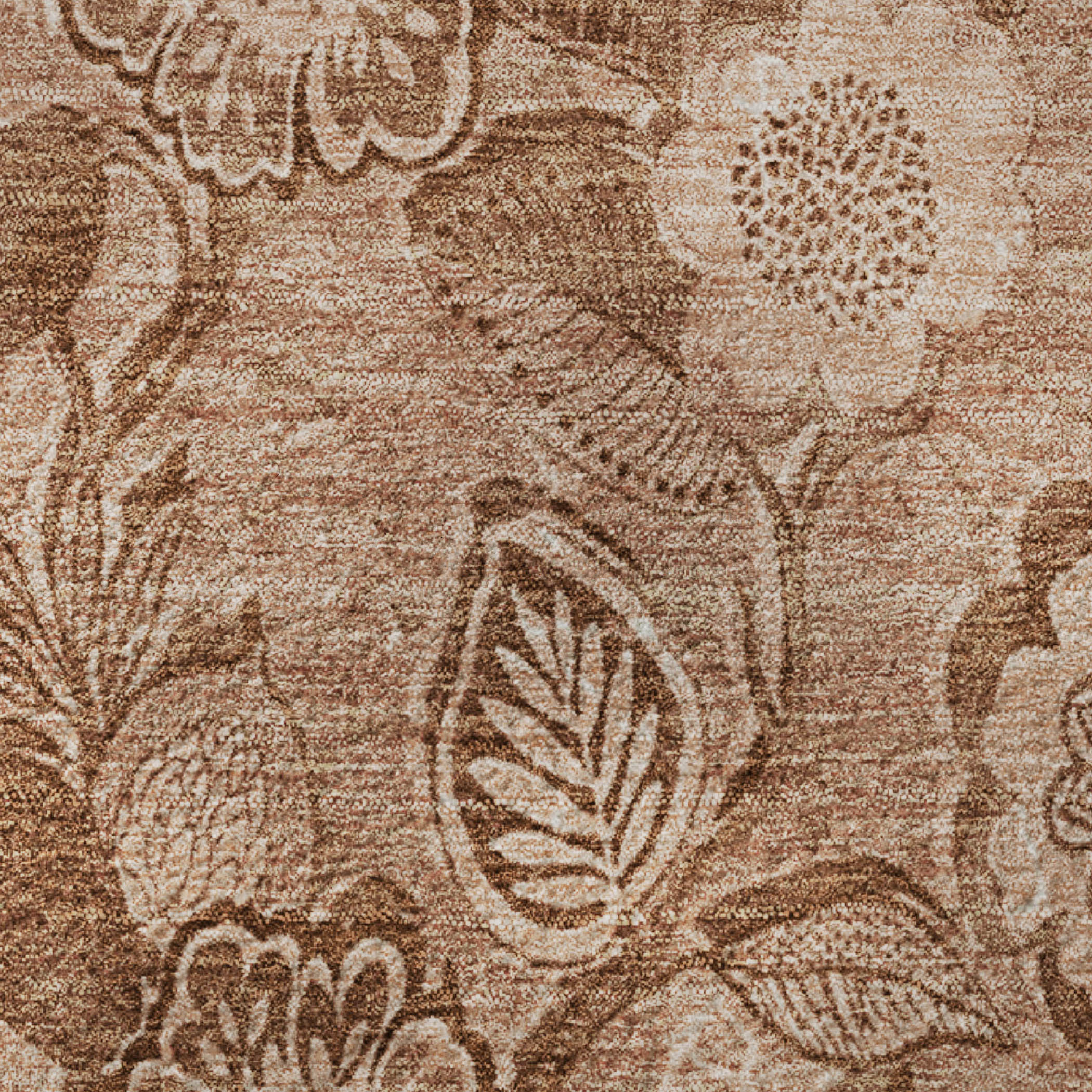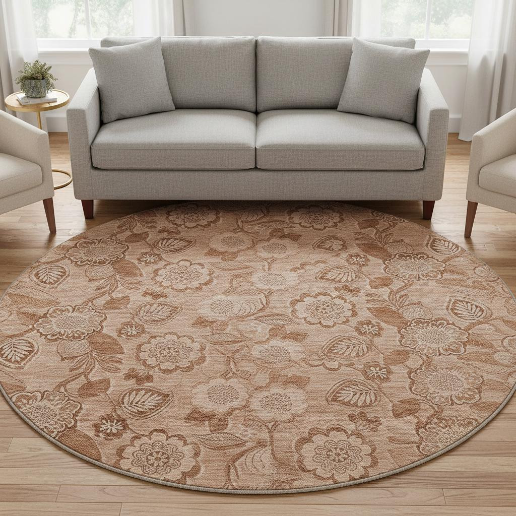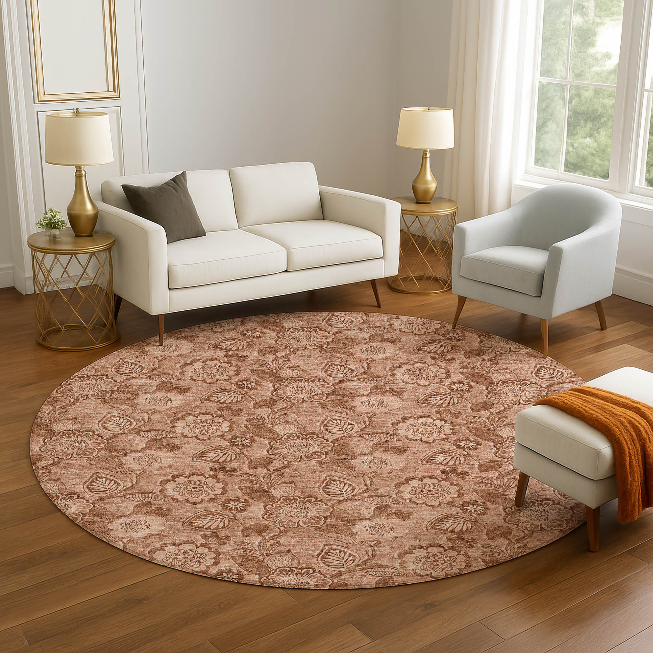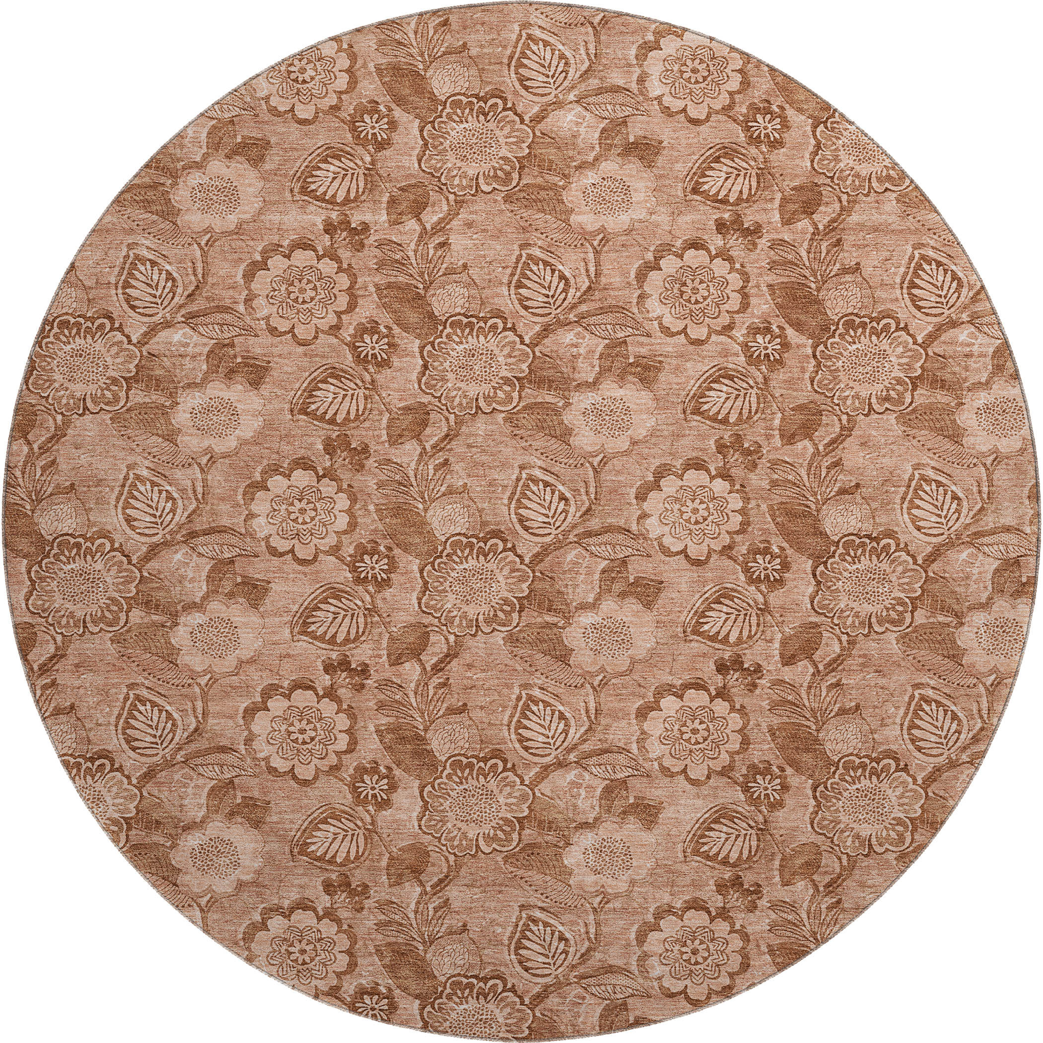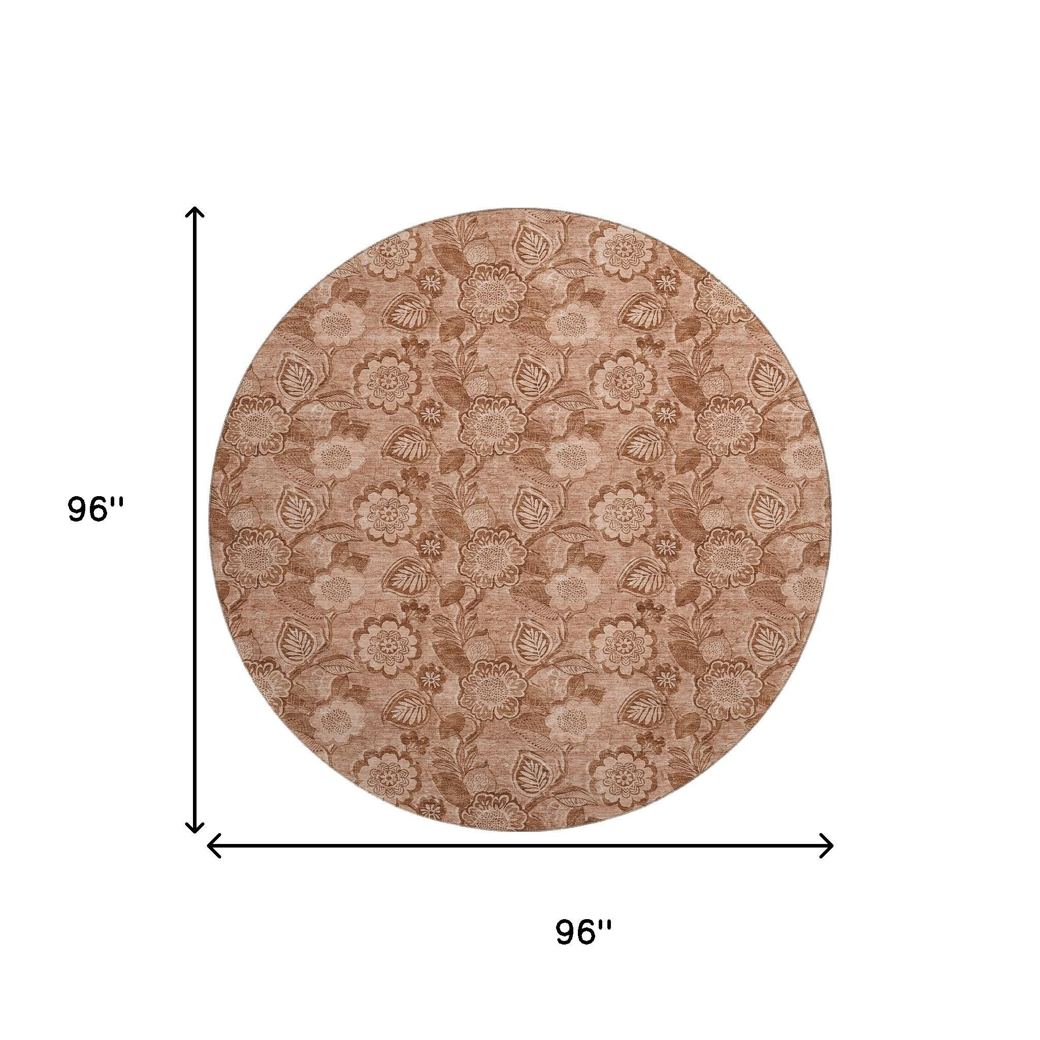 This 8-foot terra cotta and copper floral washable round rug with uv protection, is a great way to add warmth to a room. Ideal for spaces with kids and pets, this rug is stain resistant to help repel dirt and spilled liquids. Built to last, this rug crafted from polyester fibers is known for its durability and long lasting appeal. Rugs are a great way to showcase your style, hide imperfections, warm your home and reduce noise. This larger sized, transitional styled rug is ready to create a focal point or statement piece in your room. 96.00-inch h x 96.00-inch w x 0.39-inch d.