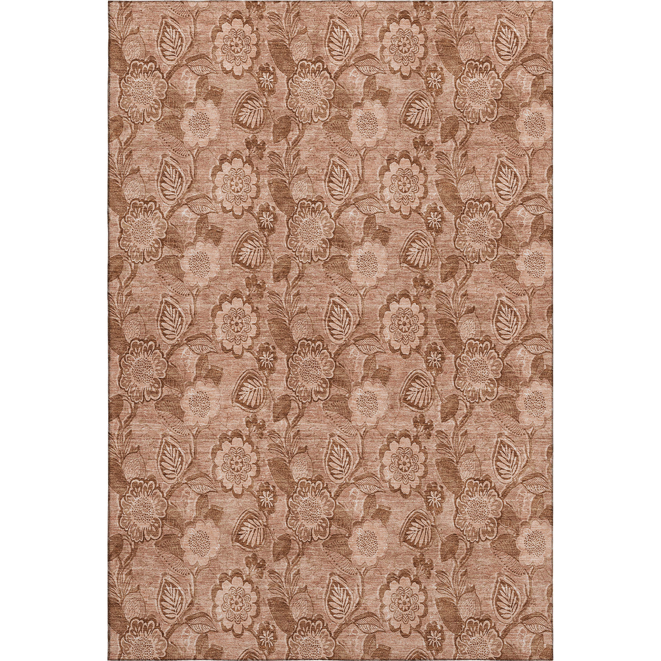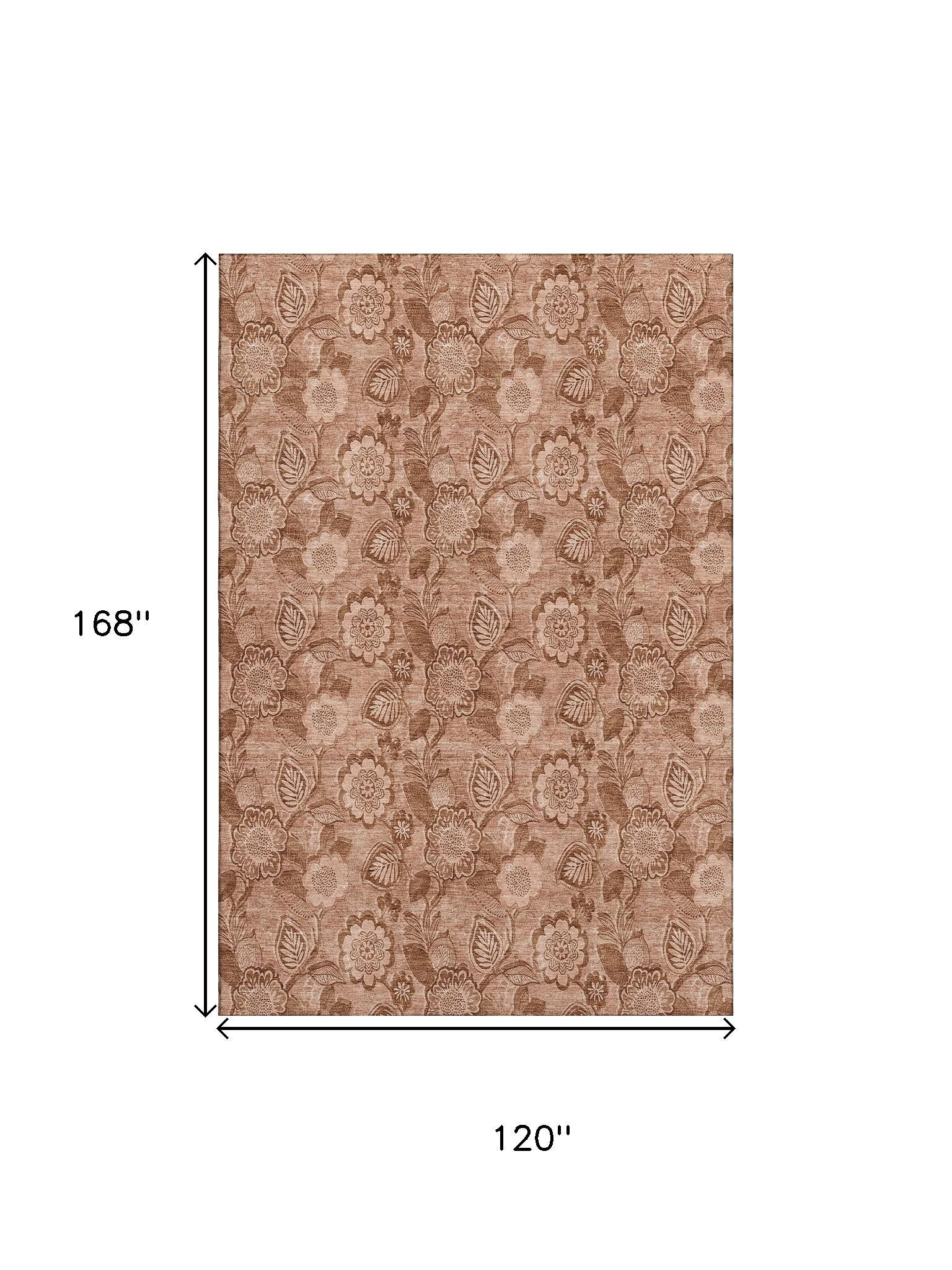 Add great coloration and comfortable texture to your space with this 10-foot x 14-foot terra cotta and copper floral washable area rug with uv protection. Ideal for spaces with kids and pets, this rug is stain resistant to help repel dirt and spilled liquids. Built to last, this rug crafted from polyester fibers is known for its durability and long lasting appeal. Rugs are a great way to showcase your style, hide imperfections, warm your home and reduce noise. This larger sized, transitional styled rug is ready to create a focal point or statement piece in your room. 120.00-inch h x 168.00-inch w x 0.39-inch d.