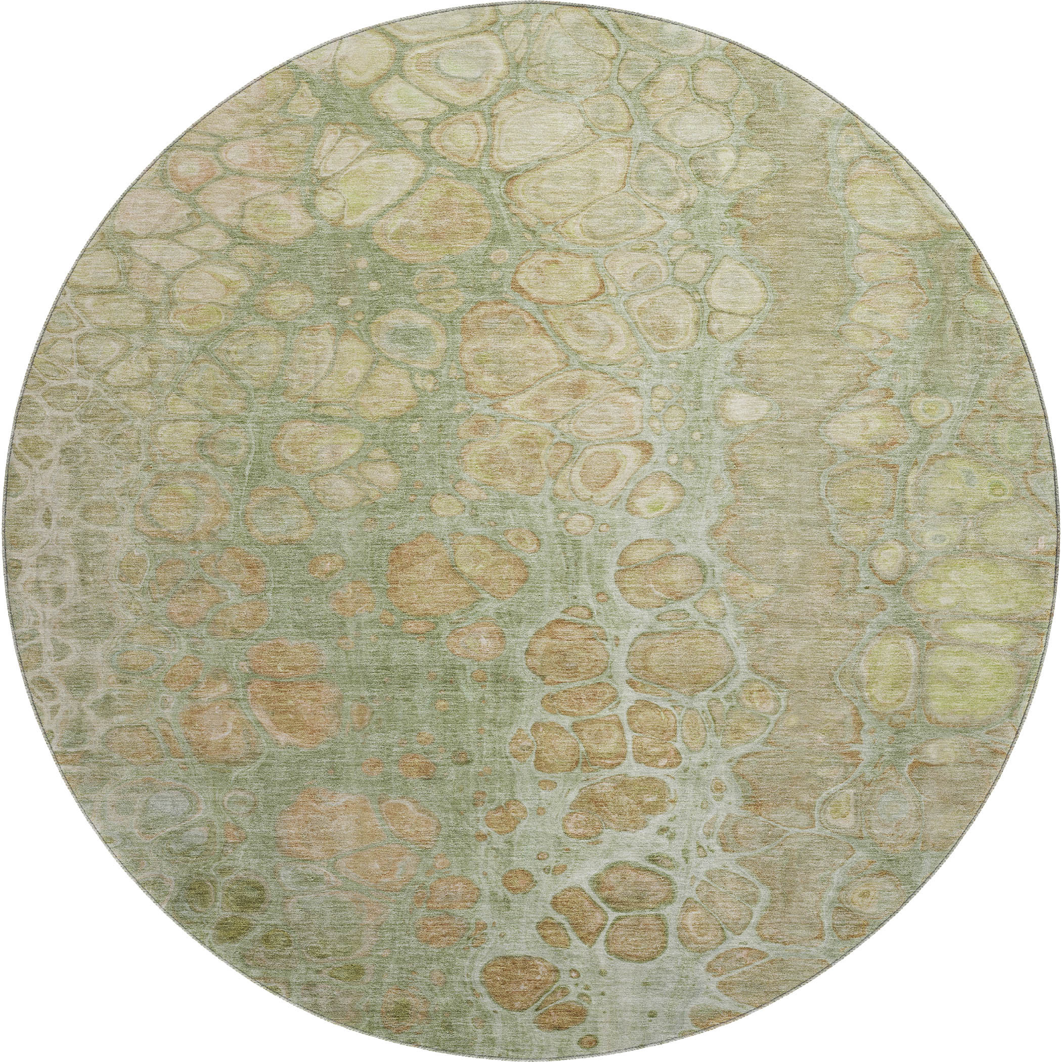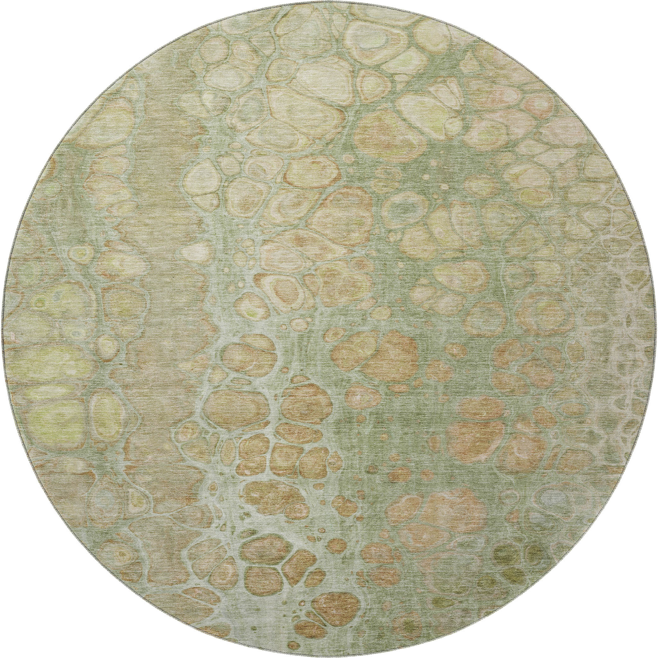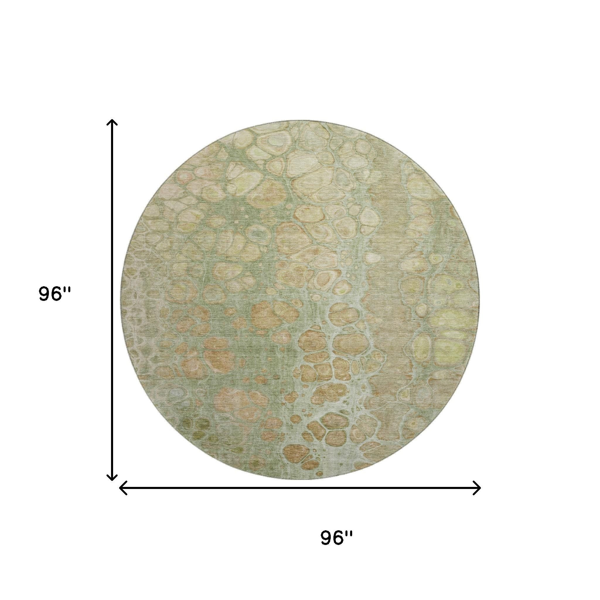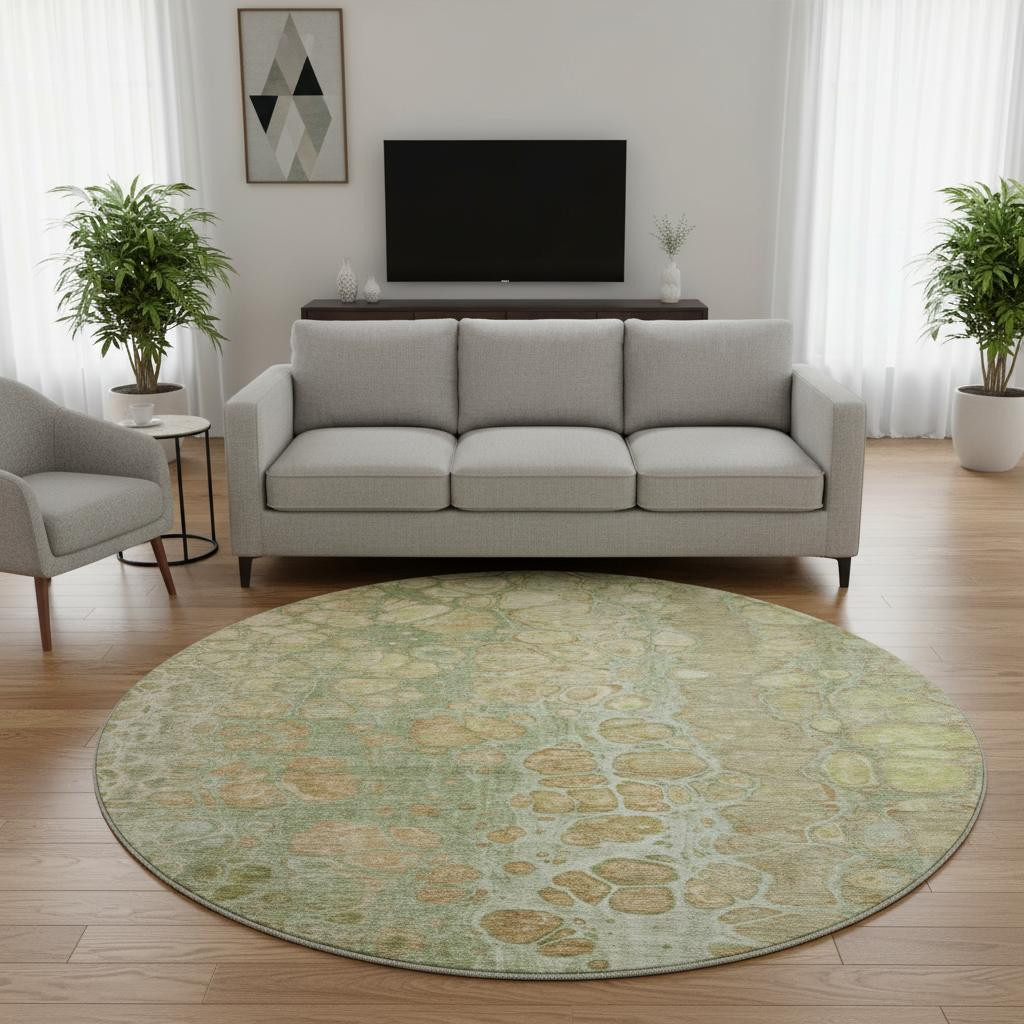 This 8-foot artichoke green gray and beige abstract washable round rug with uv protection, is a great way to add warmth to a room. Ideal for spaces with kids and pets, this rug is stain resistant to help repel dirt and spilled liquids. Built to last, this rug crafted from polyester fibers is known for its durability and long lasting appeal. Rugs are a great way to showcase your style, hide imperfections, warm your home and reduce noise. This larger sized, transitional styled rug is ready to create a focal point or statement piece in your room. 96.00-inch h x 96.00-inch w x 0.39-inch d.