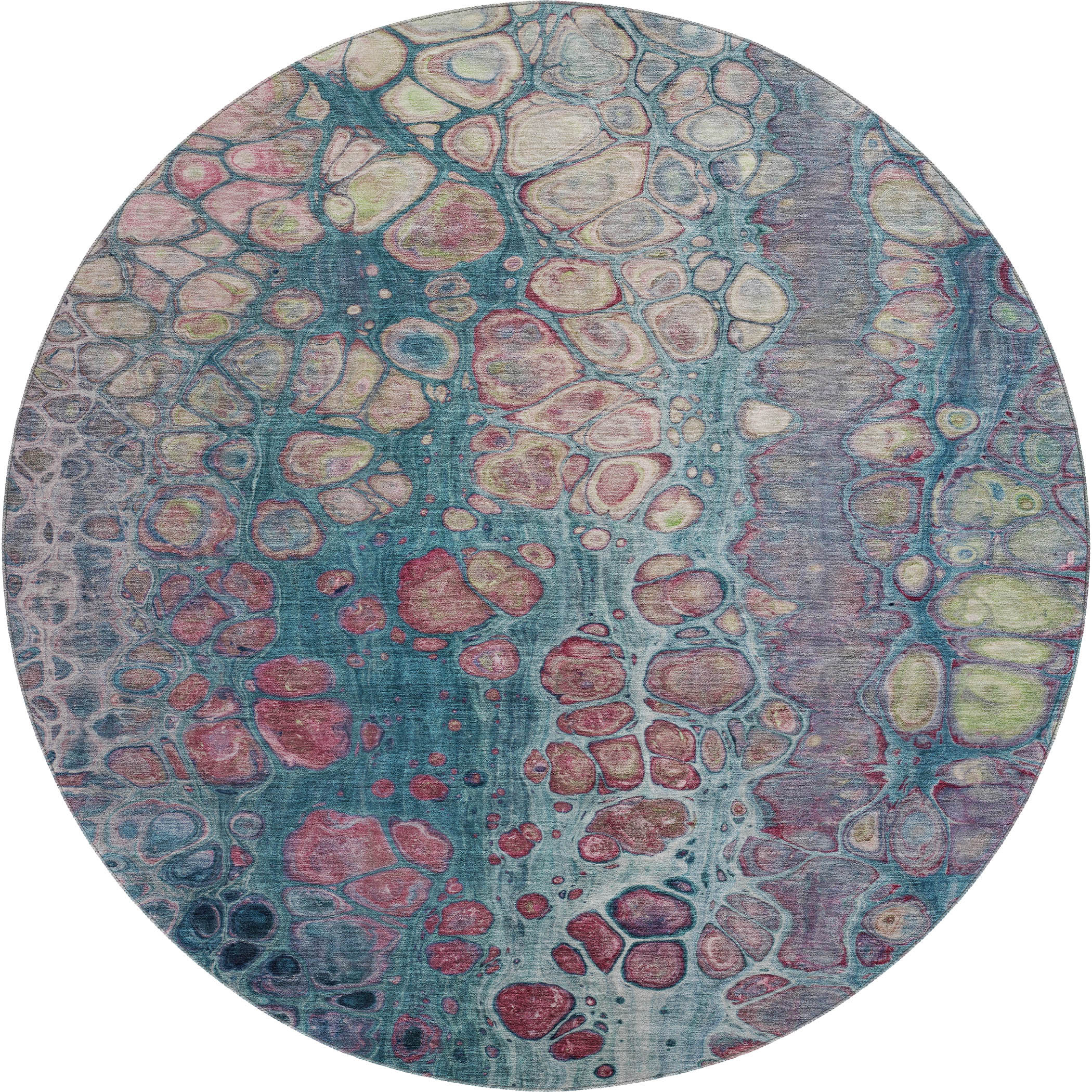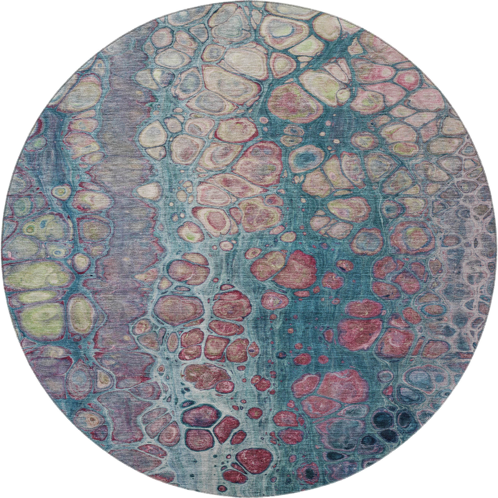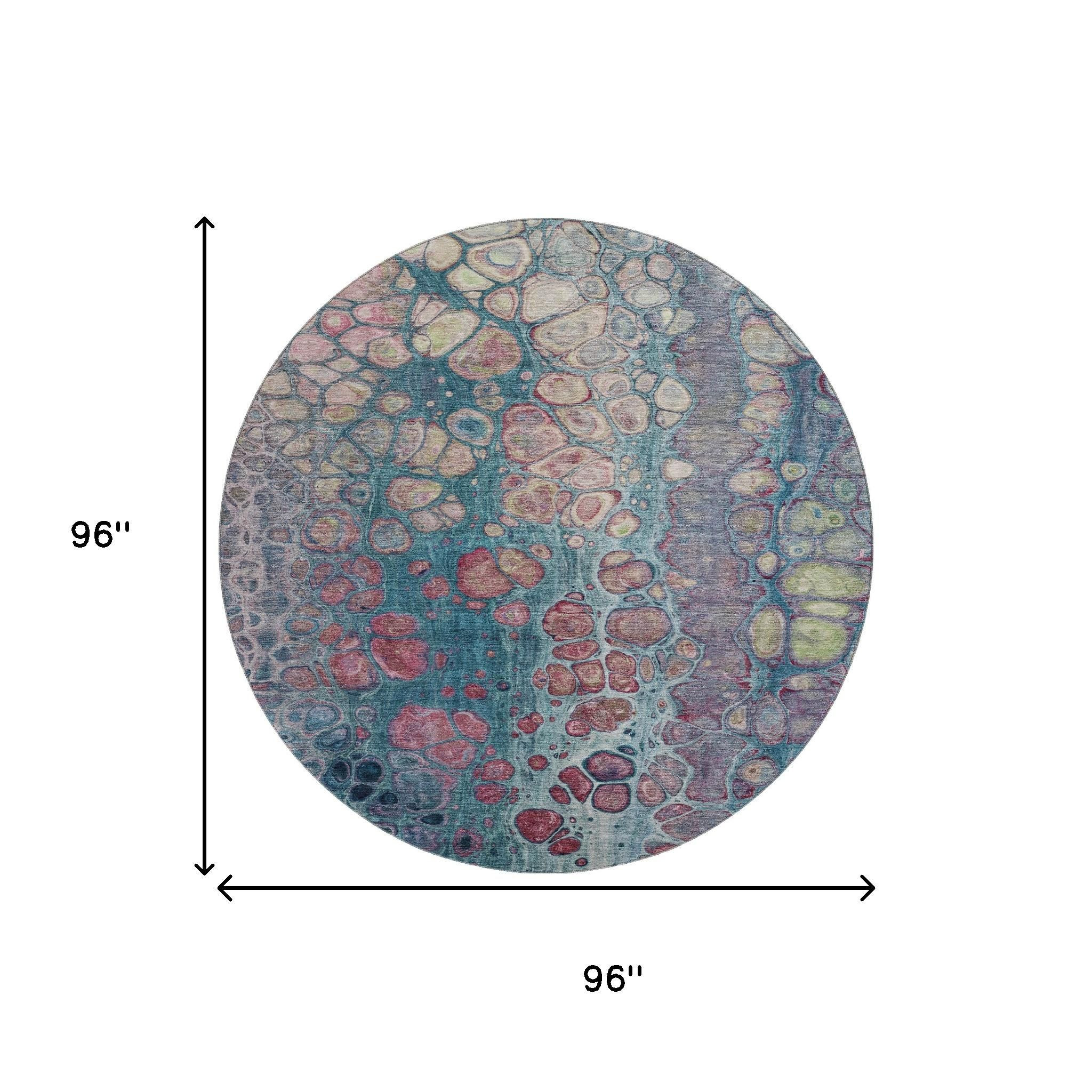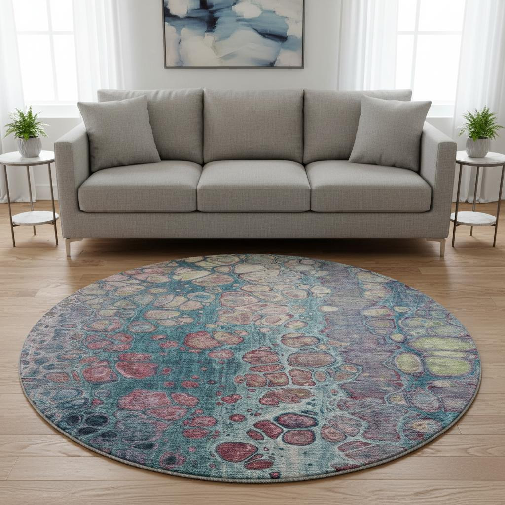 Set an inviting tone in your space with this 8-foot teal plum and beige abstract washable round rug with uv protection. Ideal for spaces with kids and pets, this rug is stain resistant to help repel dirt and spilled liquids. Built to last, this rug crafted from polyester fibers is known for its durability and long lasting appeal. Rugs are a great way to showcase your style, hide imperfections, warm your home and reduce noise. This larger sized, transitional styled rug is ready to create a focal point or statement piece in your room. 96.00-inch h x 96.00-inch w x 0.39-inch d.