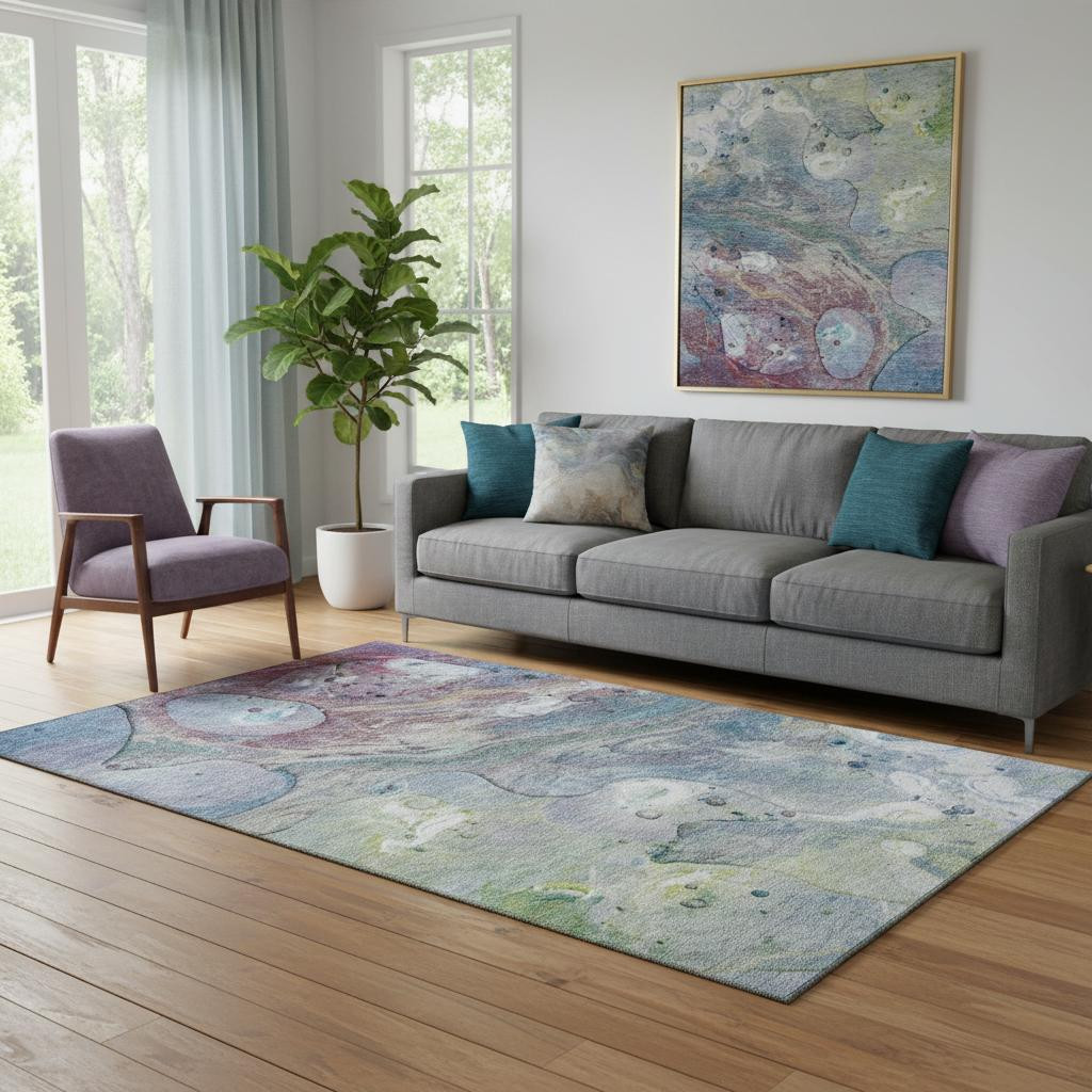 Add great coloration and comfortable texture to your space with this 5-foot x 8-foot blue purple and green abstract washable area rug with uv protection. Ideal for spaces with kids and pets, this rug is stain resistant to help repel dirt and spilled liquids. Built to last, this rug crafted from polyester fibers is known for its durability and long lasting appeal. Rugs are a great way to showcase your style, hide imperfections, warm your home and reduce noise. This larger sized, transitional styled rug is ready to create a focal point or statement piece in your room. 60.00-inch h x 90.00-inch w x 0.39-inch d.