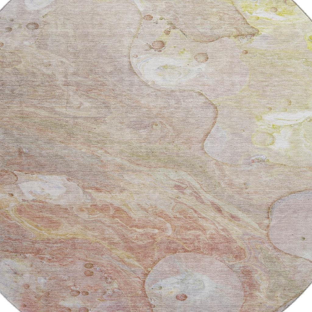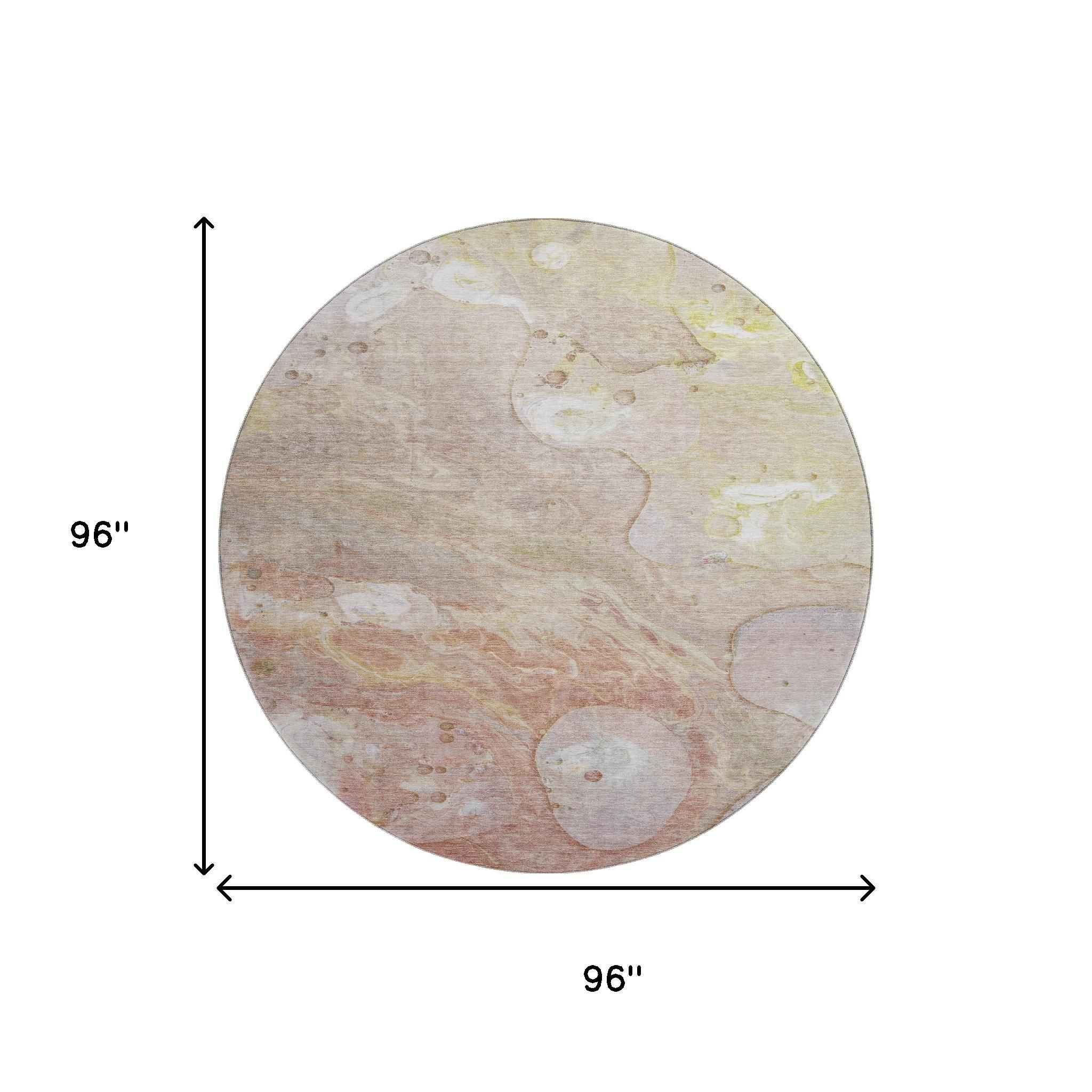 This 8-foot salmon and lavender abstract washable round rug with uv protection, is a great way to add warmth to a room. Ideal for spaces with kids and pets, this rug is stain resistant to help repel dirt and spilled liquids. Built to last, this rug crafted from polyester fibers is known for its durability and long lasting appeal. Rugs are a great way to showcase your style, hide imperfections, warm your home and reduce noise. This larger sized, transitional styled rug is ready to create a focal point or statement piece in your room. 96.00-inch h x 96.00-inch w x 0.39-inch d.