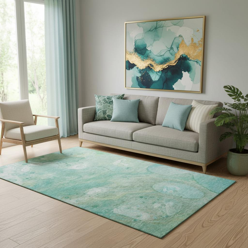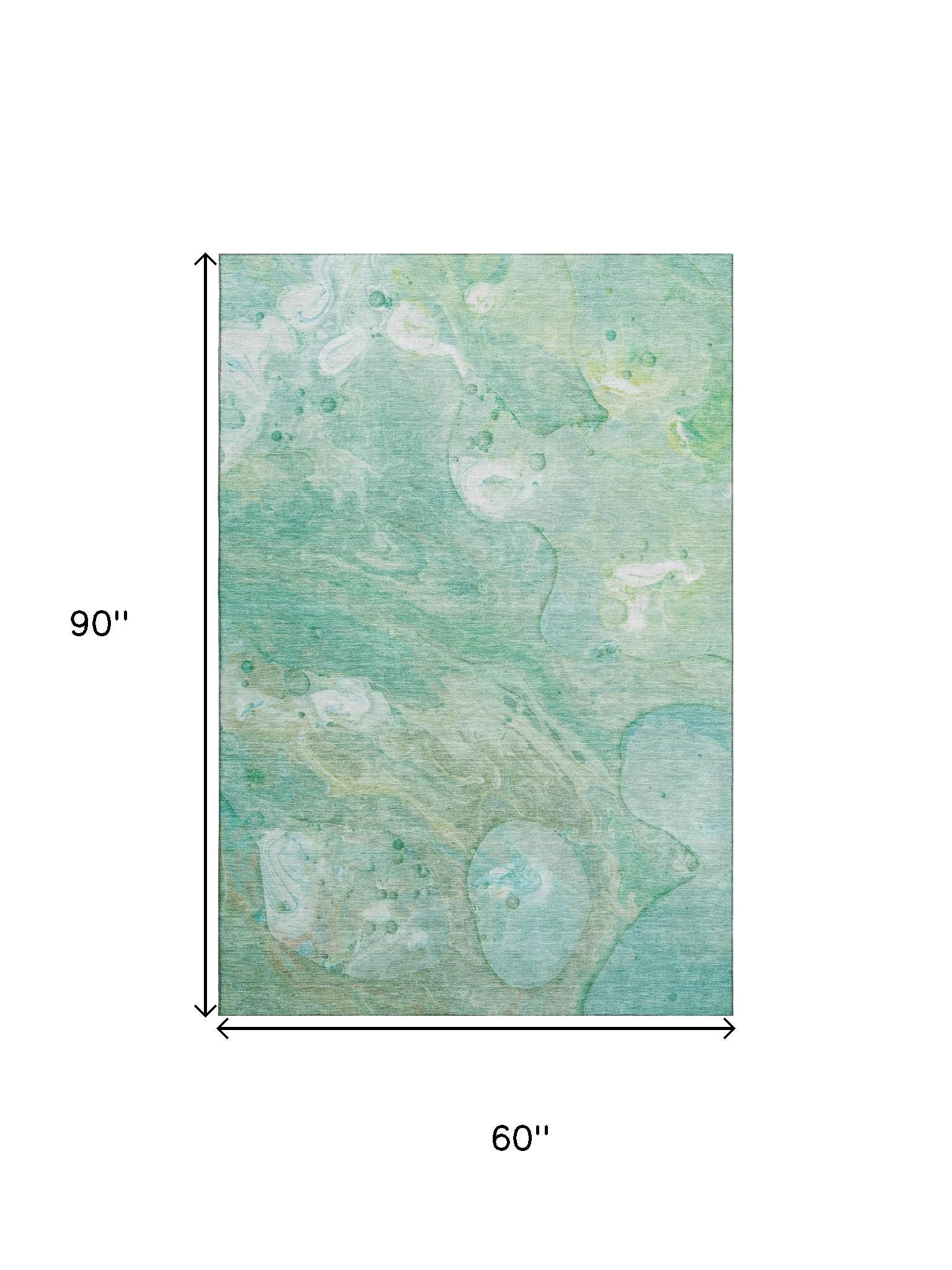 Add some artistry to your room with this 5-foot x 8-foot teal and ivory abstract washable area rug with uv protection. Ideal for spaces with kids and pets, this rug is stain resistant to help repel dirt and spilled liquids. Built to last, this rug crafted from polyester fibers is known for its durability and long lasting appeal. Rugs are a great way to showcase your style, hide imperfections, warm your home and reduce noise. This larger sized, transitional styled rug is ready to create a focal point or statement piece in your room. 60.00-inch h x 90.00-inch w x 0.39-inch d.