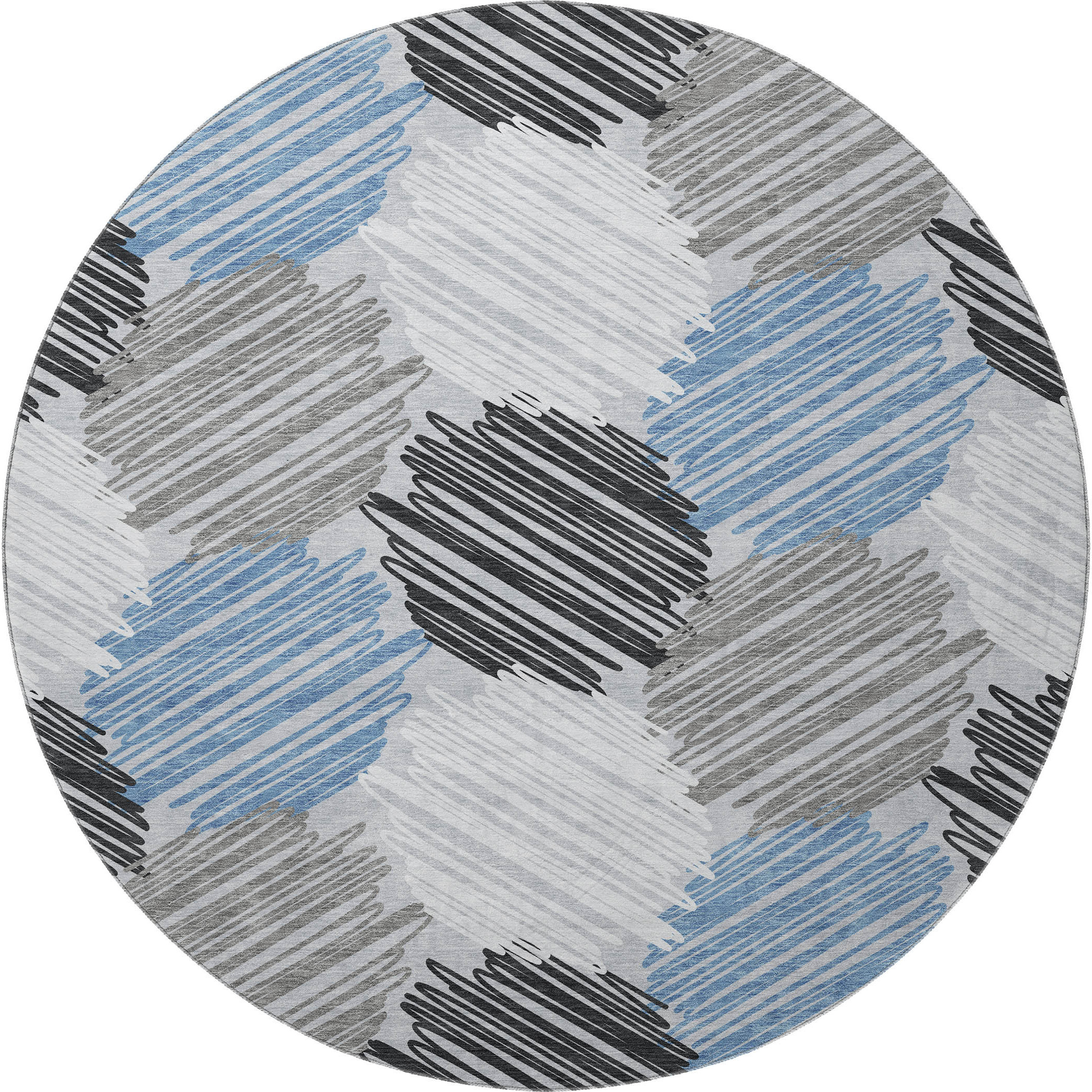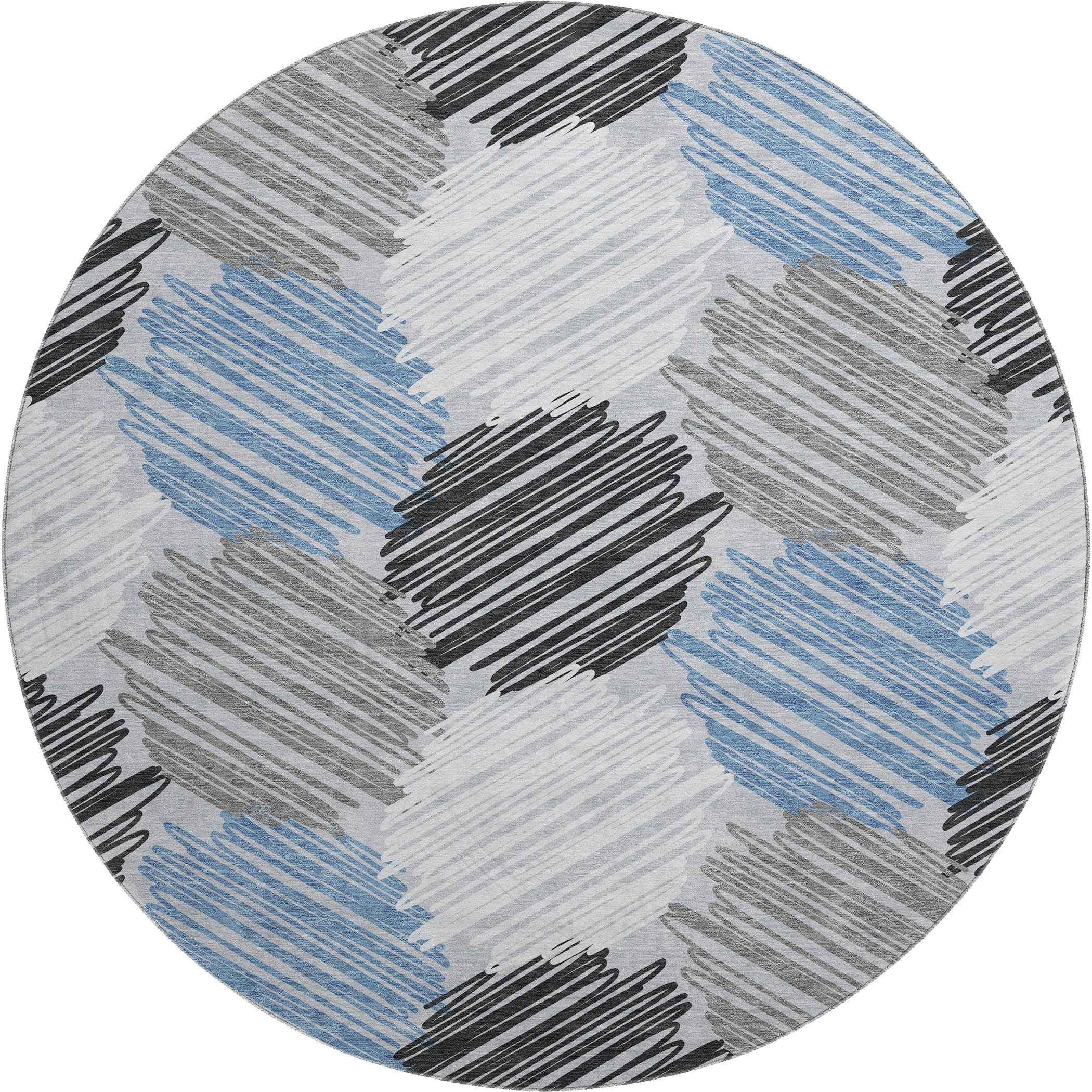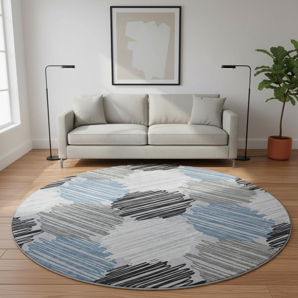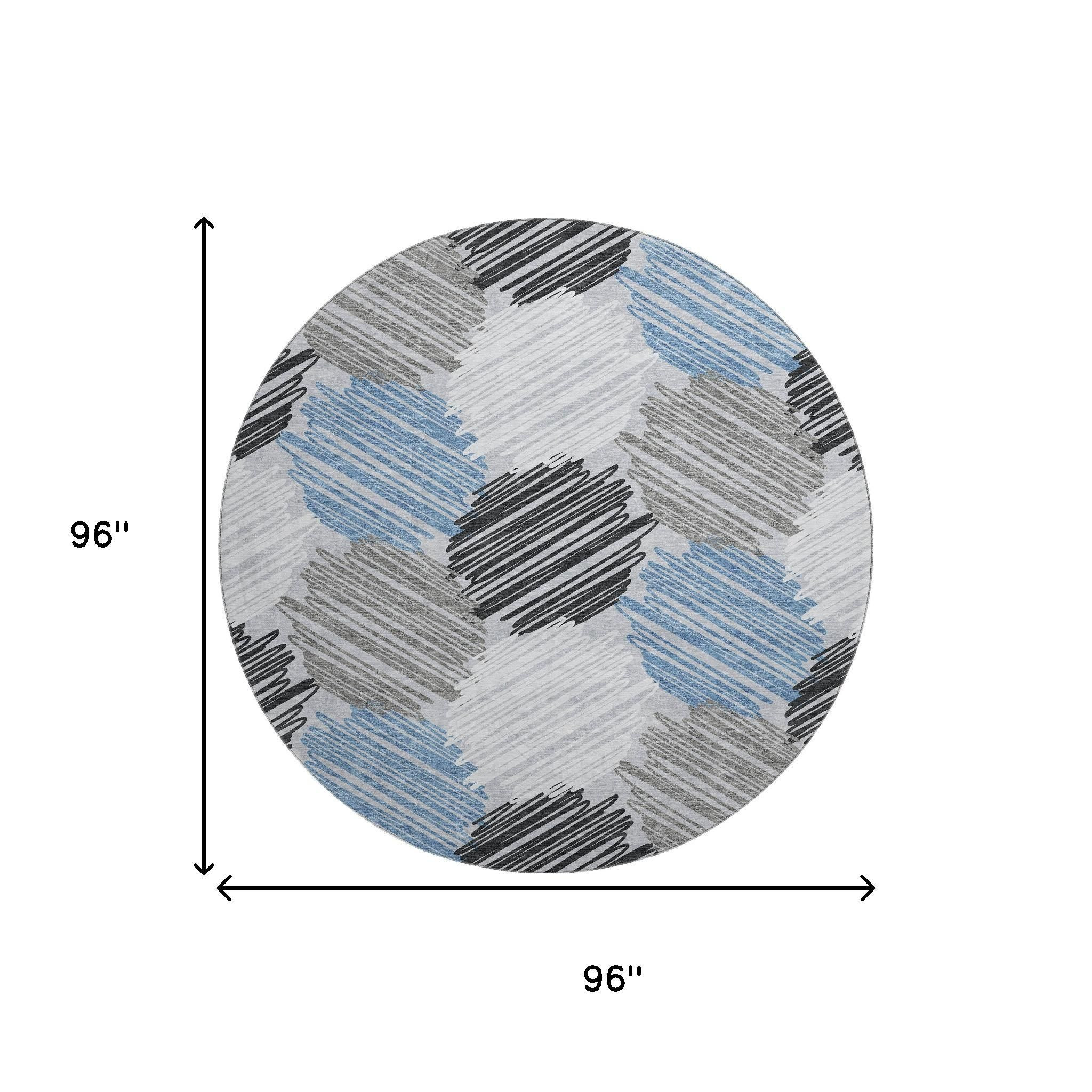 Set an inviting tone in your space with this 8-foot blue ivory and gray geometric washable round rug with uv protection. Ideal for spaces with kids and pets, this rug is stain resistant to help repel dirt and spilled liquids. Built to last, this rug crafted from polyester fibers is known for its durability and long lasting appeal. Rugs are a great way to showcase your style, hide imperfections, warm your home and reduce noise. This larger sized, transitional styled rug is ready to create a focal point or statement piece in your room. 96.00-inch h x 96.00-inch w x 0.39-inch d.