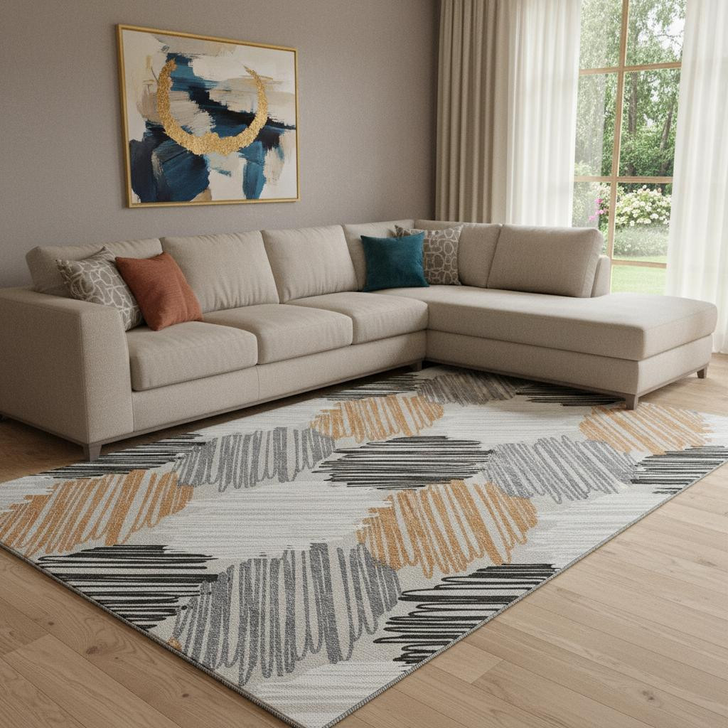 This 8-foot x 10-foot copper ivory and gray geometric washable area rug with uv protection, is a great way to add warmth to a room. Ideal for spaces with kids and pets, this rug is stain resistant to help repel dirt and spilled liquids. Built to last, this rug crafted from polyester fibers is known for its durability and long lasting appeal. Rugs are a great way to showcase your style, hide imperfections, warm your home and reduce noise. This larger sized, transitional styled rug is ready to create a focal point or statement piece in your room. 96.00-inch h x 120.00-inch w x 0.39-inch d.